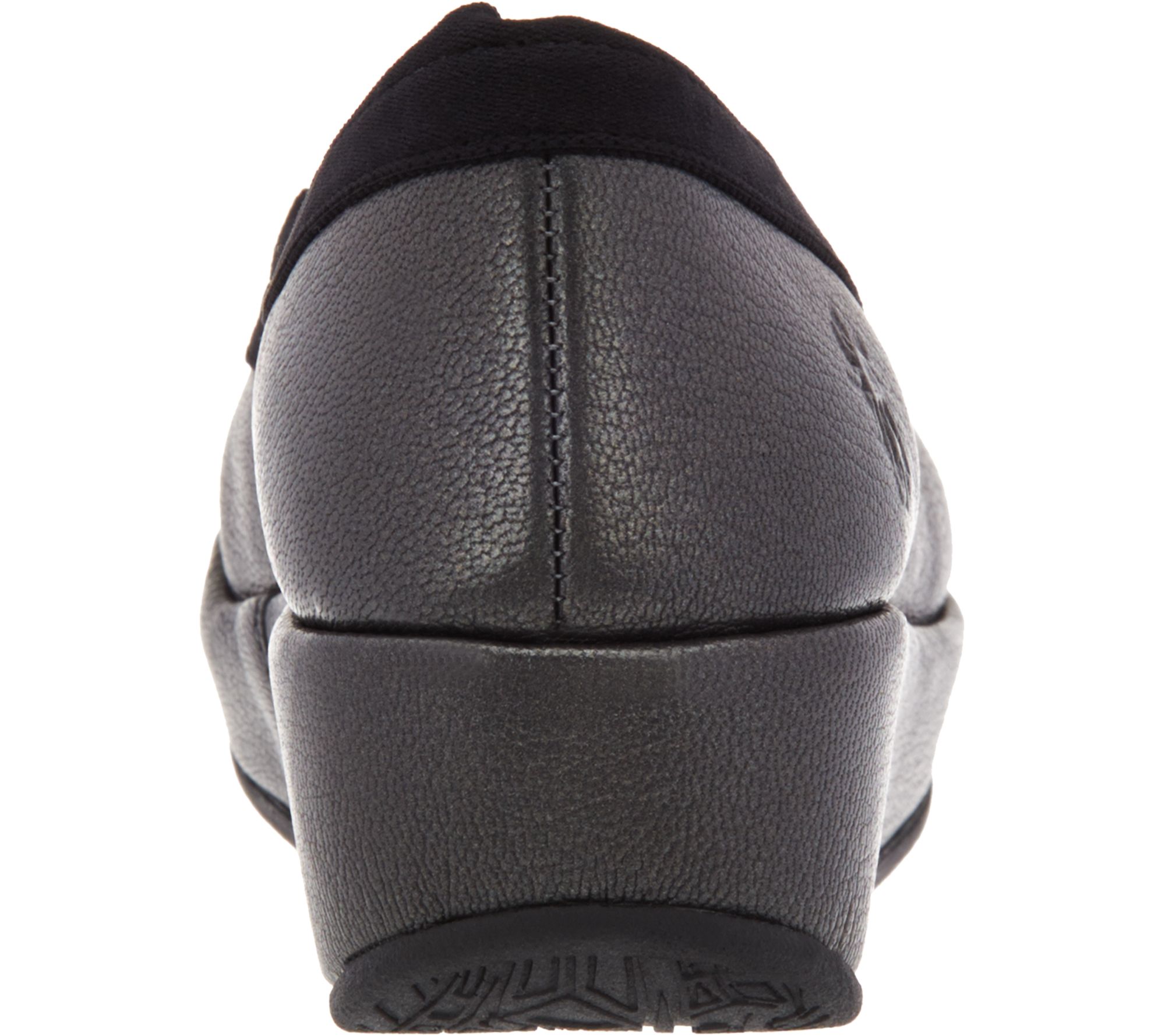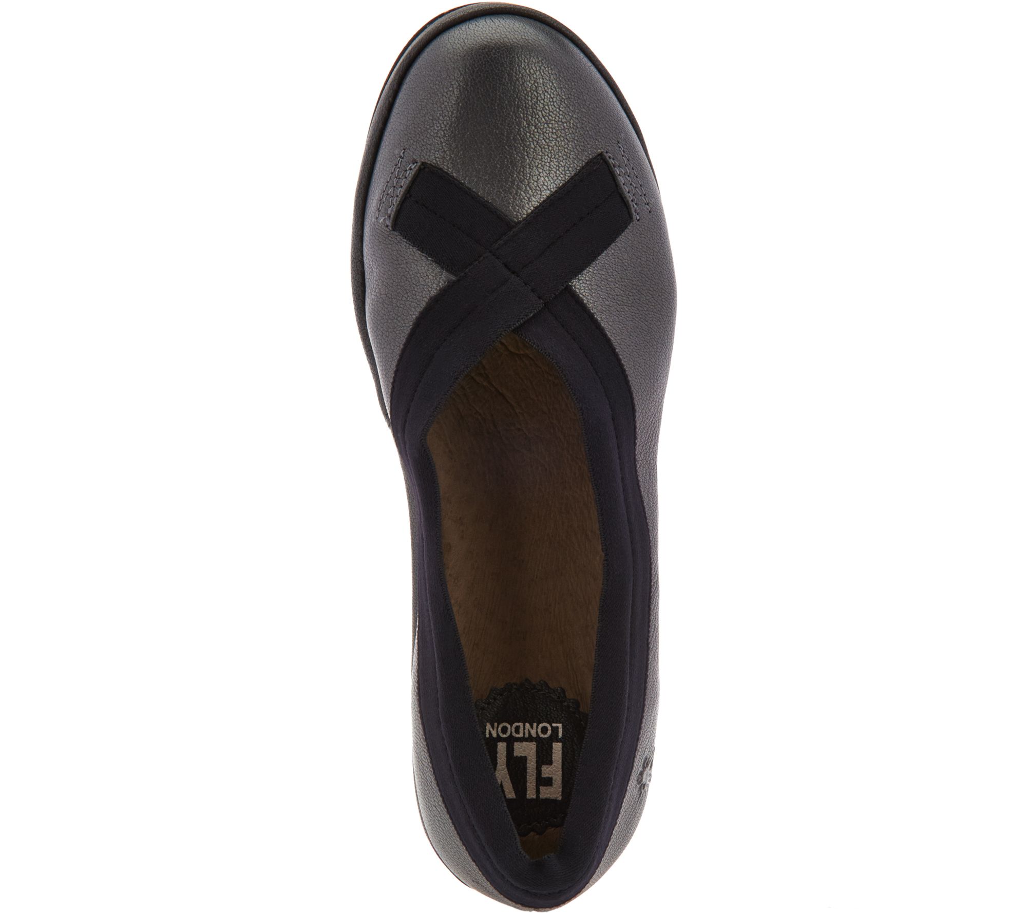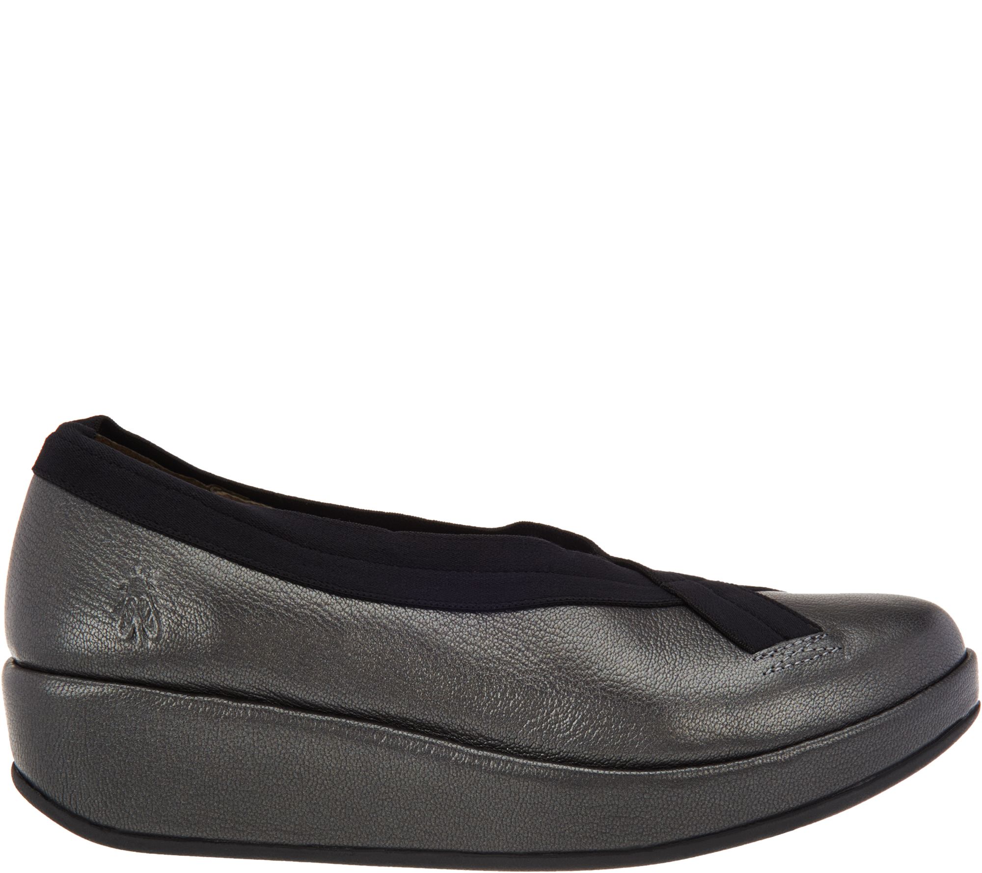 Smooth operator. Cute and comfy, these Fly London leather slip-on shoes will take you anywhere you need to go. The elastic trim along the upper makes a comfortable and stylish addition, while the self-covered wedge heel adds that little lift. From FLY London.