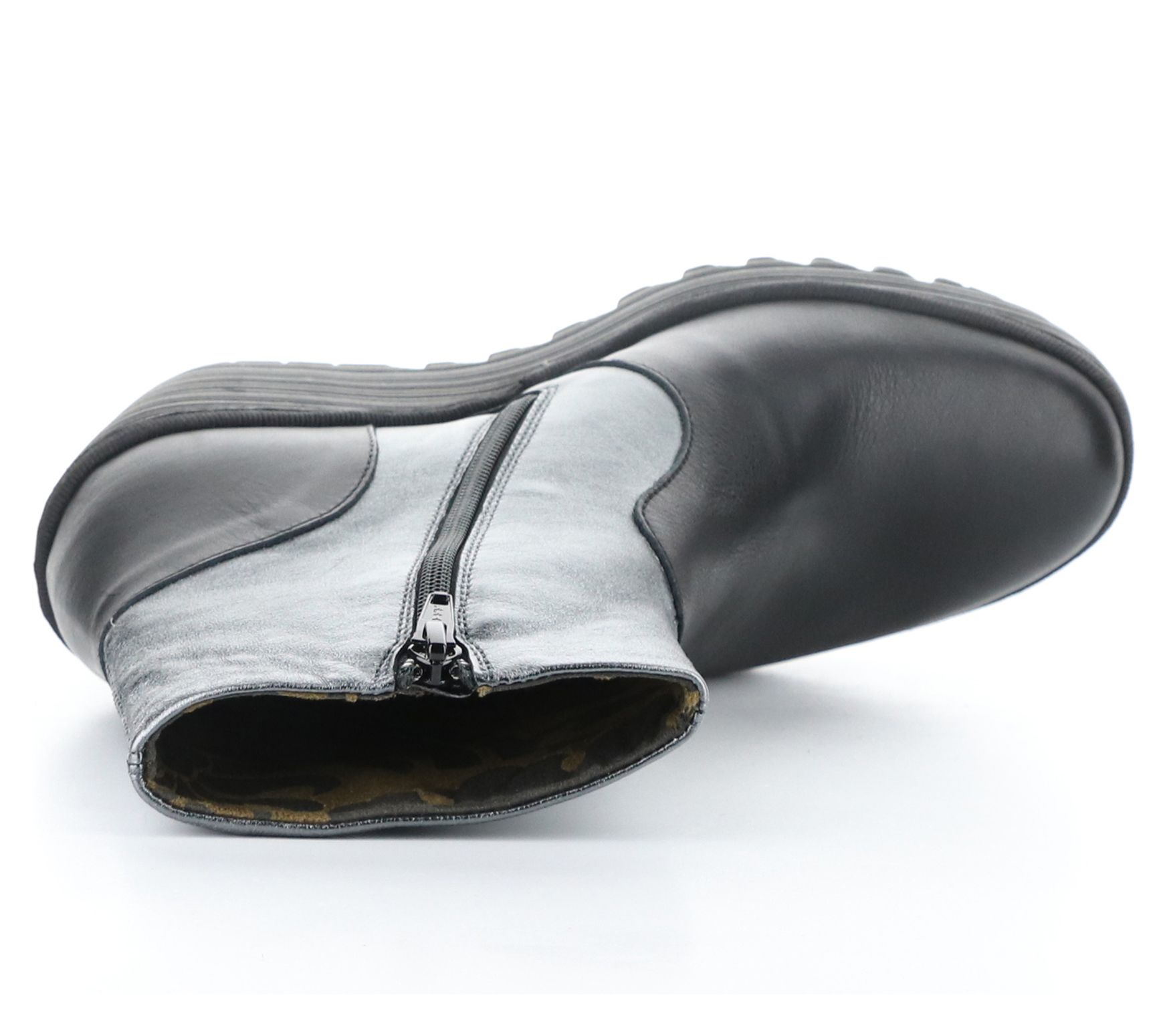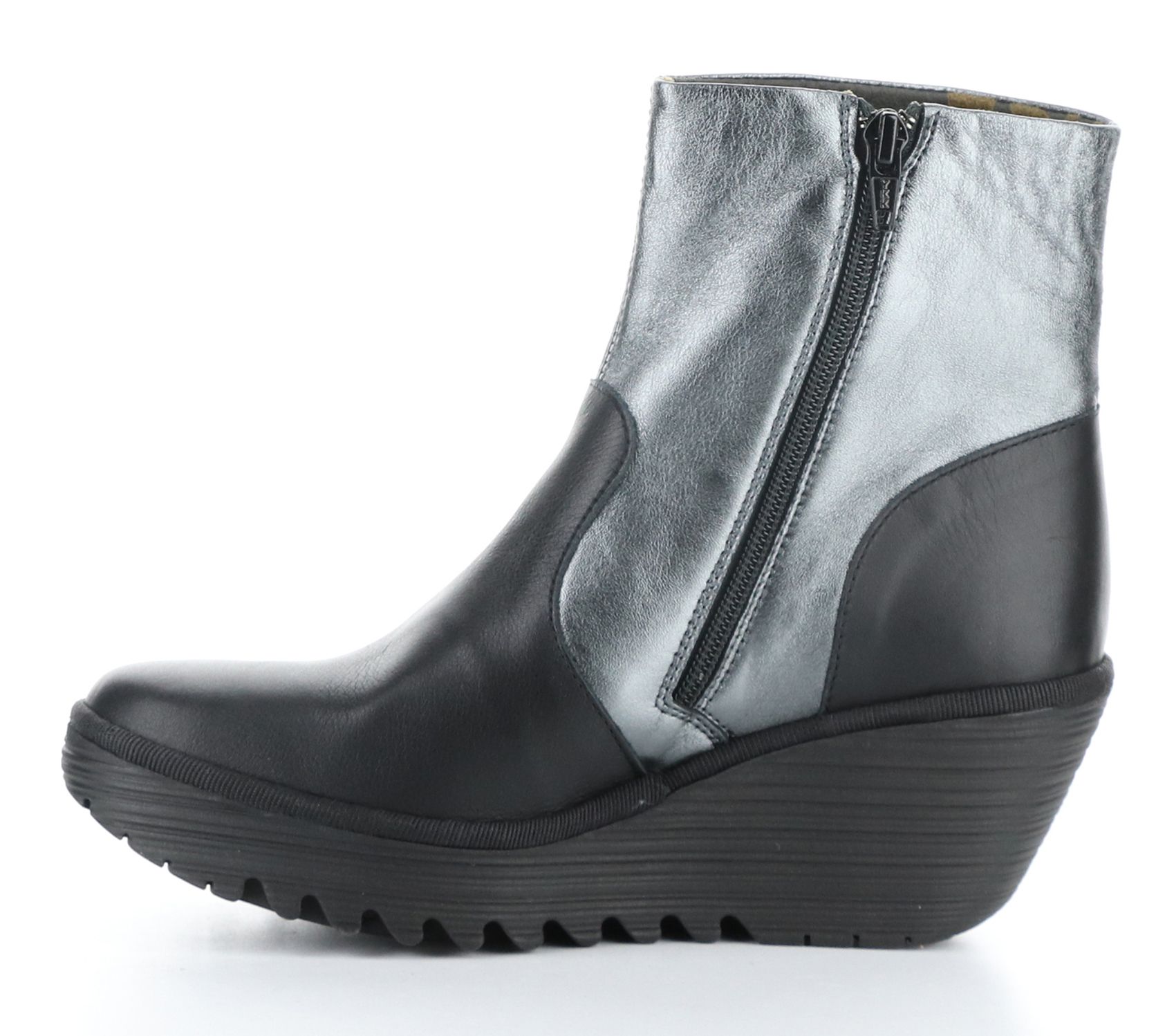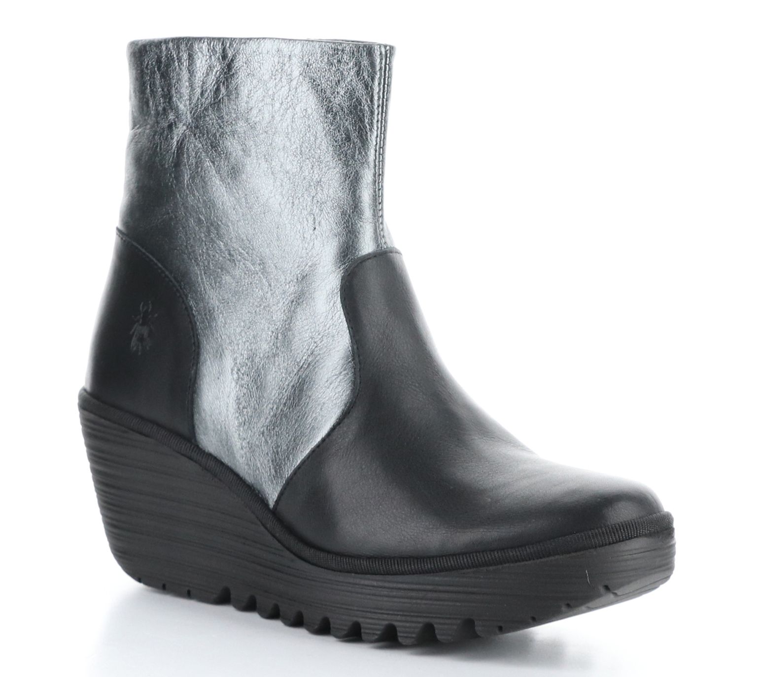 Add a touch of metallic flair to your fall and winter wardrobe with the Fly London Yuxi wedge boots. They feature a comfortable rounded toe shape and a convenient side zipper for easy on and off. Perfect for pairing with your favorite jeans or skirts. From Fly London.