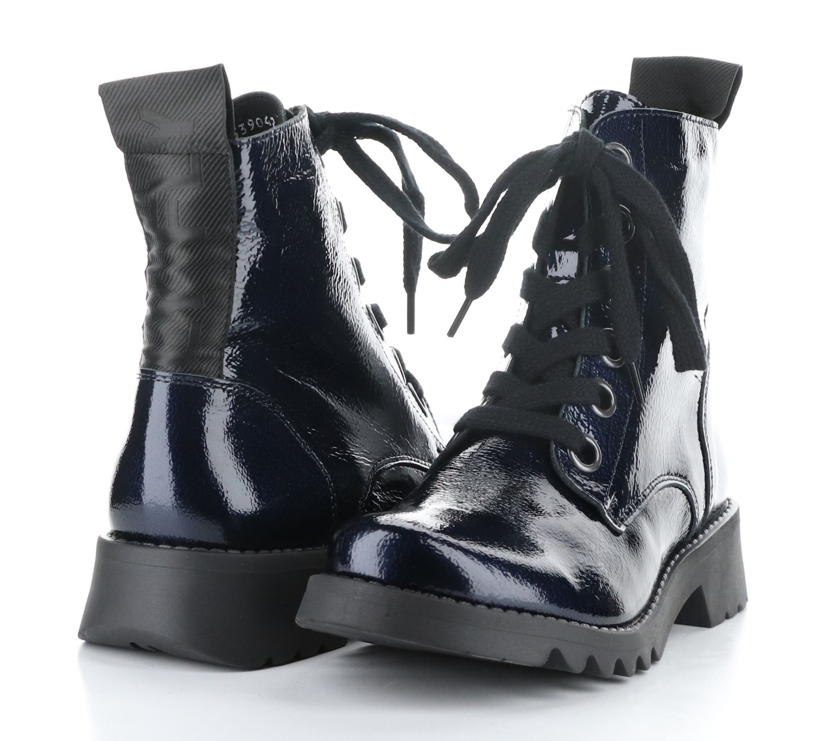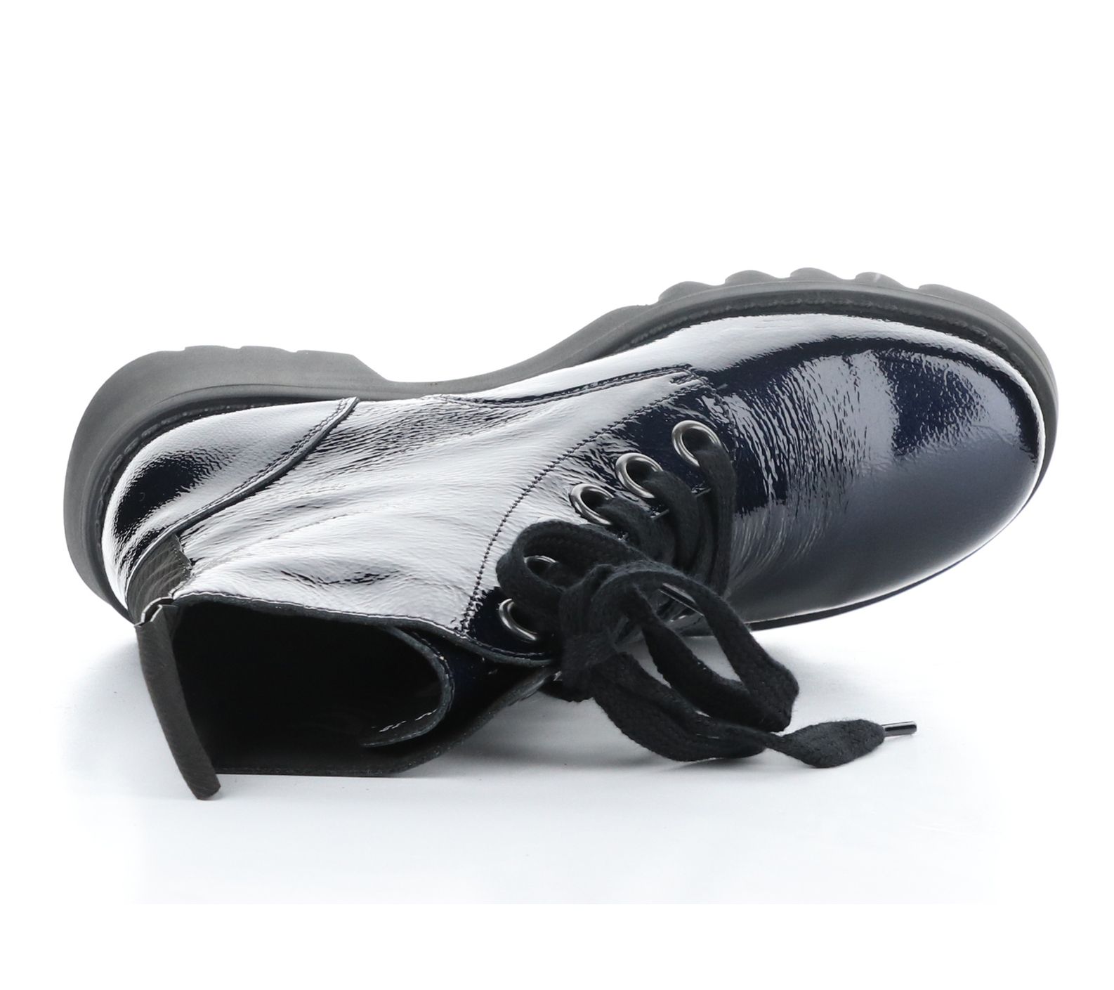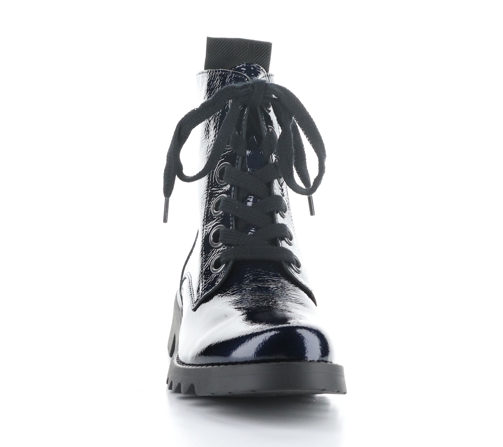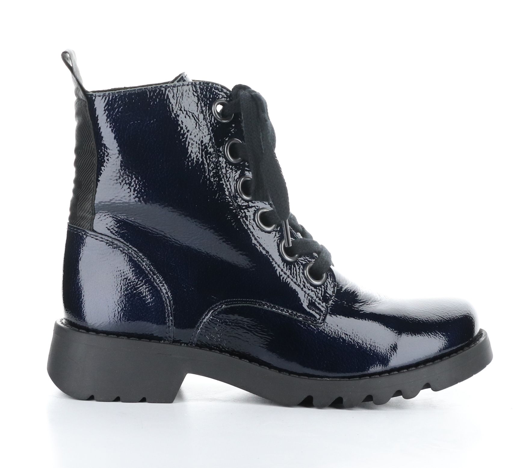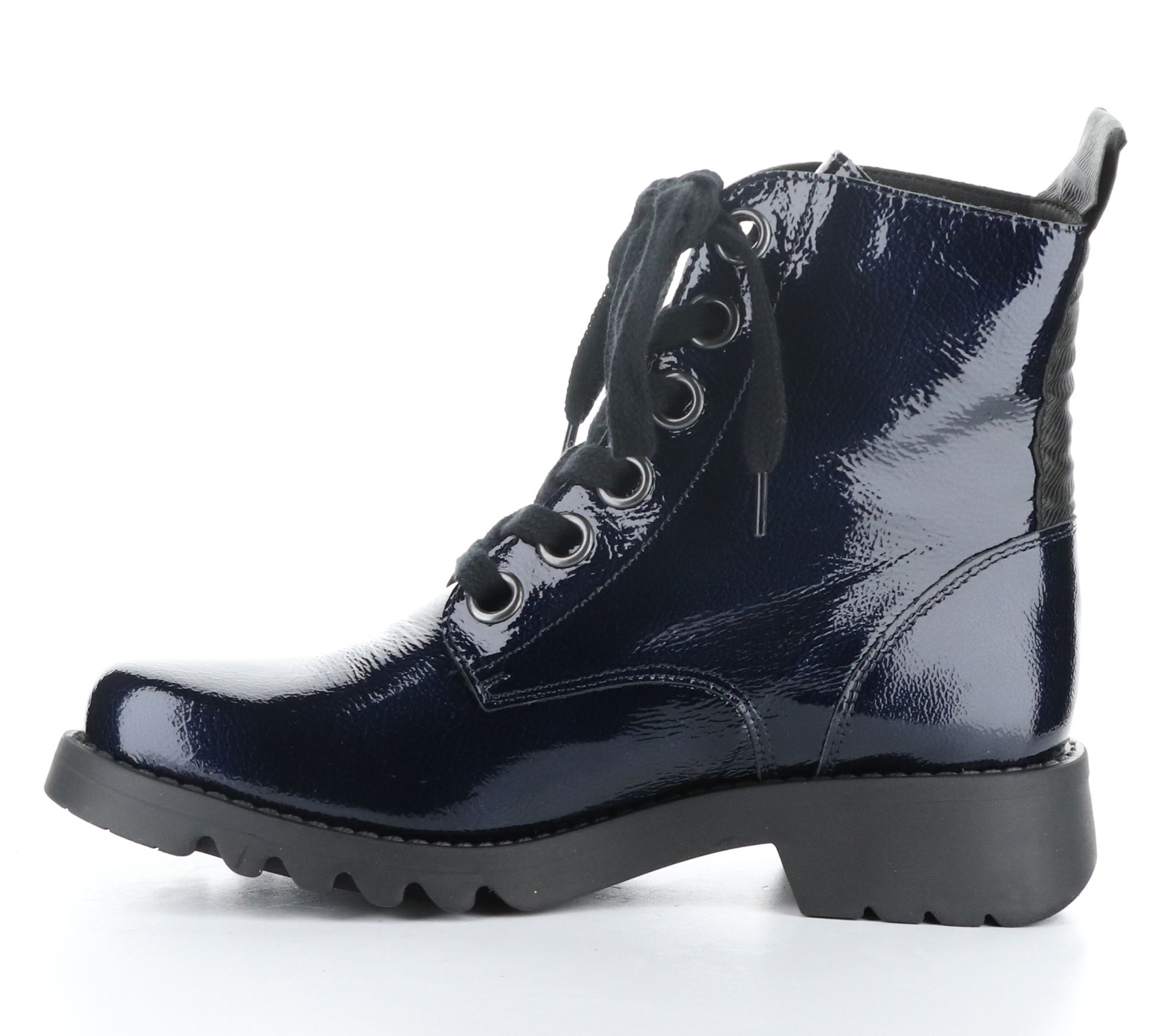 Lace-up style with oversized eyelets, rounded toe, combat style, back ribbon detail