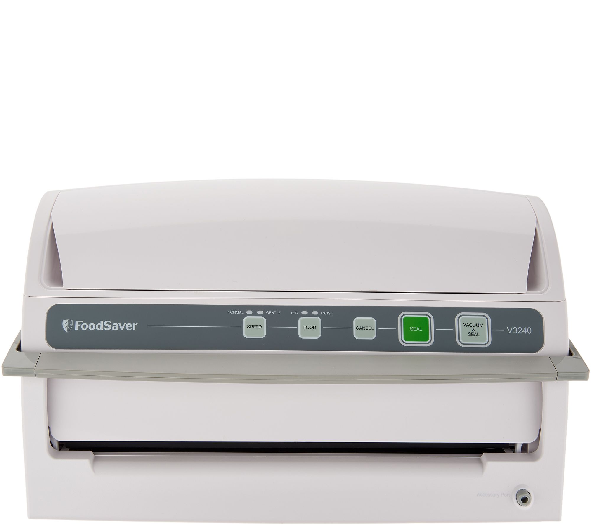 • Includes FoodSaver V3240 vacuum, three 1-qt zipper bags, two 1-gallon zipper bags, FoodSaver roll, removable drop tray, accessory port, and hose
