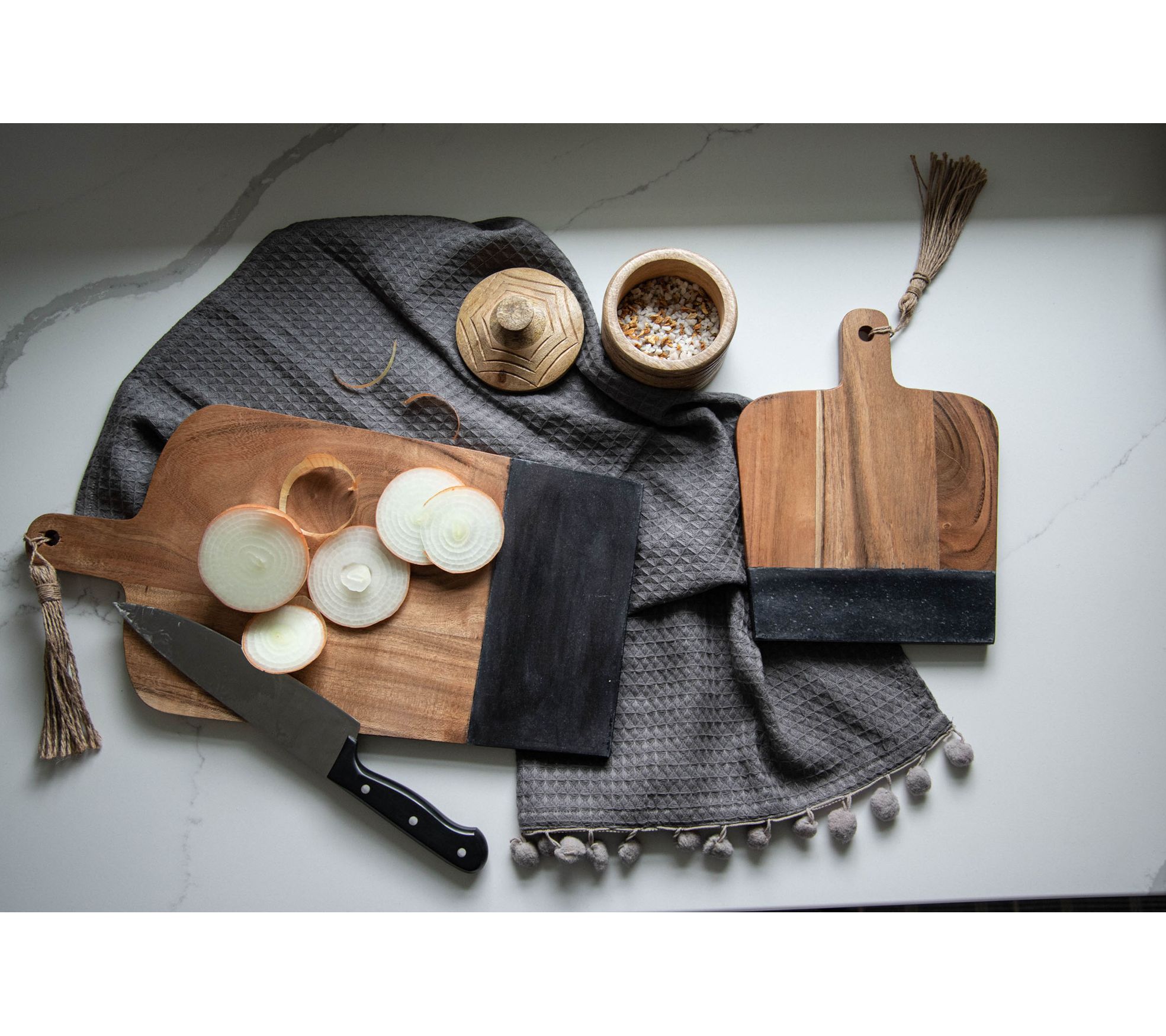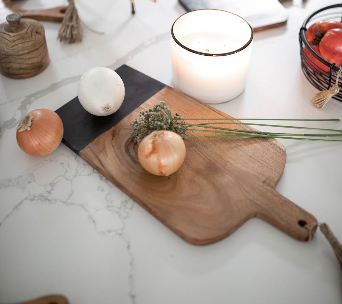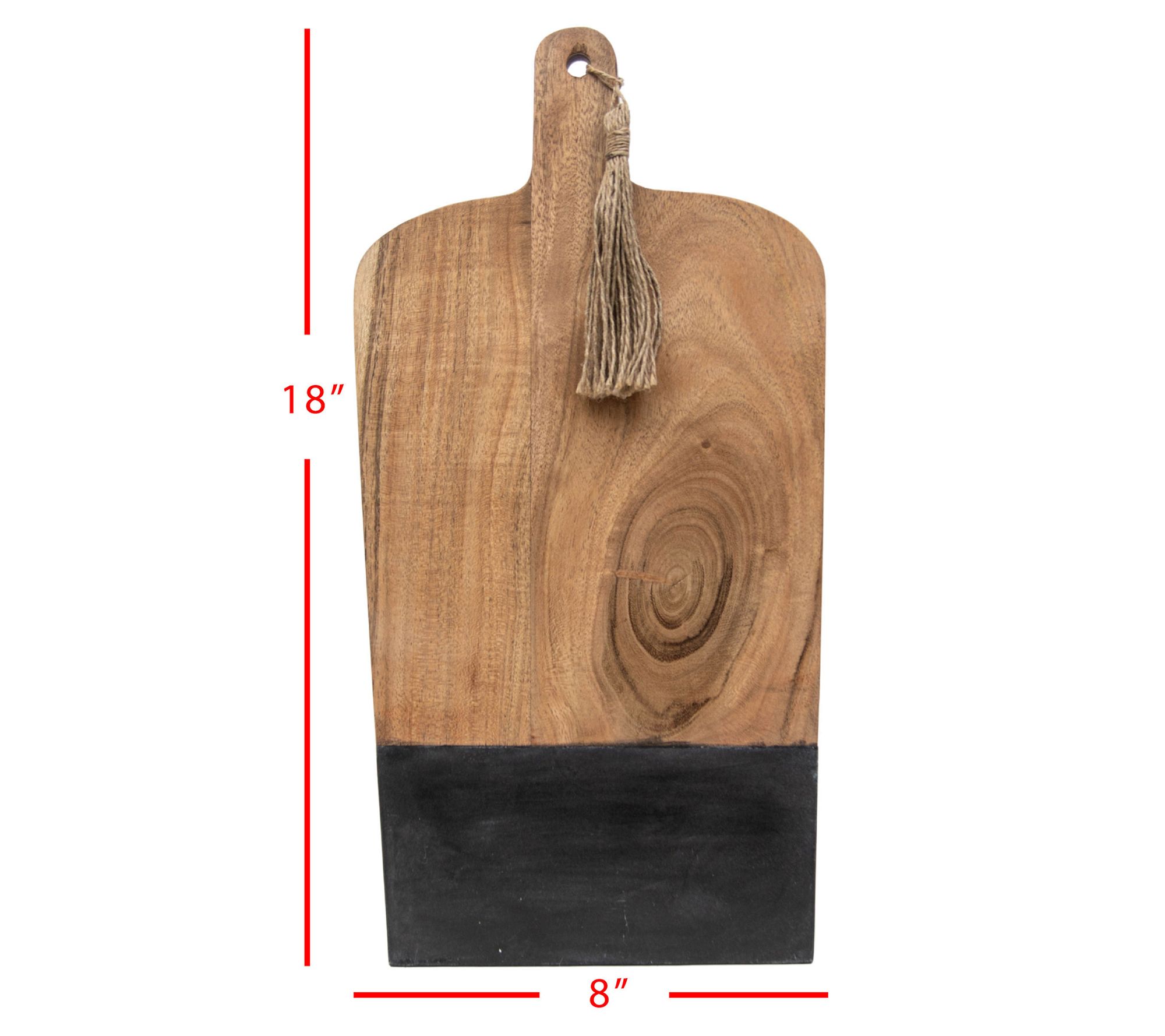 Whether slicing, dicing, chopping, or serving, this attractive cutting board has you covered. It's crafted from durable acacia wood and marble with a tassel tie so you can display this artistically designed piece in your kitchen when not in use. From Foreside Home & Garden.