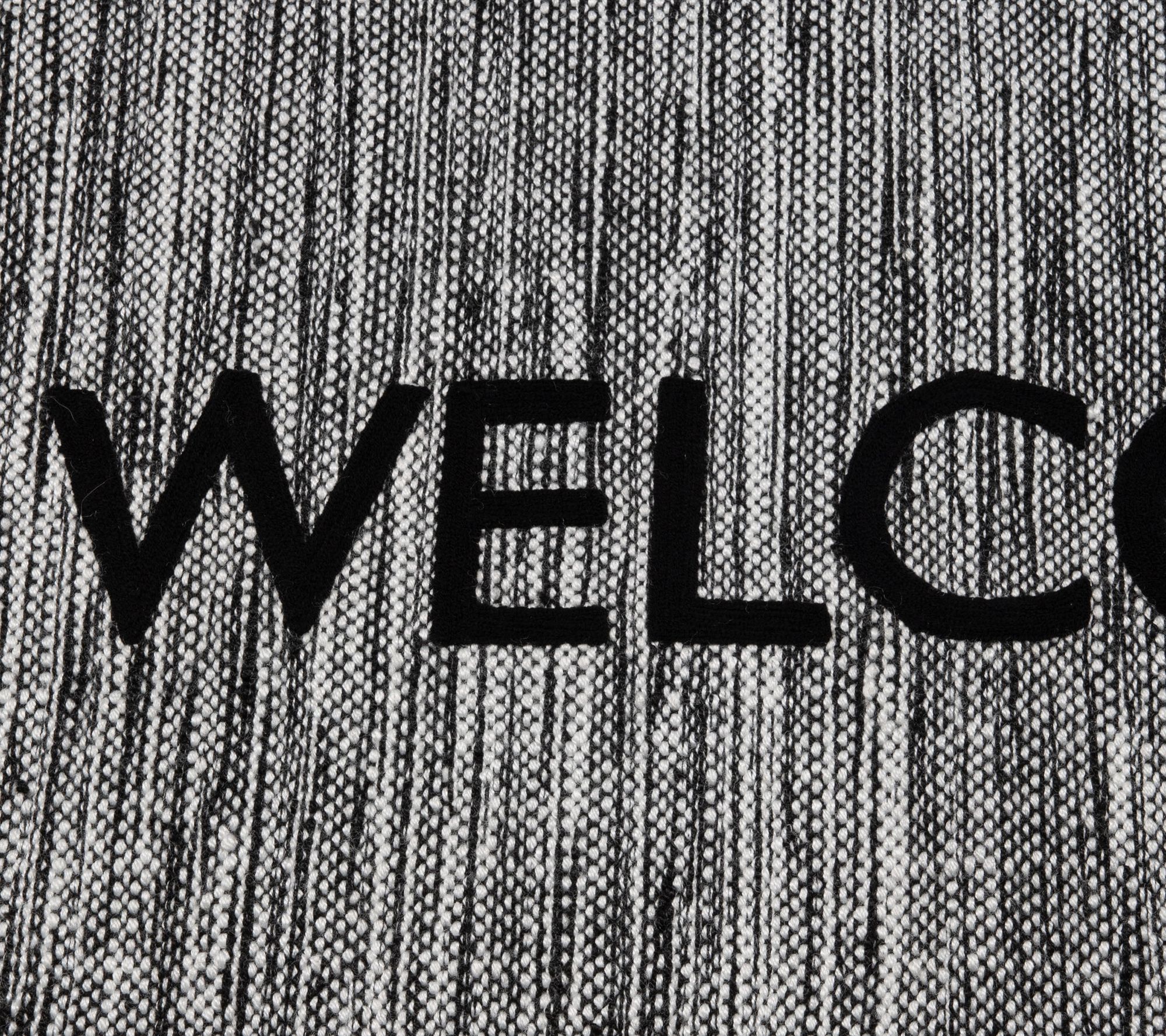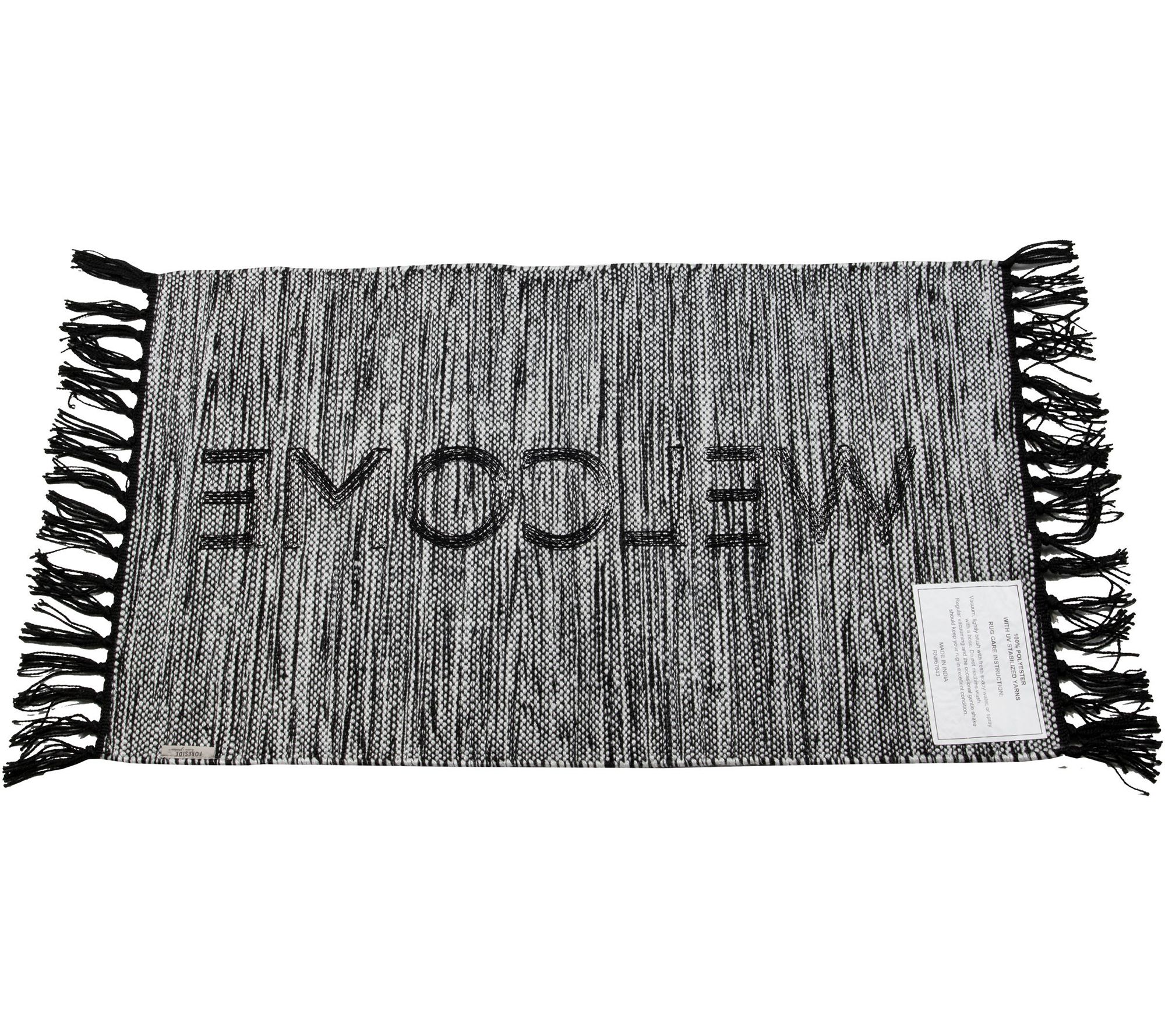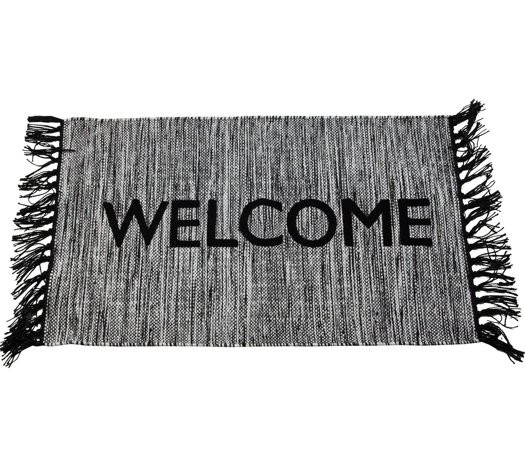 Greet your guests in charming style with this modern "Welcome" rug. Crafted in shades of black and white with contrasting embroidery and tassel trim, it instantly elevates any doorway. From Foreside Home & Garden.