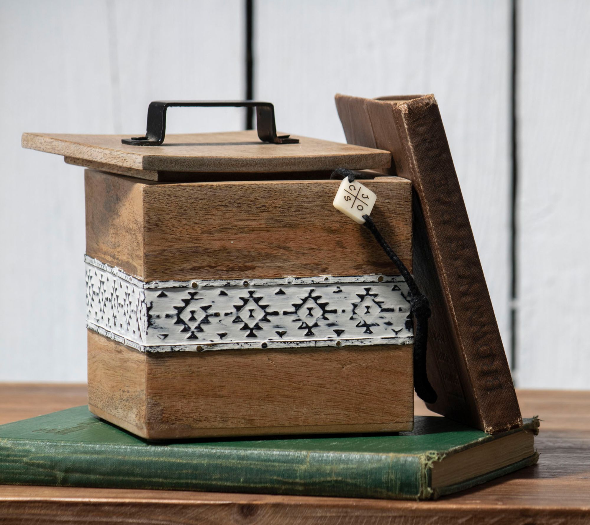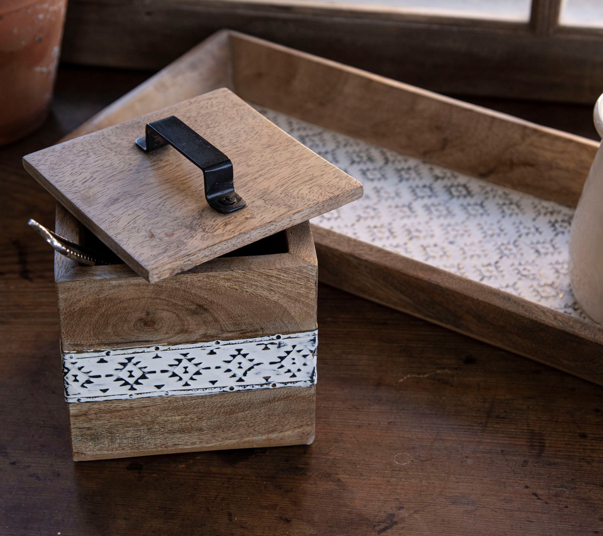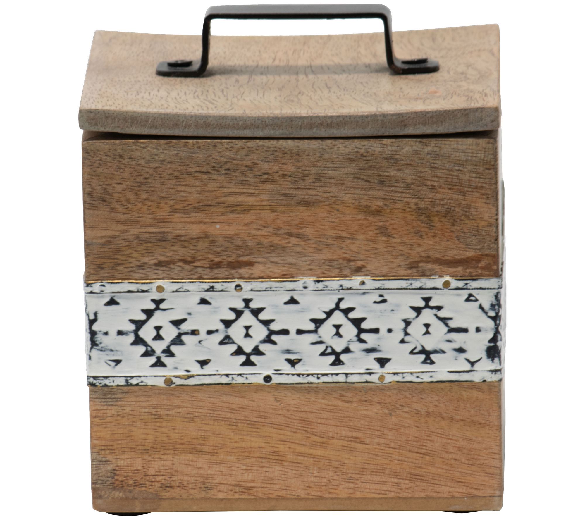 Accent your table or dresser in Southwestern-inspired style with this Amos trinket box. Crafted from rich mango wood with a metal-clad wrap and gold specks, it beautifully holds jewelry or other small items. From Foreside Home & Garden.