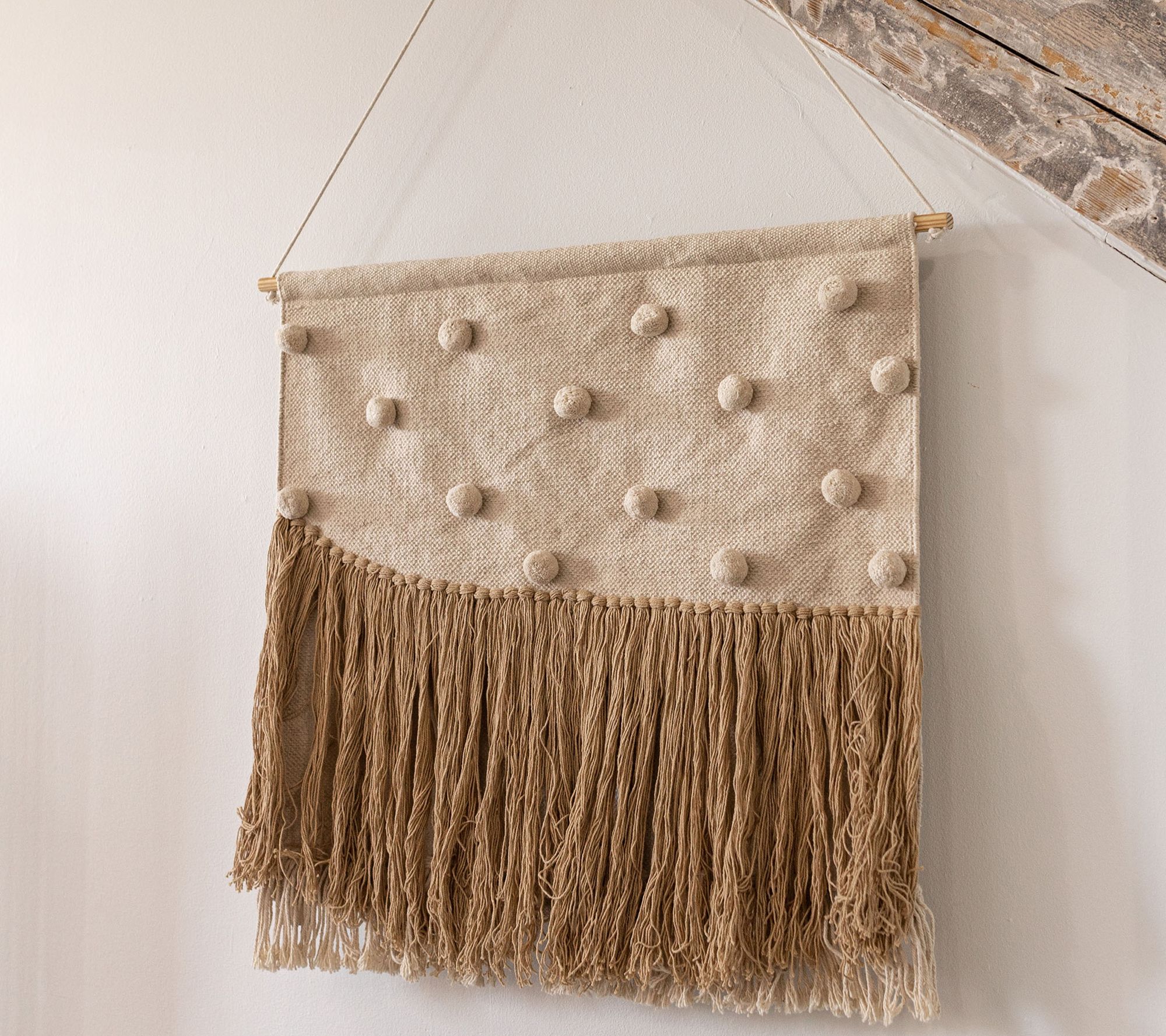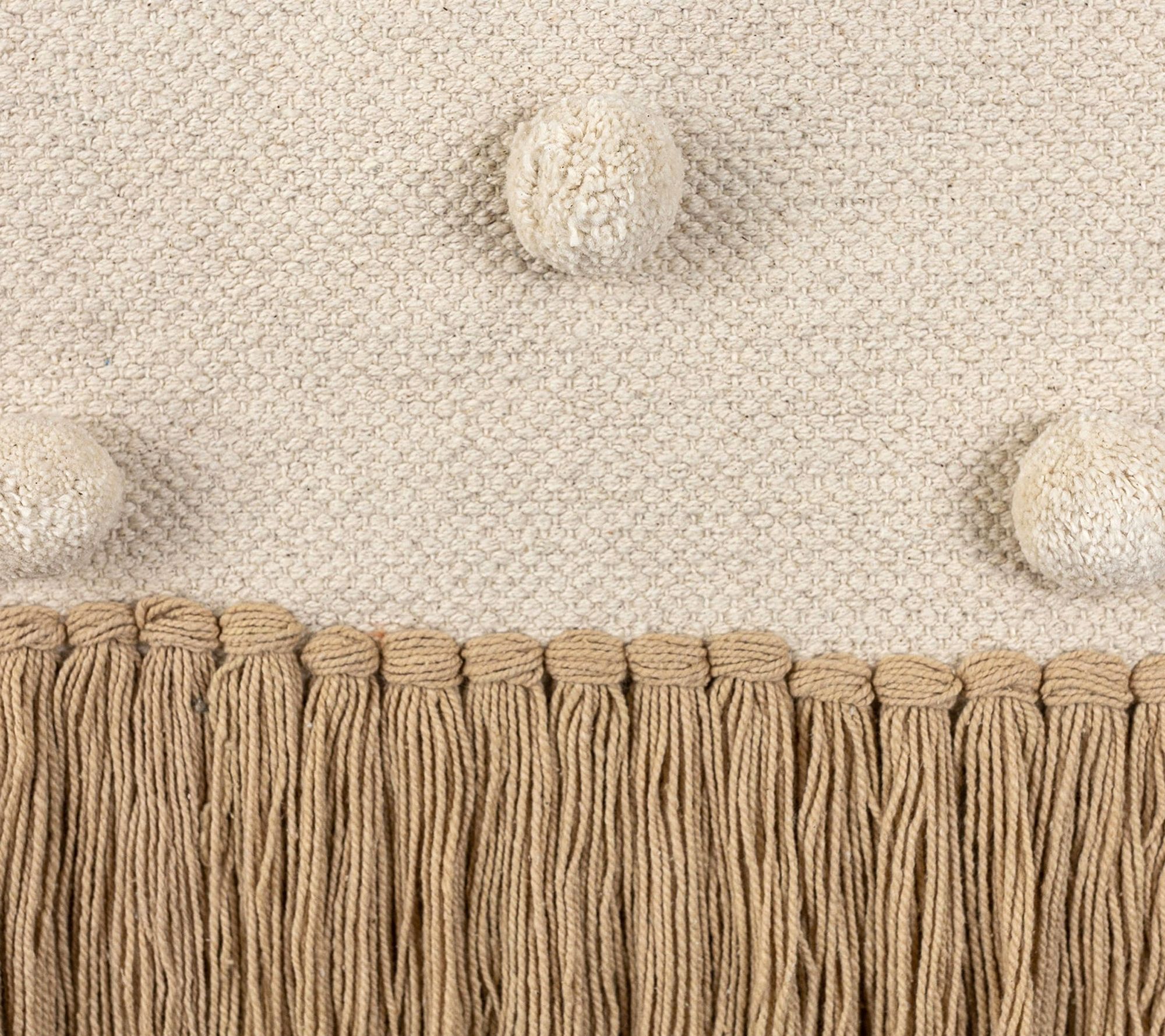 Offering soft, textured style to any space, this thick woven fabric wall hanging is accented with poms and fun fringe. From Foreside Home & Garden.
