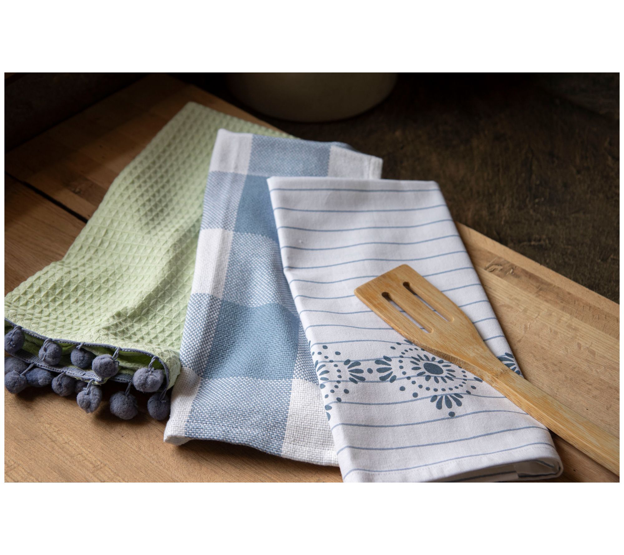 Add a playful splash of charm to your kitchen decor with this cheerful tea towel set. From Foreside Home & Garden.