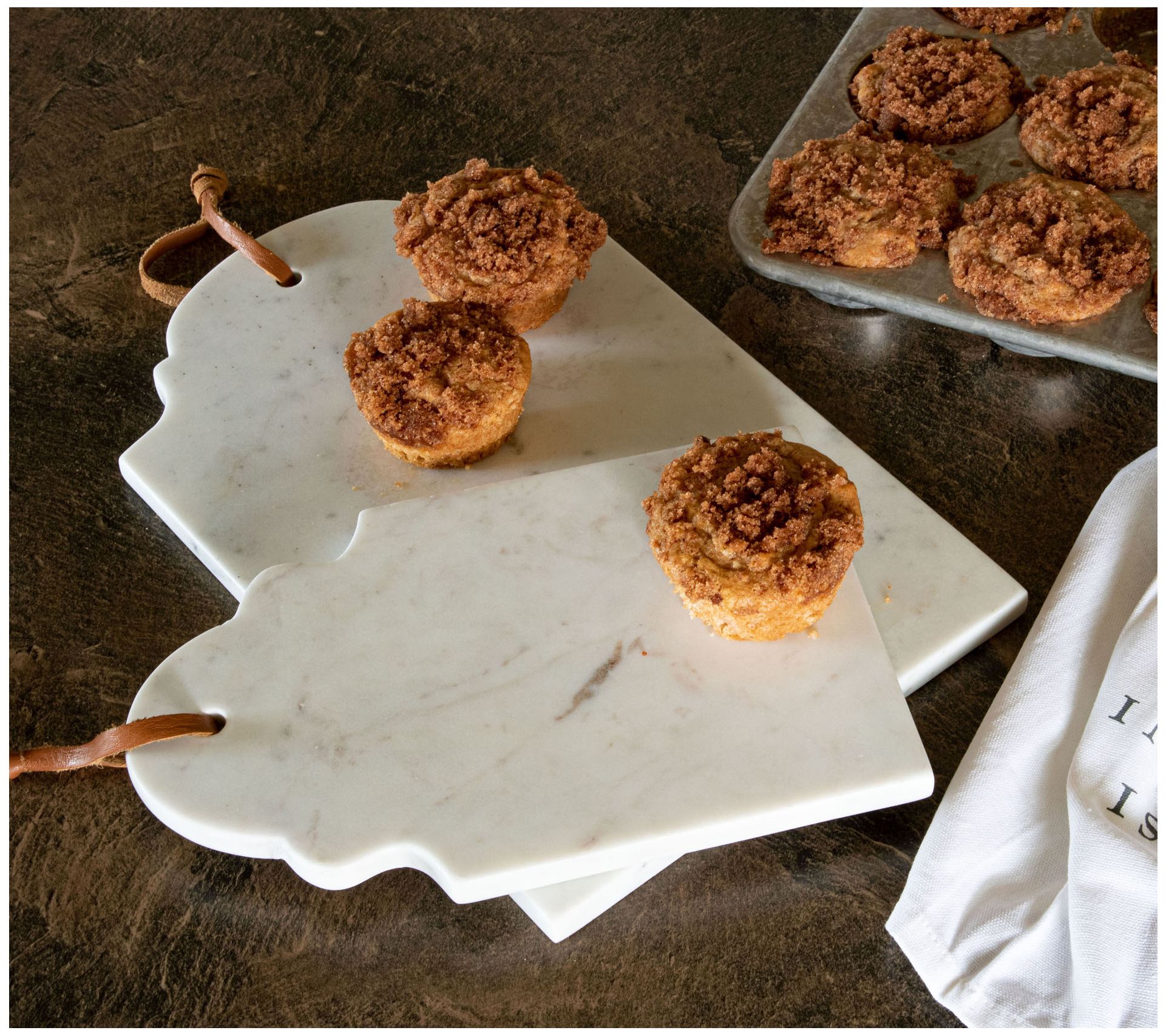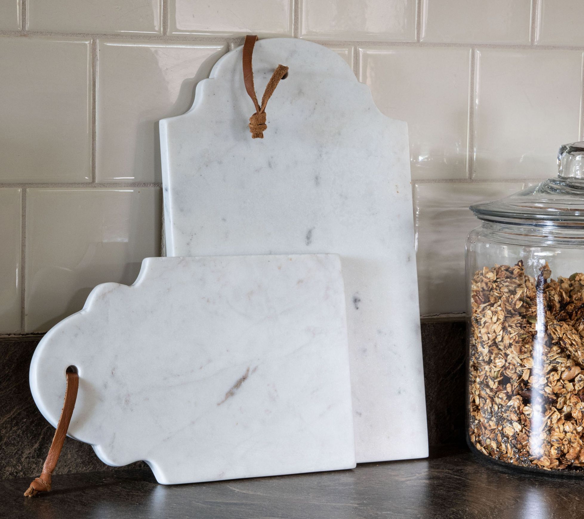 Refine your kitchen collection with this decor-worthy cutting board designed in multifunctional marble with a shapely silhouette that provides plenty of space for prepping and serving. From Foreside Home & Garden.