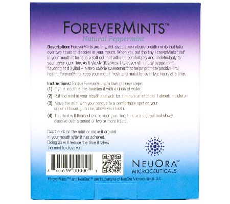 Time to freshen up. Keep your breath fresher longer with these micro-dot peppermint tablets. Stick one between your gum and cheek and let it dissolve slowly over two or more hours while it releases a refreshing mint flavor. Sweetened with xylitol, these breath mints do not promote tooth decay and are low in calories. From Neuora Microceuticals.