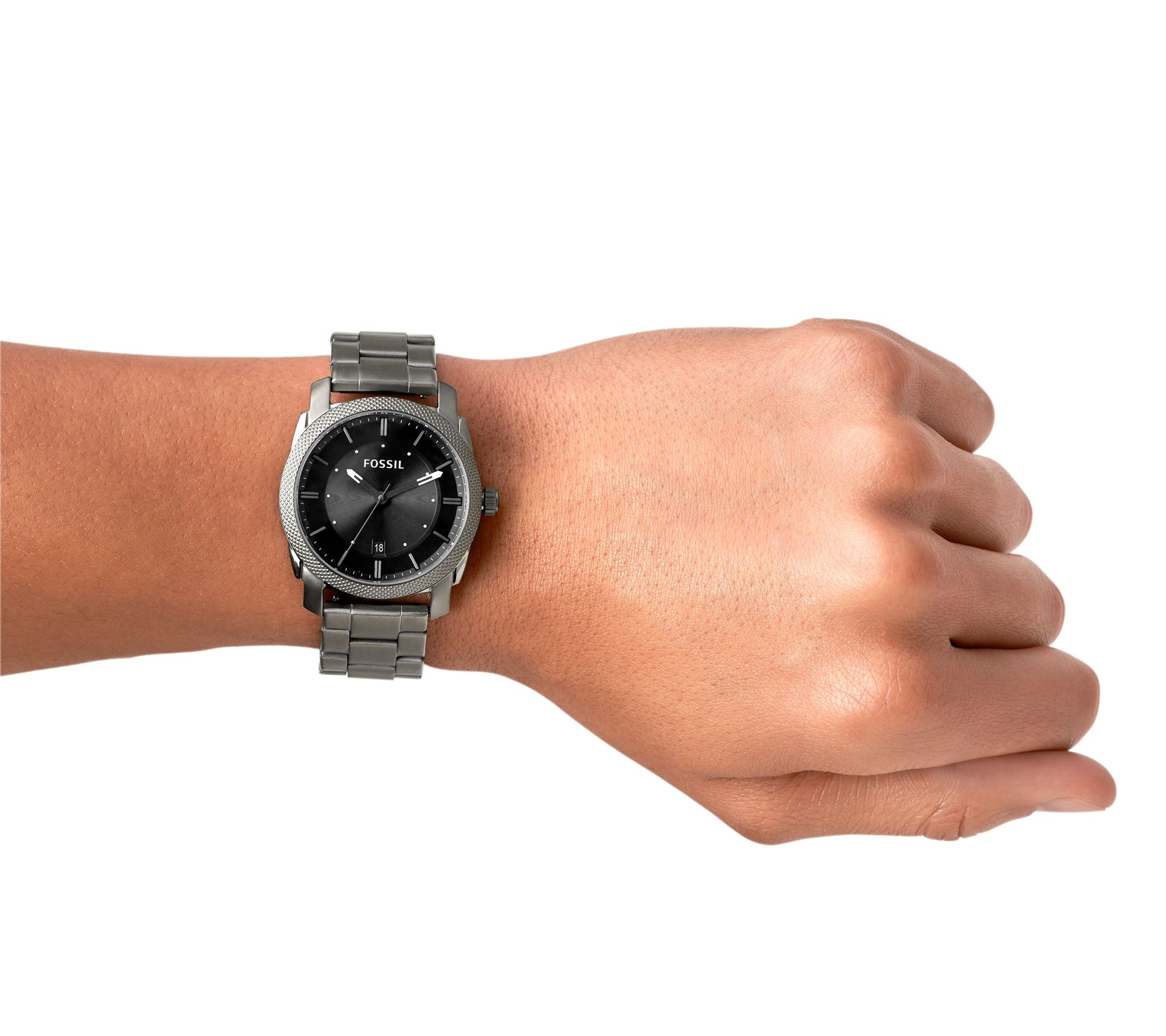 Elevate your style with the Fossil men's machine smoke stainless steel watch. This modern timepiece features a sleek smoke stainless steel bracelet and a striking black dial with white hour markers and hands. The day of the month window adds functionality, making it perfect for daily wear. From Fossil.
