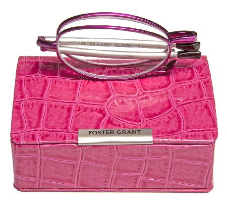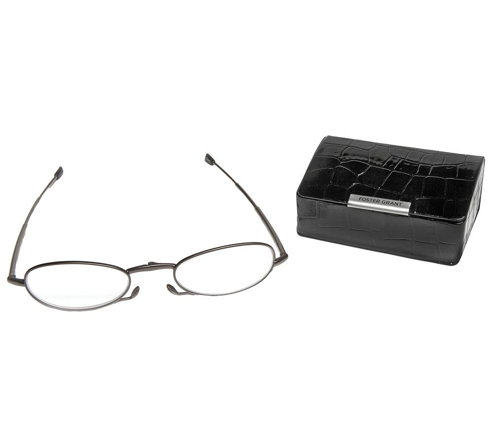 Read the writing on the wall--and the menu, magazine, food label, and book. Featuring a stylish oval frame, these folding reading glasses are always at the ready to give eyes the boost they need to see small print clearly. When not in use, their patented metal telescoping temples retract and fold in half so the specs can be tucked into the compact croco-embossed mini case for easy portability. And despite its small size, the case features a mirror and room for a lipstick--bonus! From Foster Grant.