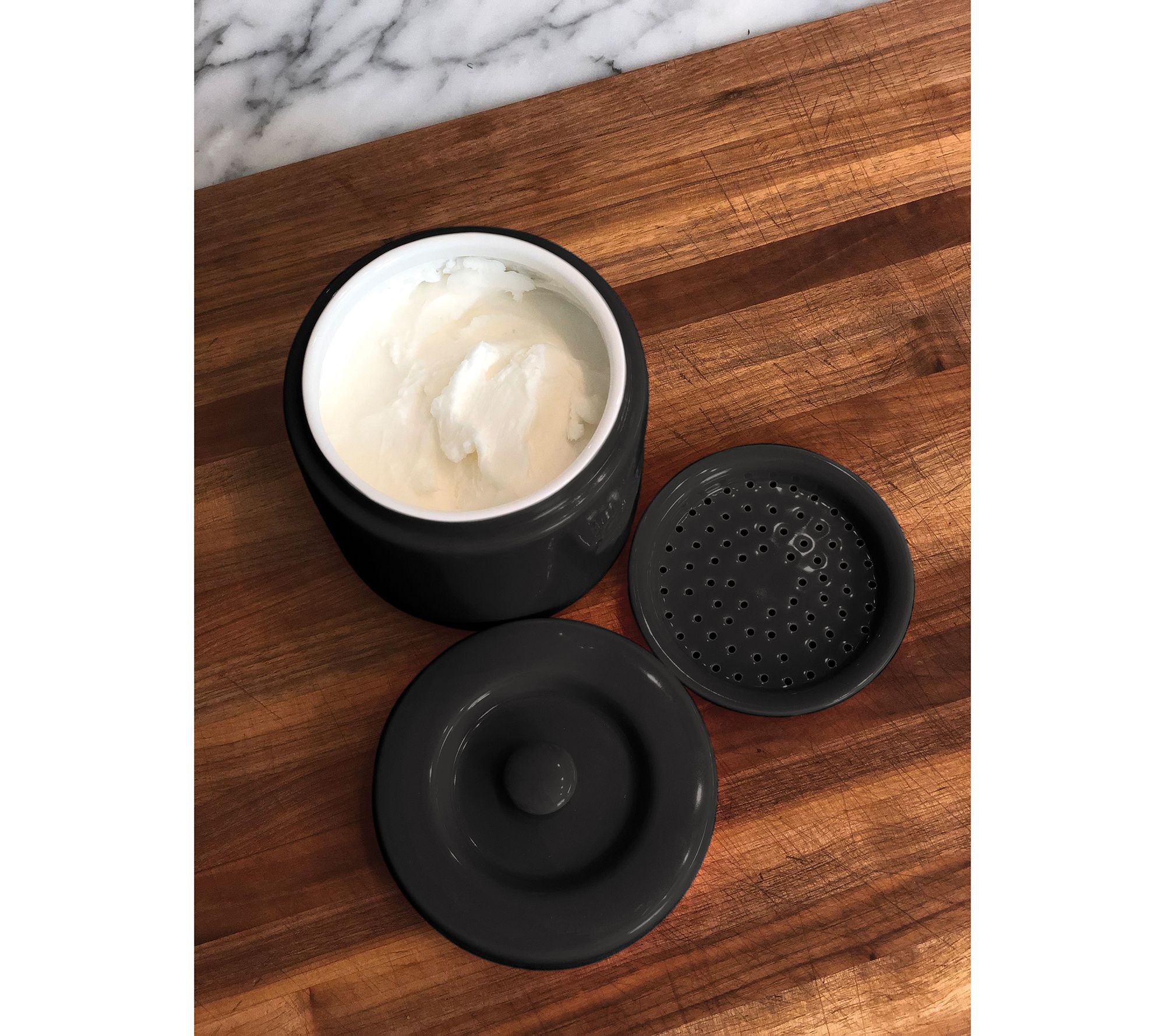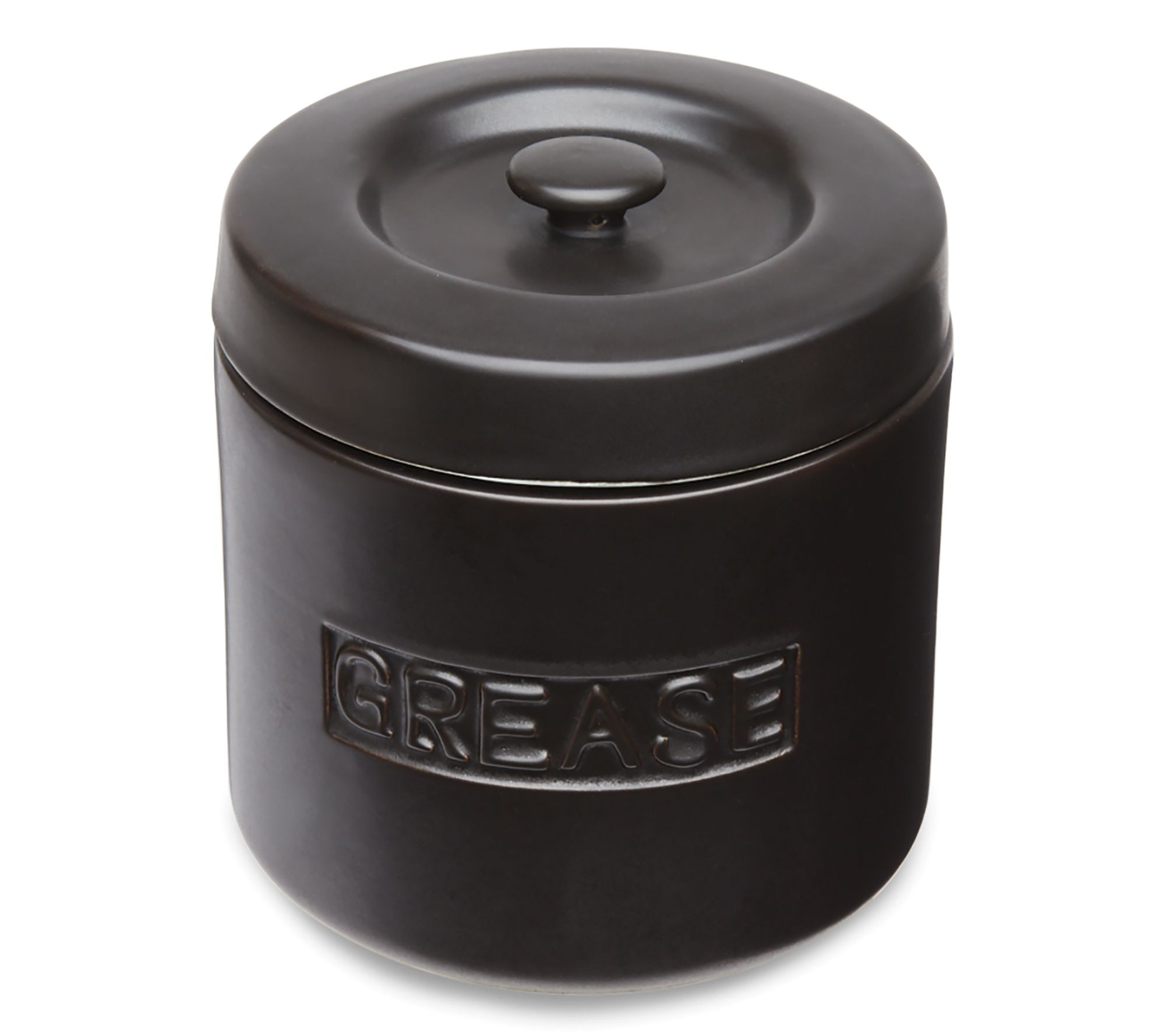 Store your grease effortlessly with the Fox Run black grease container. Its ceramic design, complete with a meshed strainer, makes it convenient to remove solids and keep stored grease pure. The container holds up to 4 cups and is dishwasher-safe for easy cleaning. From Fox Run.