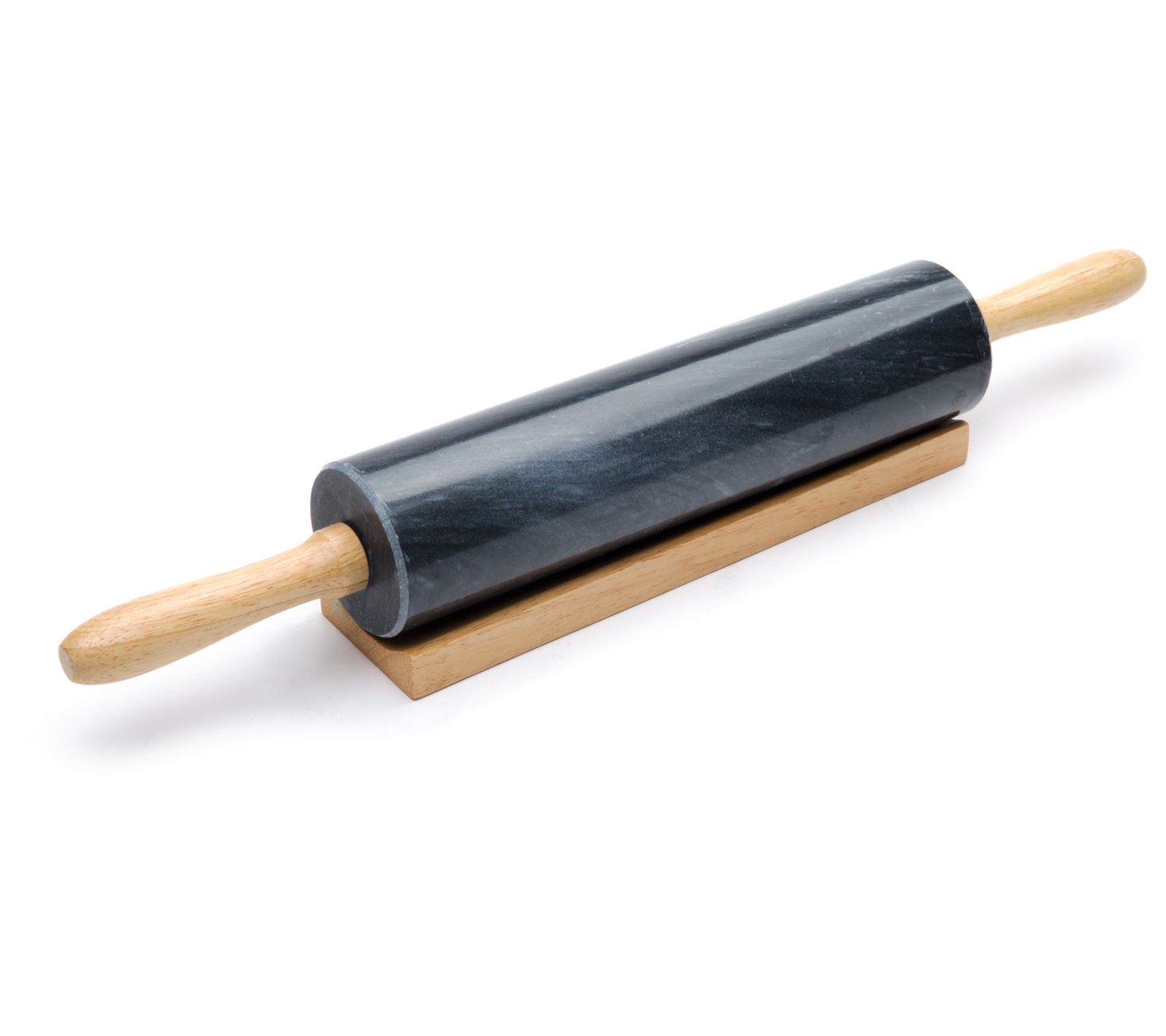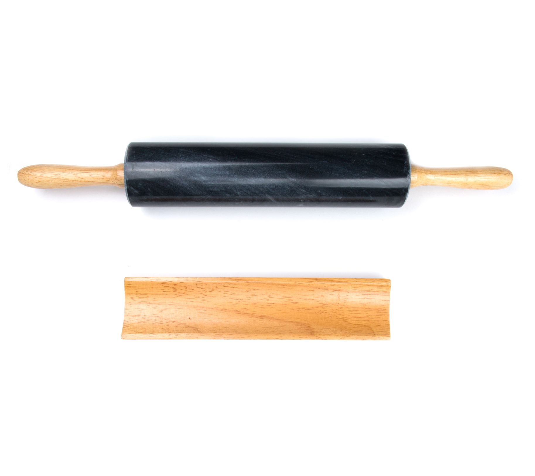 Elevate your baking game with this stunning rolling pin and base. Crafted from beautiful black marble, this elegant kitchen essential features smooth wooden handles for a comfortable grip and nylon ball bearings for effortless rolling. Each piece is unique, making it a perfect gift for housewarmings or weddings. From Fox Run.