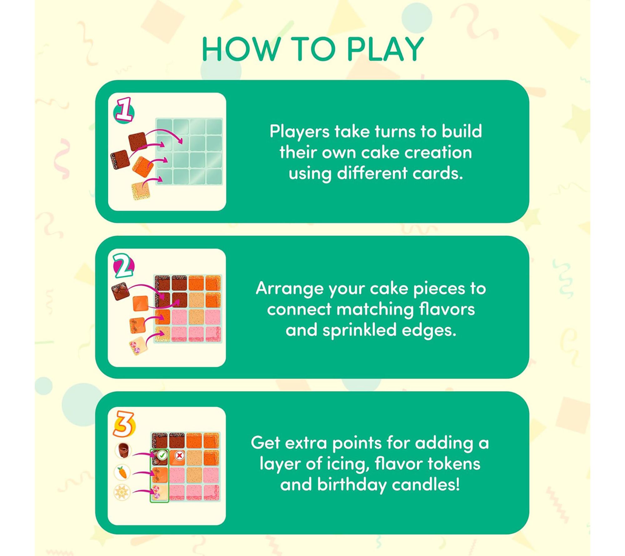 • Includes 4 cake plate boards, 64 cake tiles, 64 icing tiles, 16 cut cards, 4 character cards, 1 knife card, 60 flavor tokens, 10 candle tokens, score pad, and rulebook