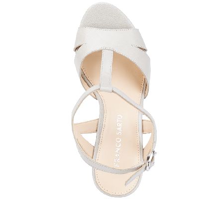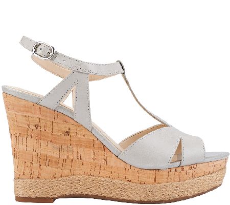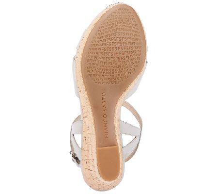 Swerve into style. Carefree cork details and a pretty T-strap design put these Franco Sarto leather wedge sandals on the fashion fast track. Just buckle on the adjustable ankle straps and go. From Franco Sarto.