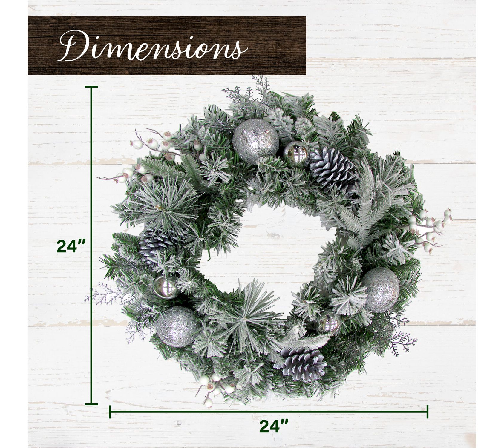 • Silver ornament, pinecone, winter berry, and snow-flocked accents