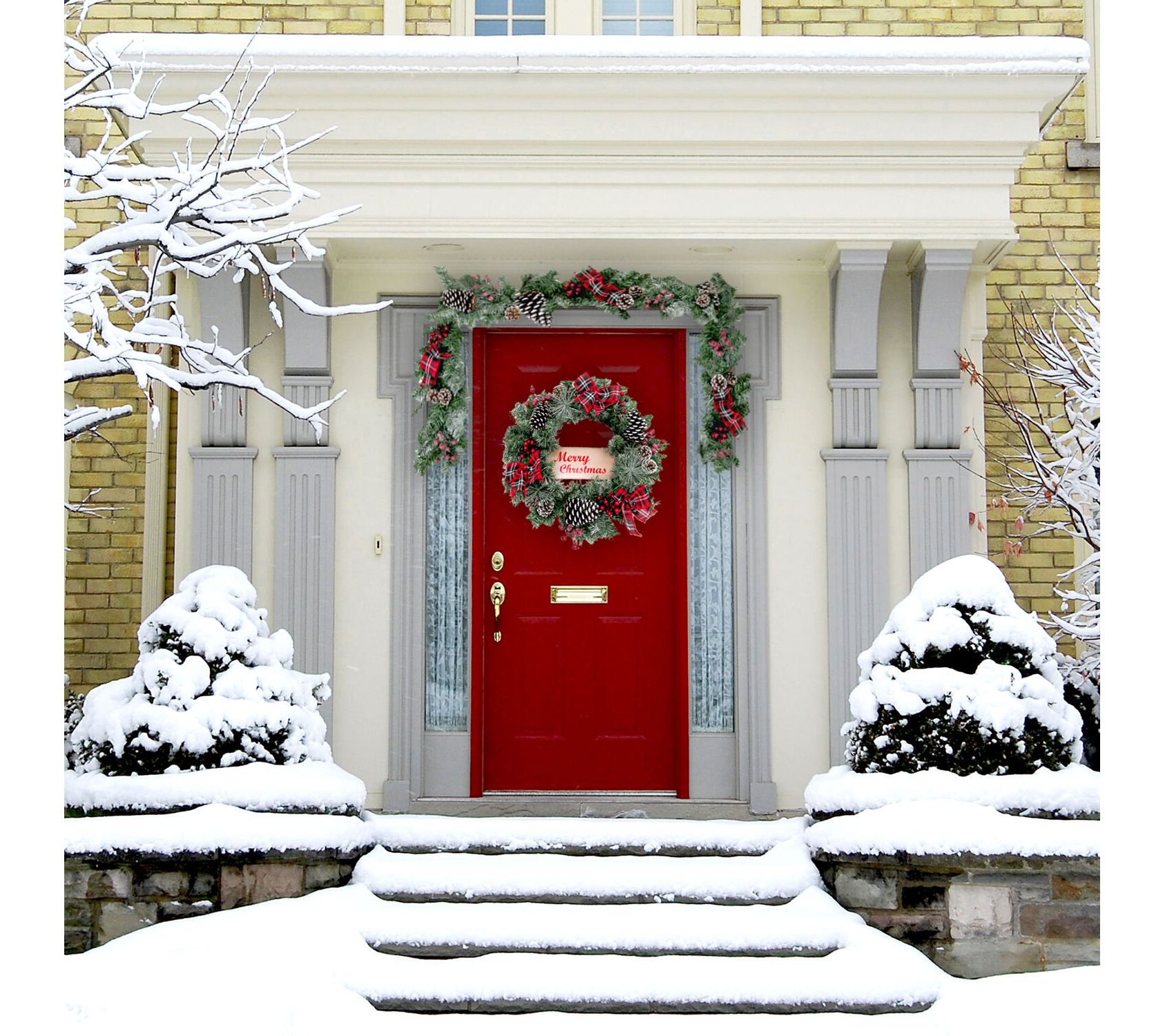 Welcome your guests with the festive charm of this lifelike wreath and garland set featuring snow-flocked details, pinecone accents, and jolly bow and berry decorations. From Fraser Hill Farm.