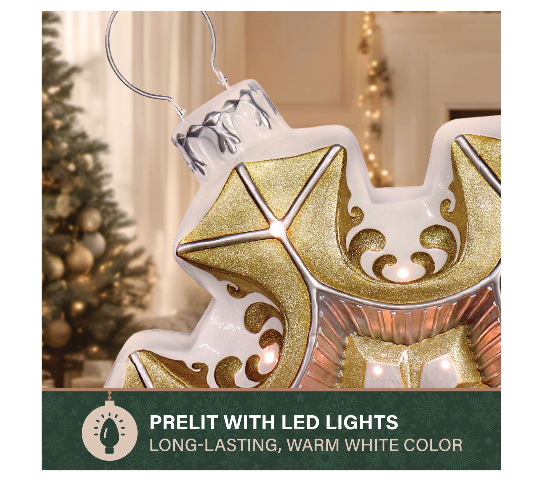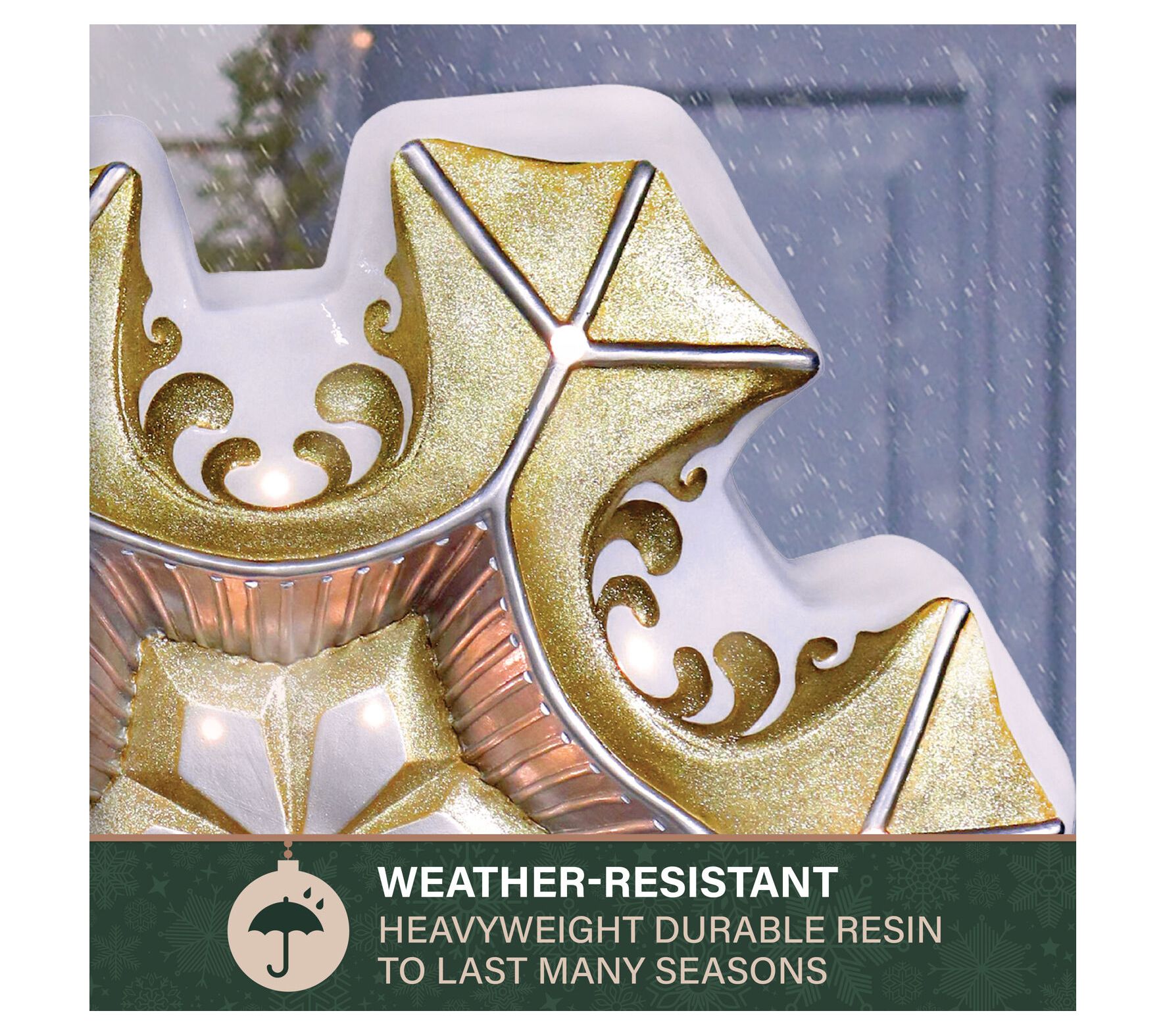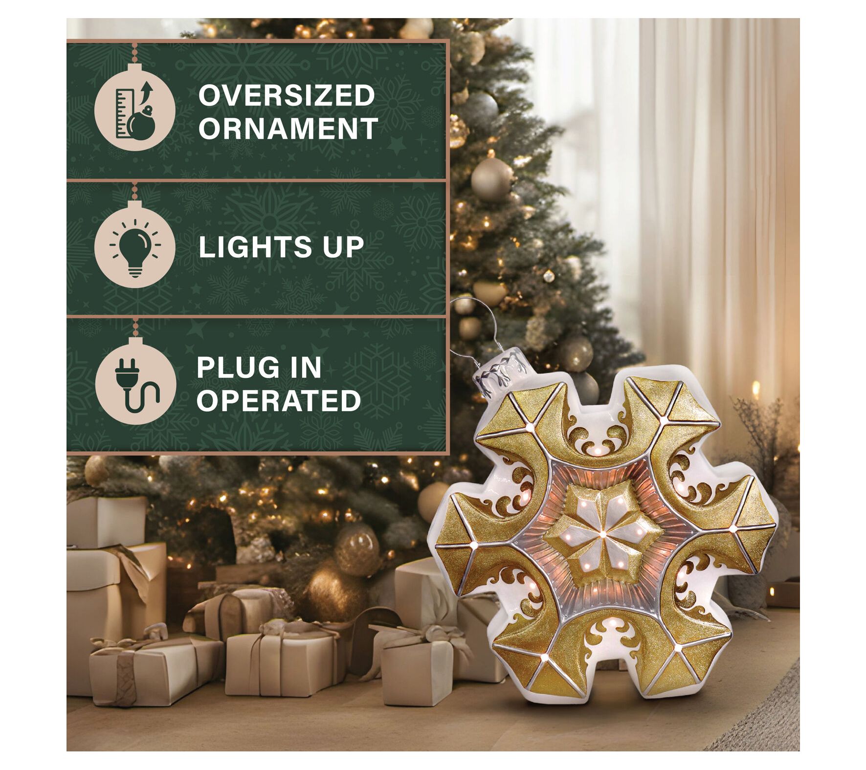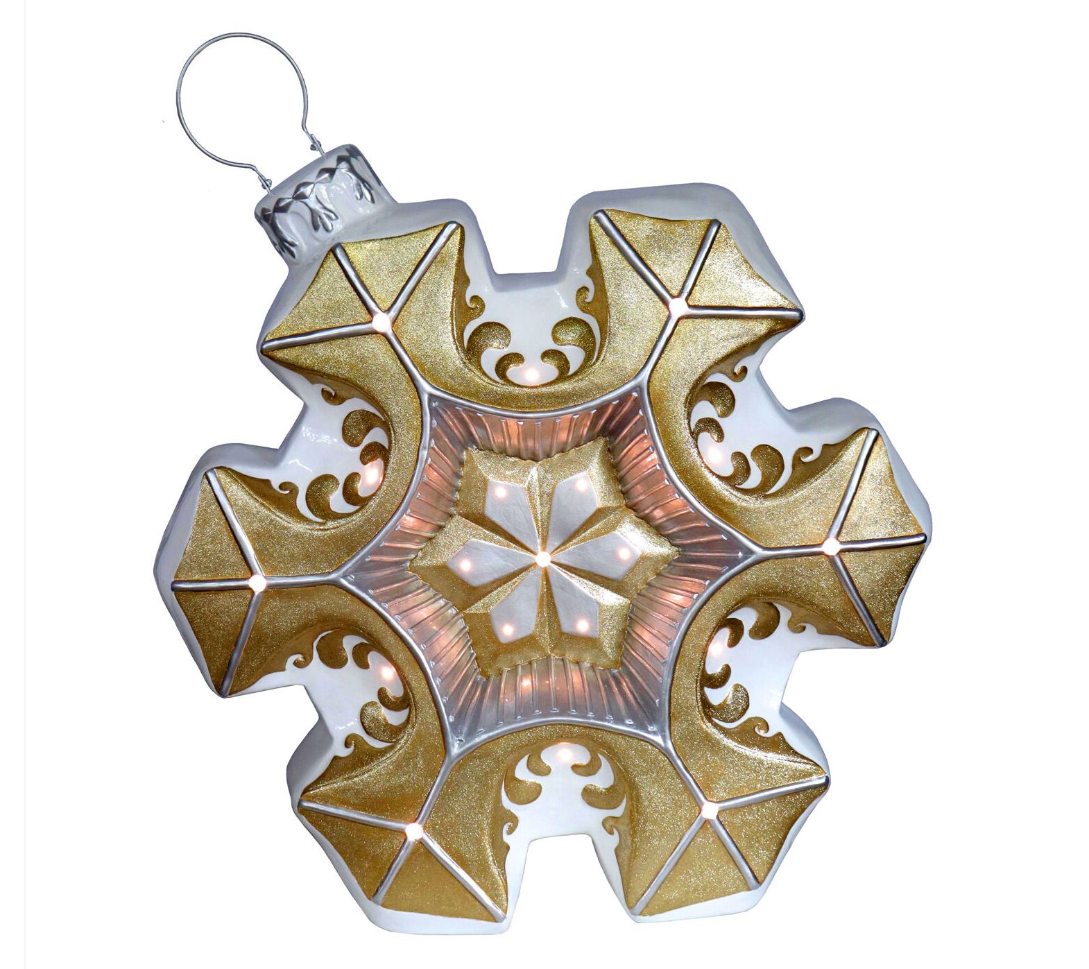 Transform your holiday display with the elegant charm of this charming ornament statue. Standing majestically tall, it showcases a vintage snowflake design with glistening warm white LED lights, adding a shimmering glow to your entryway or outdoor space. The durable construction allows it to withstand seasonal elements, ensuring lasting enjoyment. Place it near your tree or doorway to greet guests with festive warmth and style. From Fraser Hill Farm.