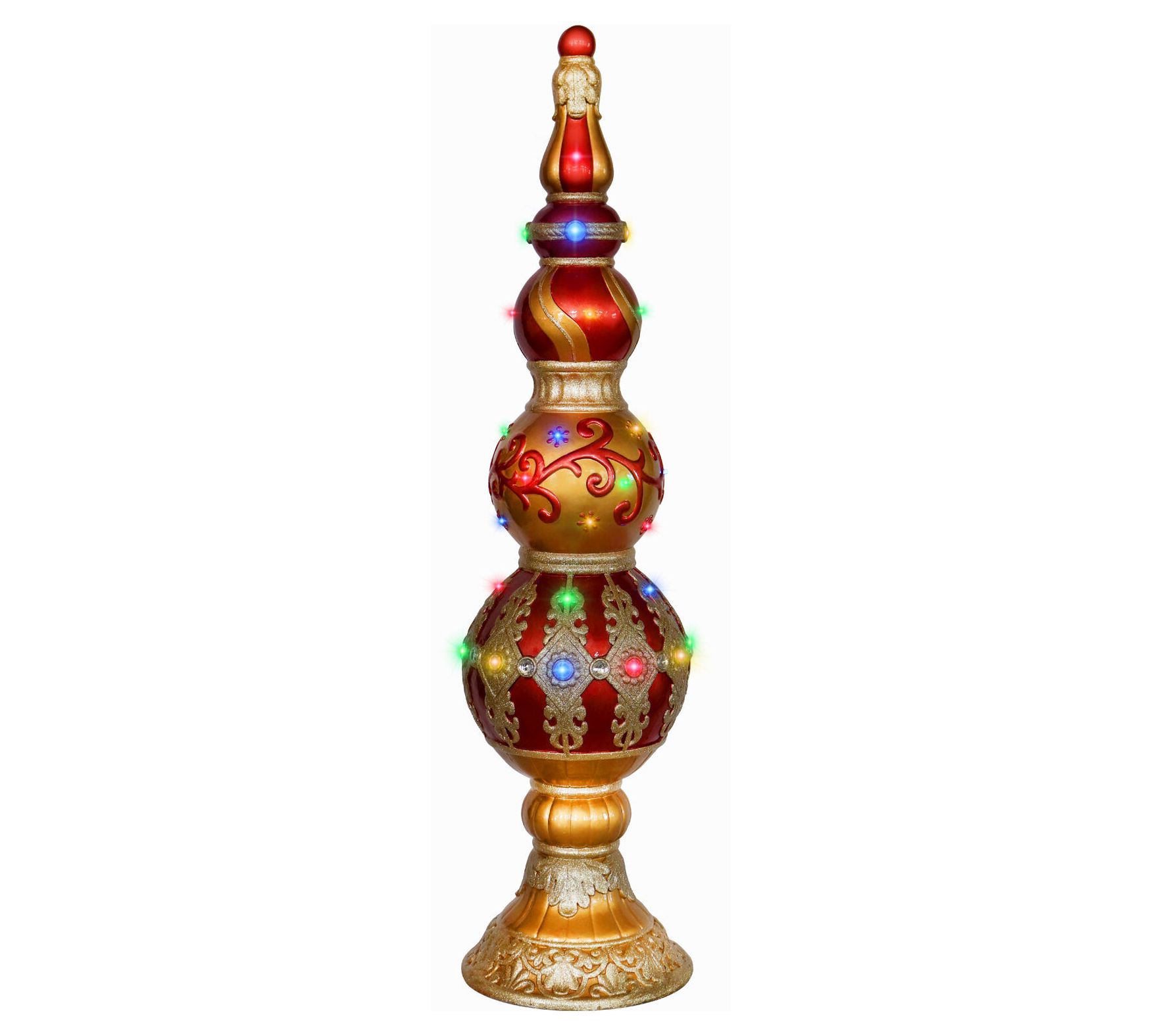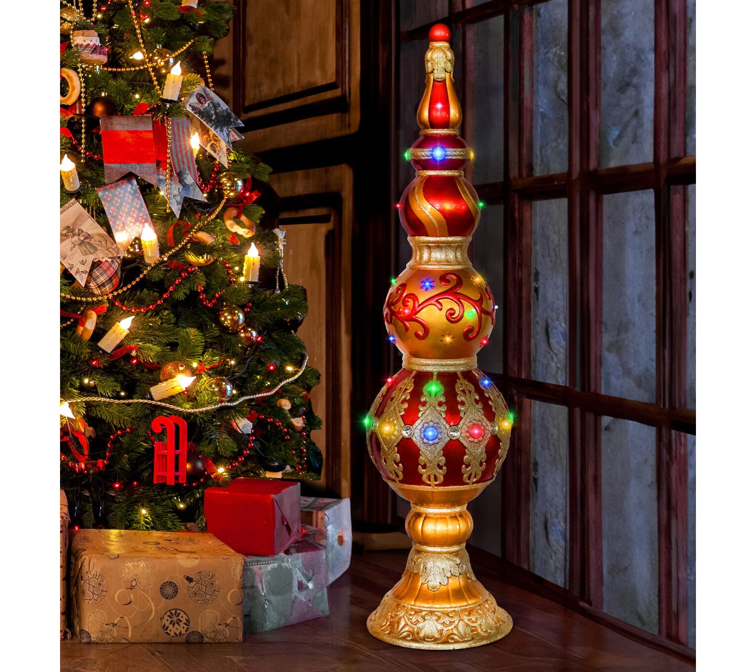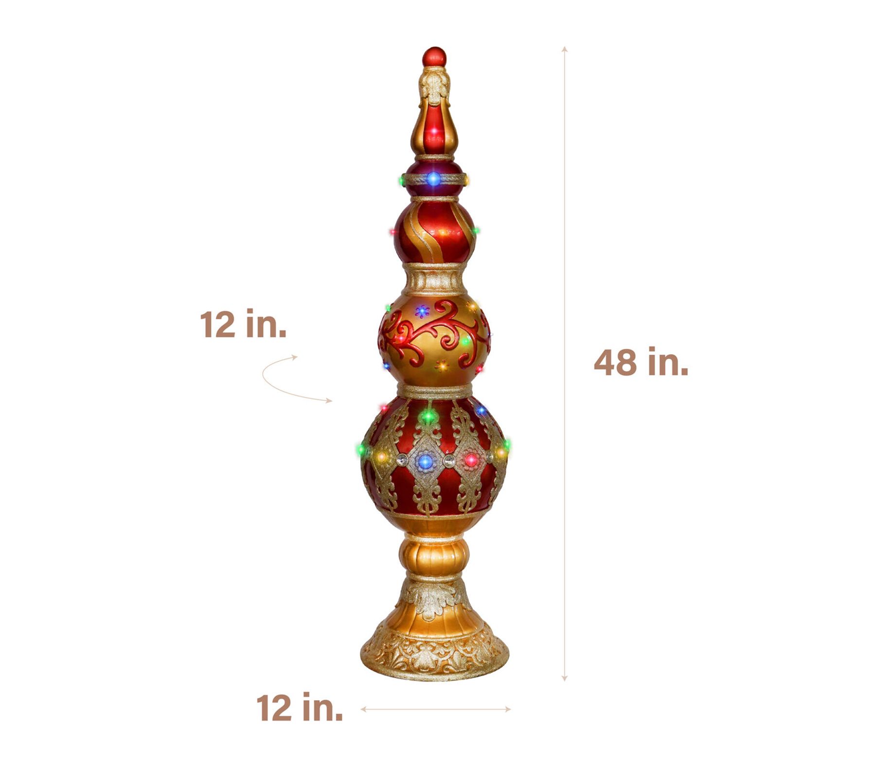 Transform your holiday setting into a magical wonderland with this stunning metallic finial statue from Fraser Hill Farm. Standing gracefully at four feet, it brings a touch of grandeur to any space, whether indoors or outdoors. Jeweled lights and intricate burgundy and gold designs create a mesmerizing effect that will captivate guests and add charm to your decor. Set it by the tree, door, or entryway to welcome loved ones with festive cheer. From Fraser Hill Farm.