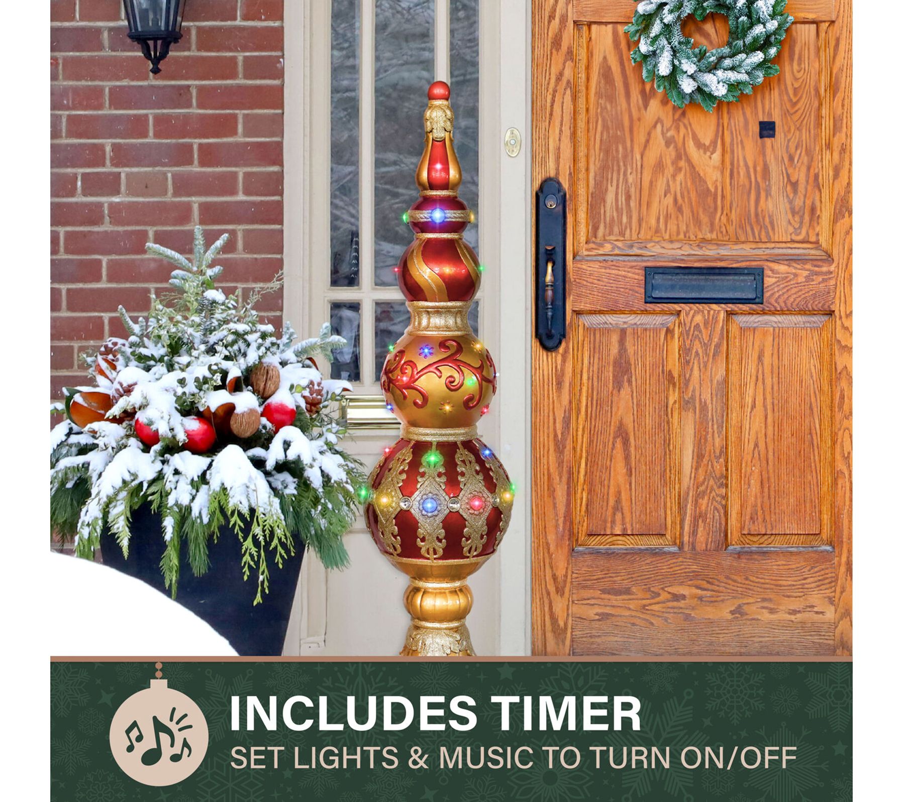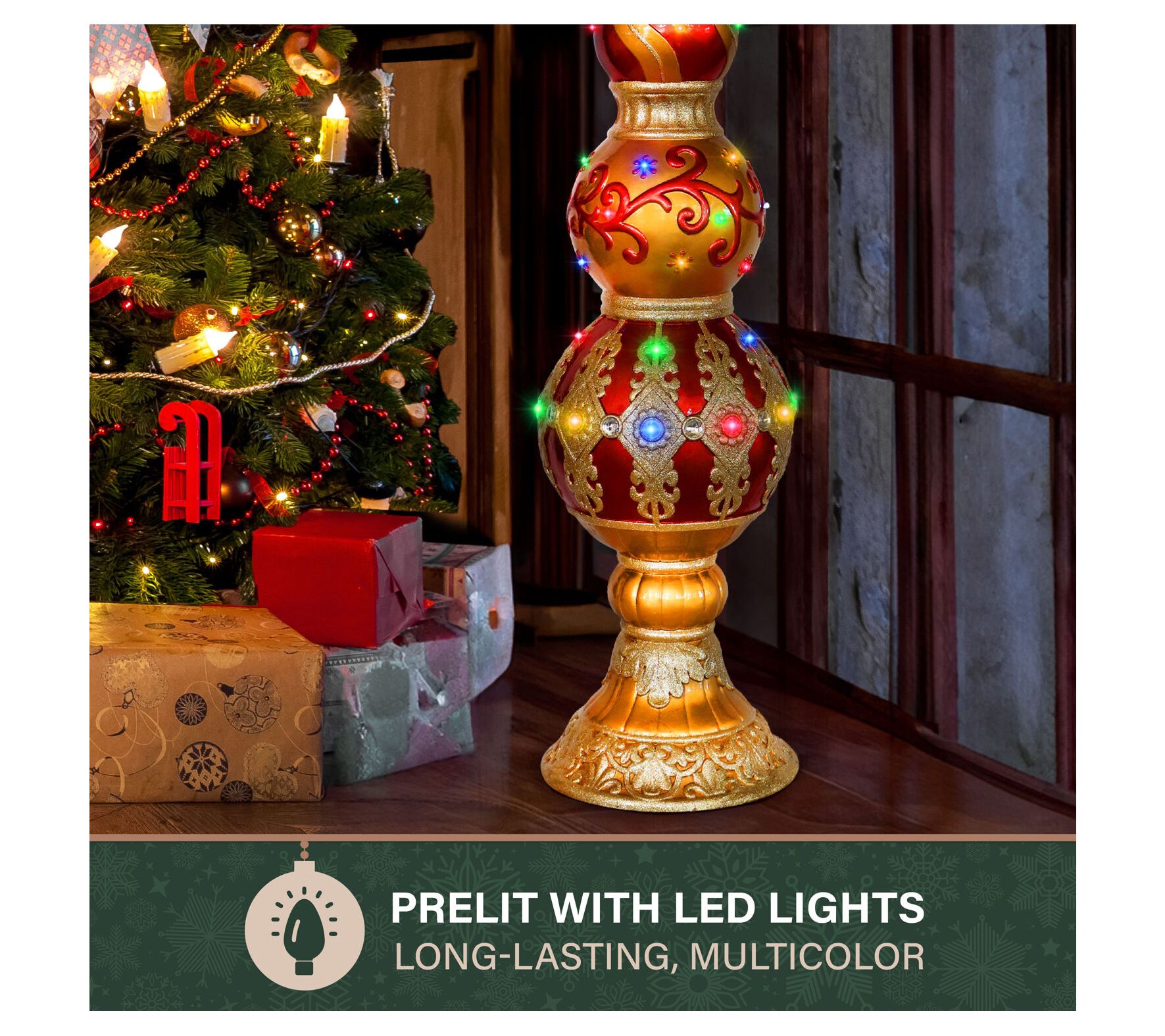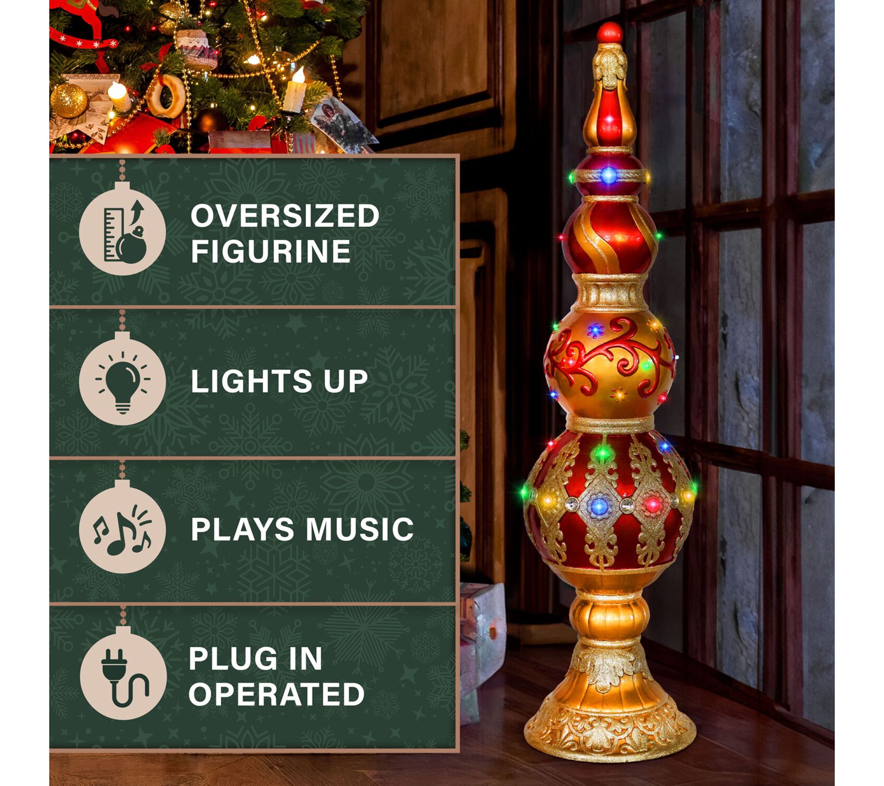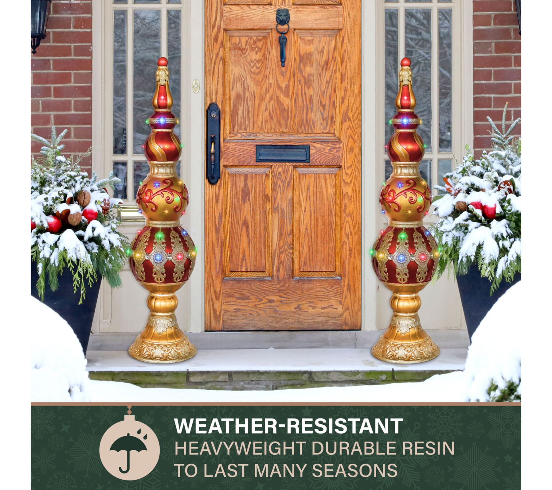 Transform your holiday setting into a magical wonderland with this stunning metallic finial statue from Fraser Hill Farm. Standing gracefully at four feet, it brings a touch of grandeur to any space, whether indoors or outdoors. Jeweled lights and intricate burgundy and gold designs create a mesmerizing effect that will captivate guests and add charm to your decor. Set it by the tree, door, or entryway to welcome loved ones with festive cheer. From Fraser Hill Farm.