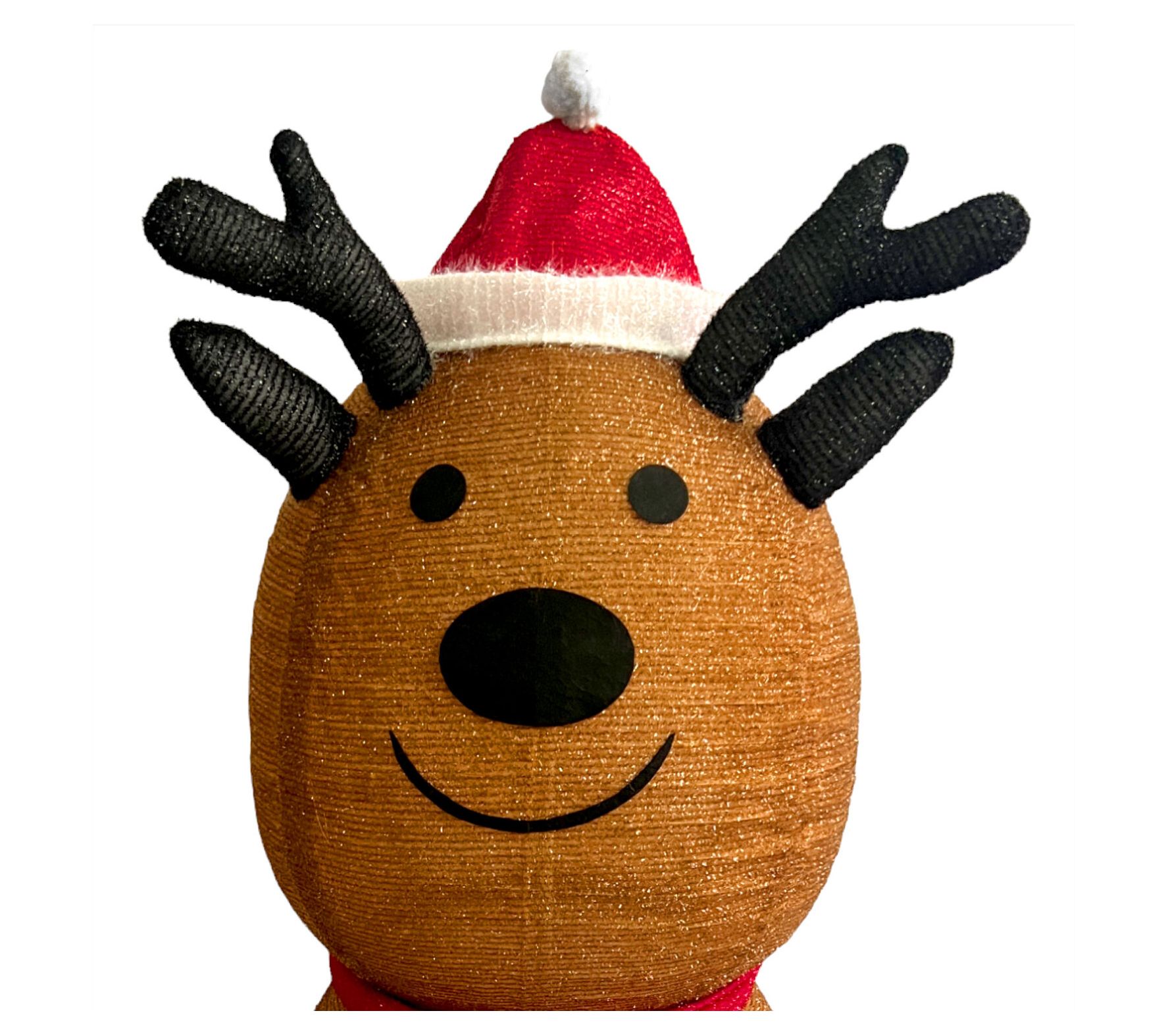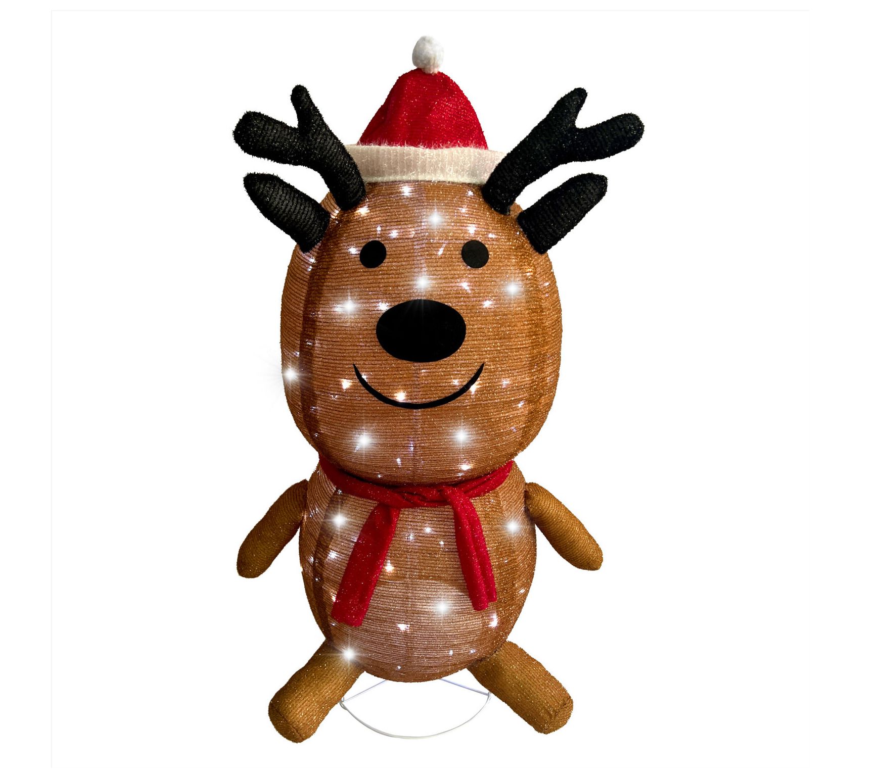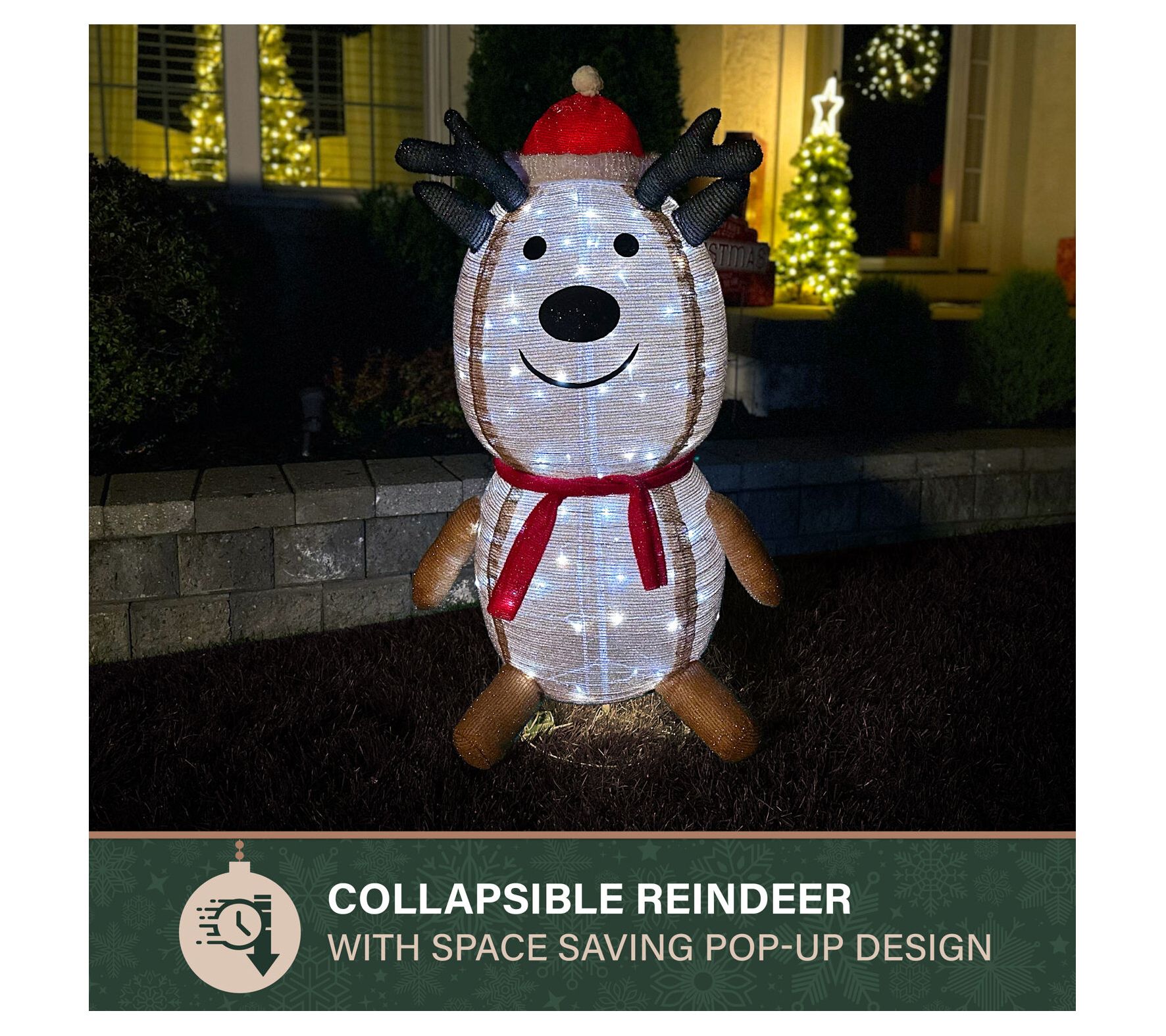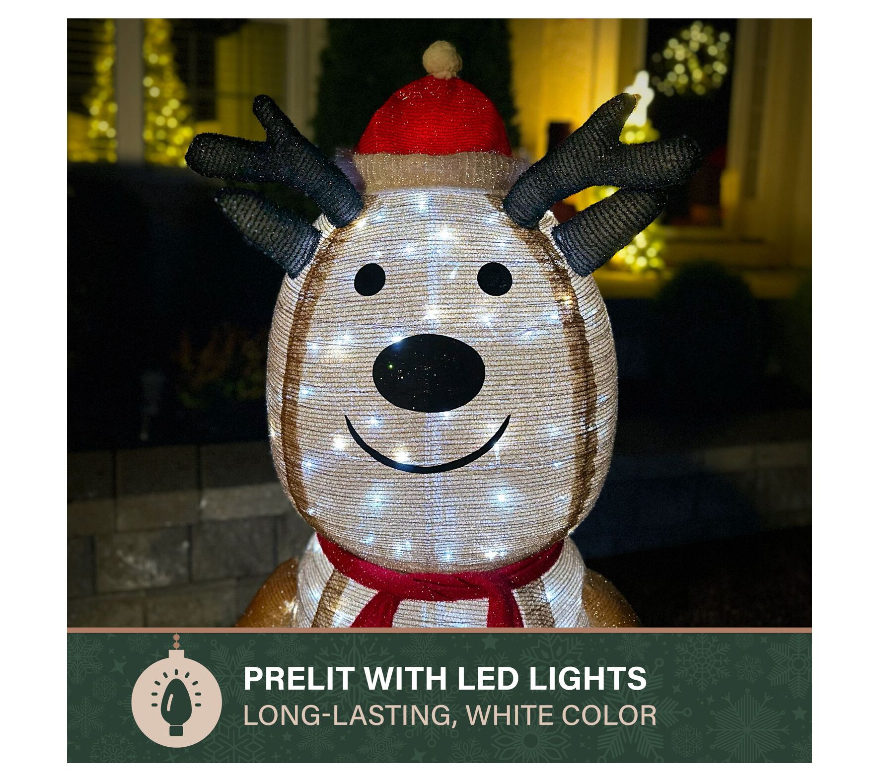 Capture the beauty, magic, and wonder of the holiday season with the Fraser Hill Farm prelit collapsible tinsel reindeer decor. With a Santa hat and glowing LED lights, this reindeer brings festive charm to any setting, whether indoor or outdoor. From Fraser Hill Farm.