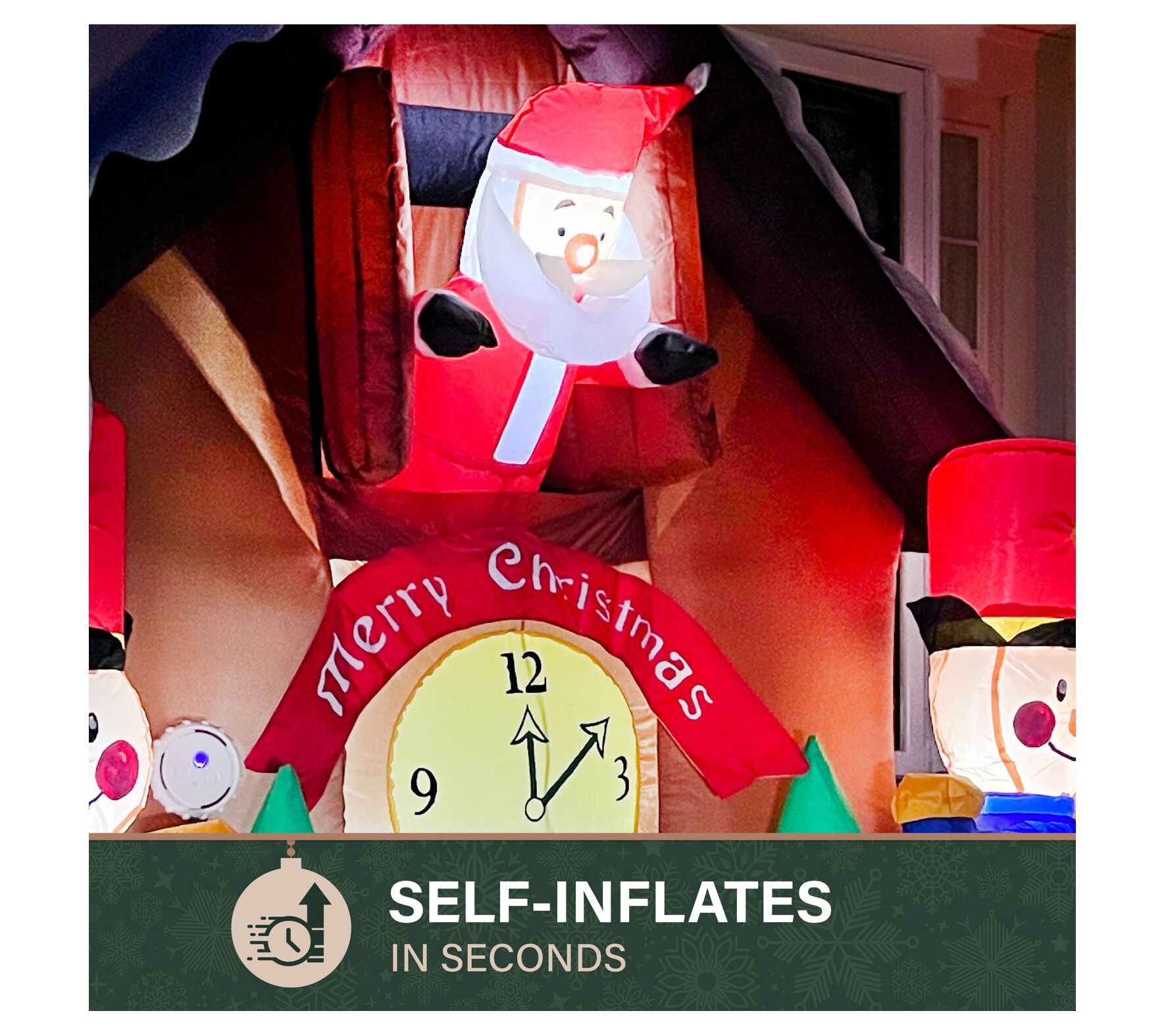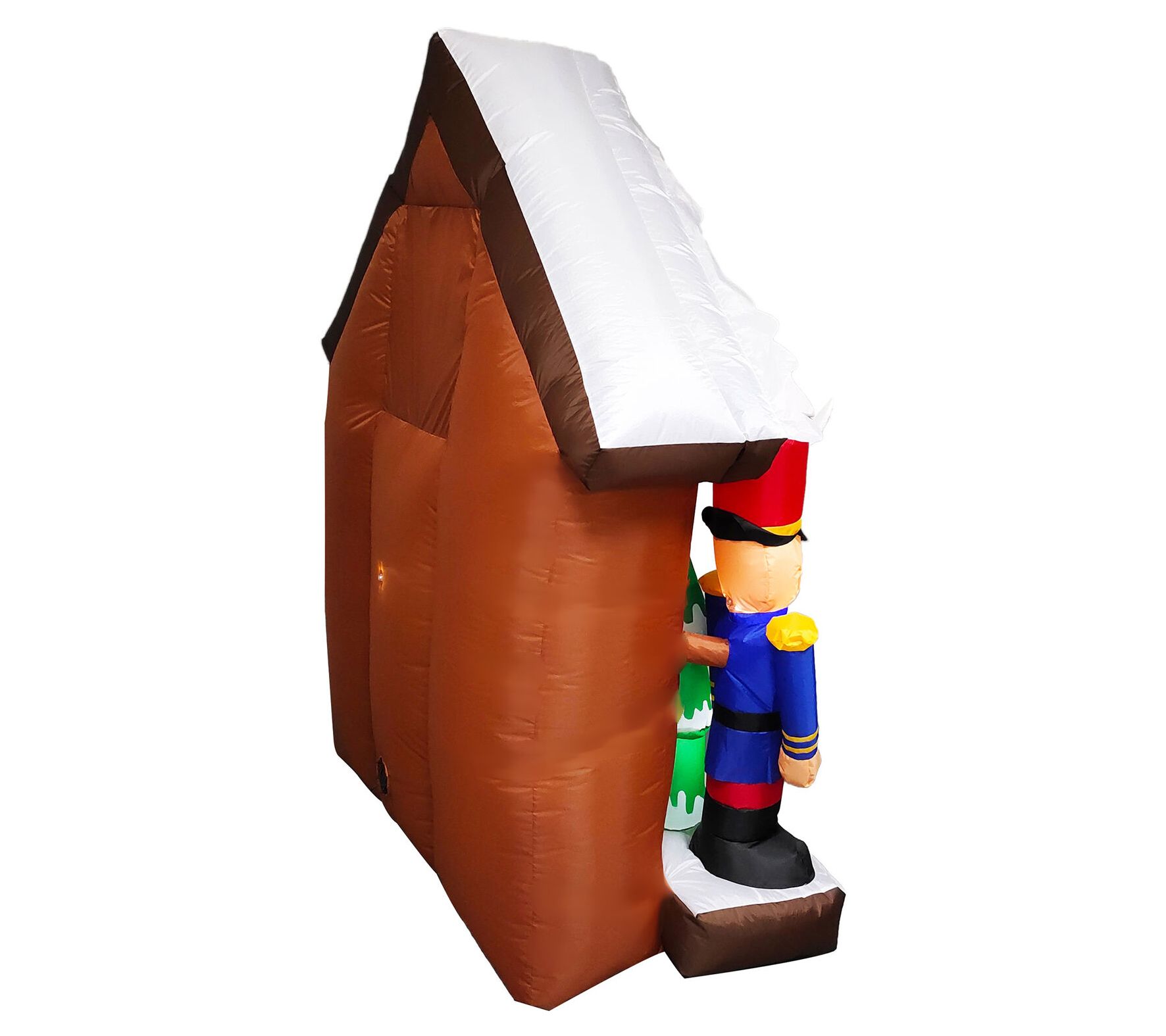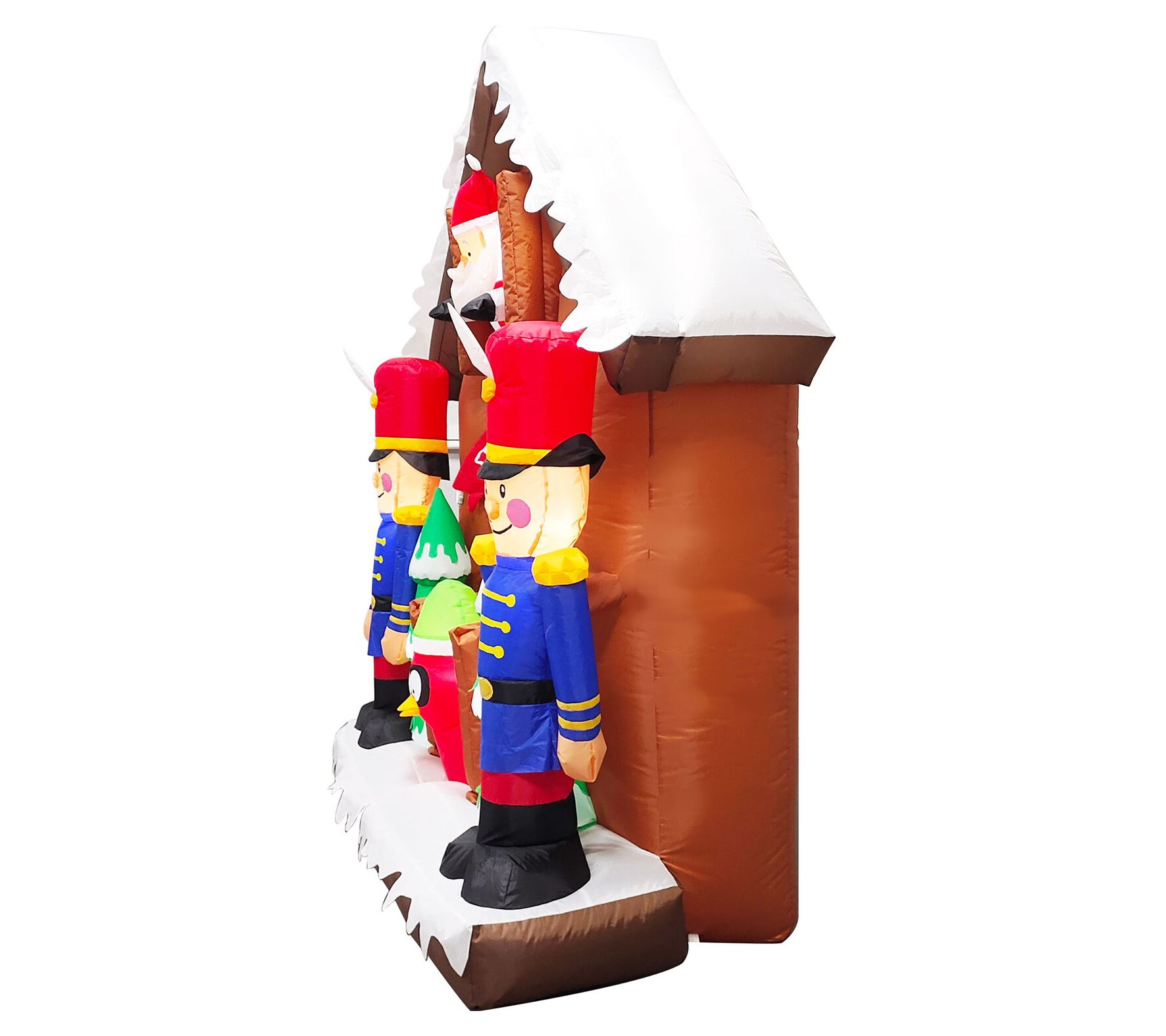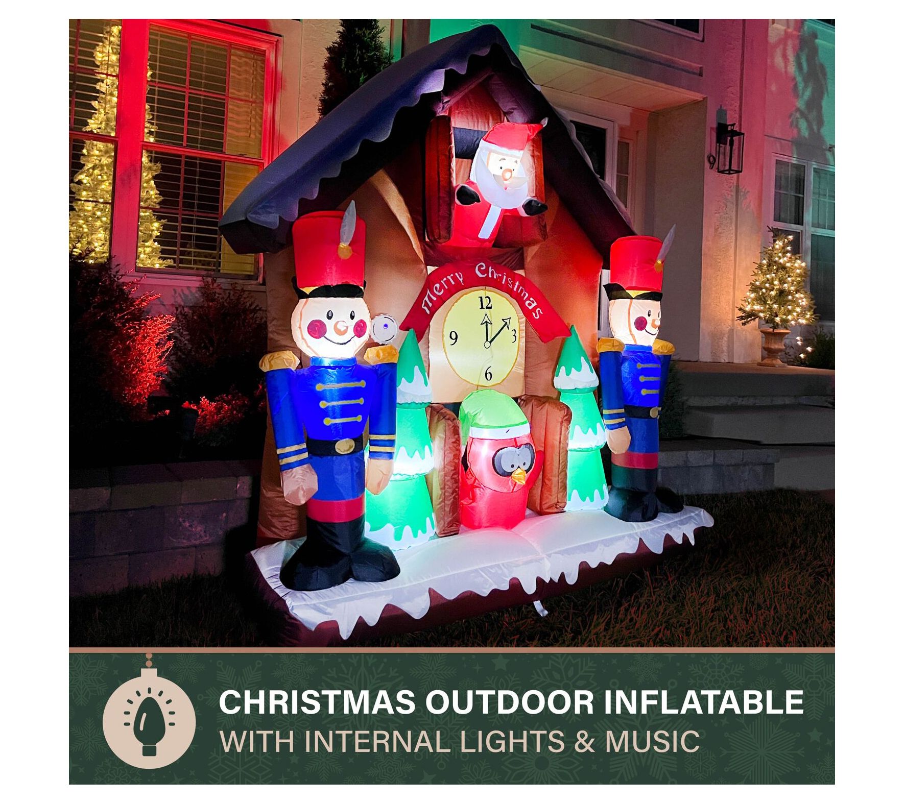 This fun and whimsical inflatable is sure to spread holiday cheer. Bright LED lights illuminate the nutcracker house as Santa peeks out of the upstairs window. From Fraser Hill Farm.