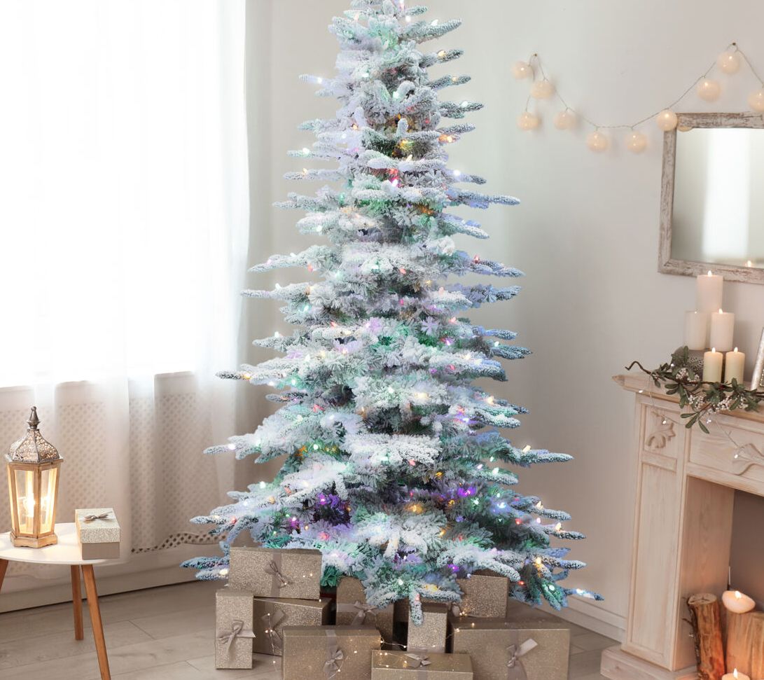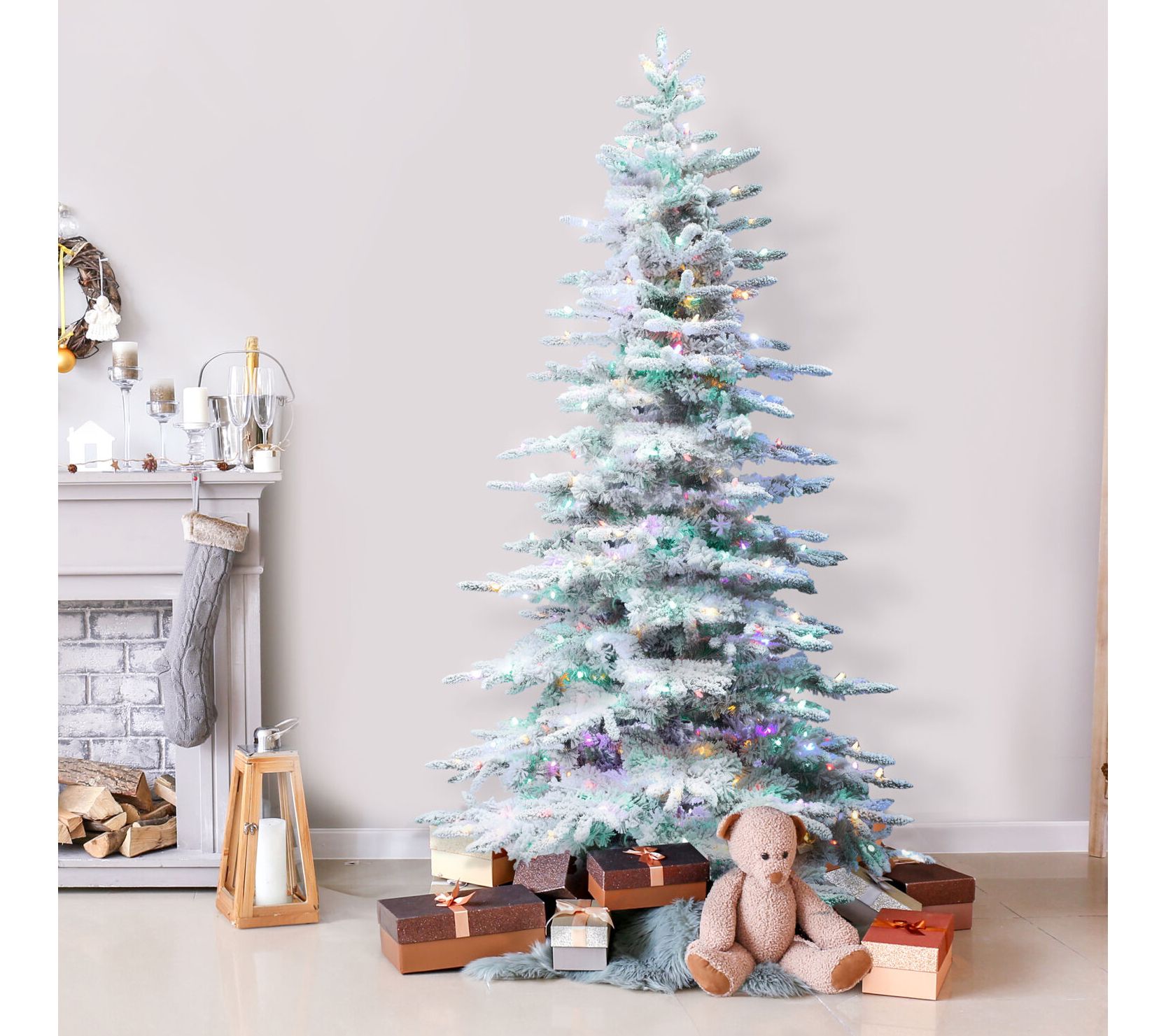 The snowy wonderland of holiday dreams becomes reality with this elegantly flocked tree. As you revel in its lifelike branches and freshly snow-dusted appearance, imagine transforming your living space into a warm seasonal haven, with glowing lights casting a tranquil ambiance. Whether hosting gatherings or enjoying quiet evenings, the blend of multicolor and warm white LED bulbs on sturdy branches make decorating delightfully simple. Year after year, this tree remains the focal point of joyous celebrations. From Fraser Hill Farm.
