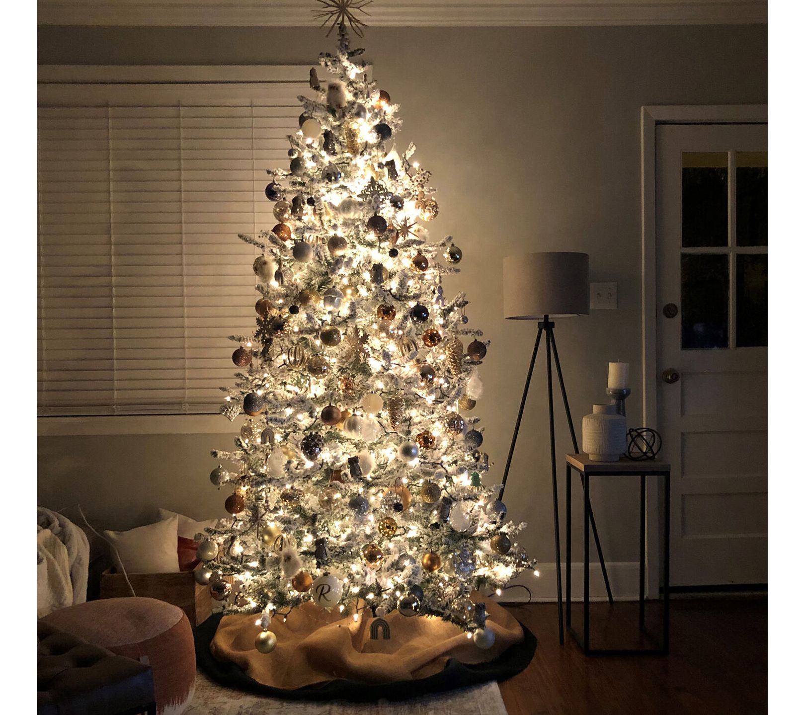 Transform your holiday space with the Pine Valley flocked artificial Christmas tree, crafted to evoke the beauty of freshly fallen snow. Its lifelike foliage and all-metal hinged branches offer effortless elegance with minimal fuss. Prestrung with 400 warm white LED lights, this tree ensures you leave tangled lights in the past. Just unfold, fluff, and decorate for a stunning seasonal display. From Fraser Hill Farm.