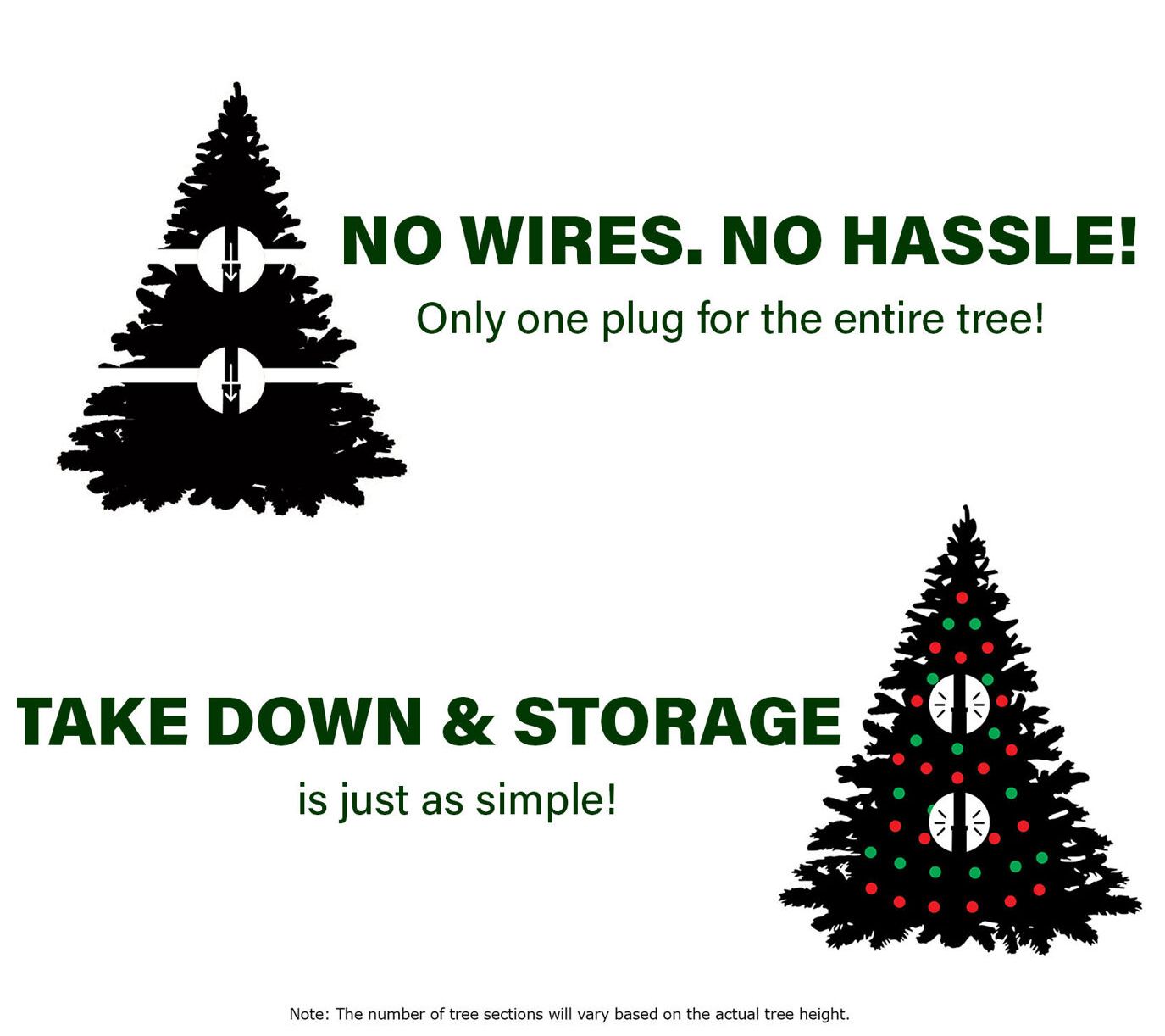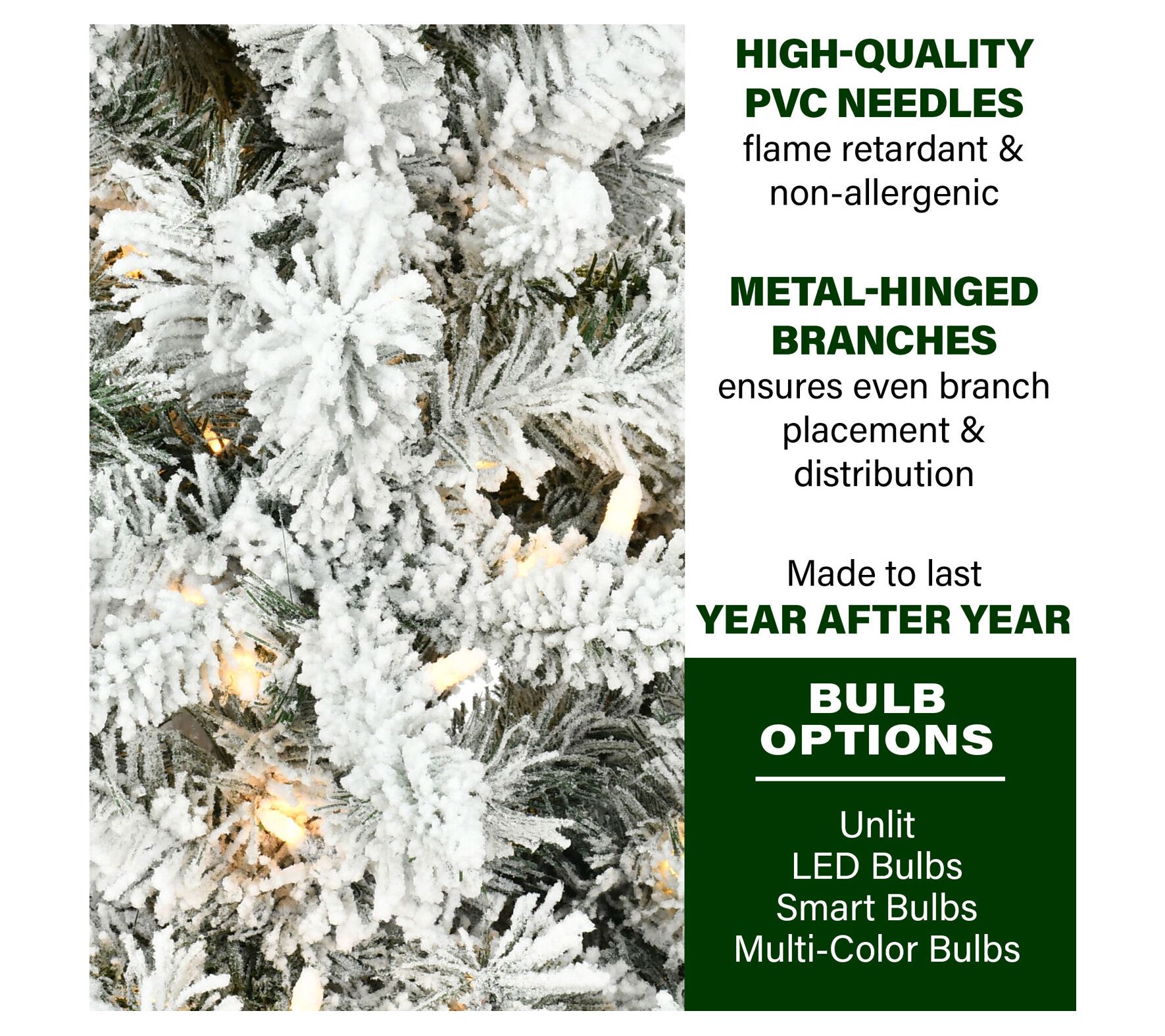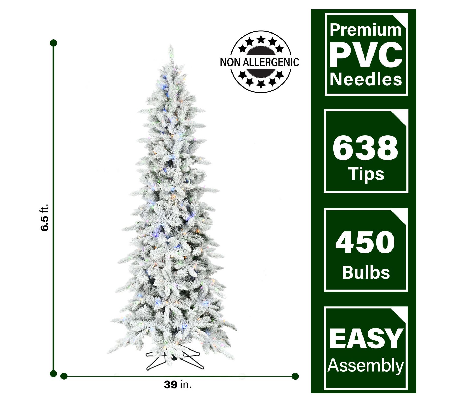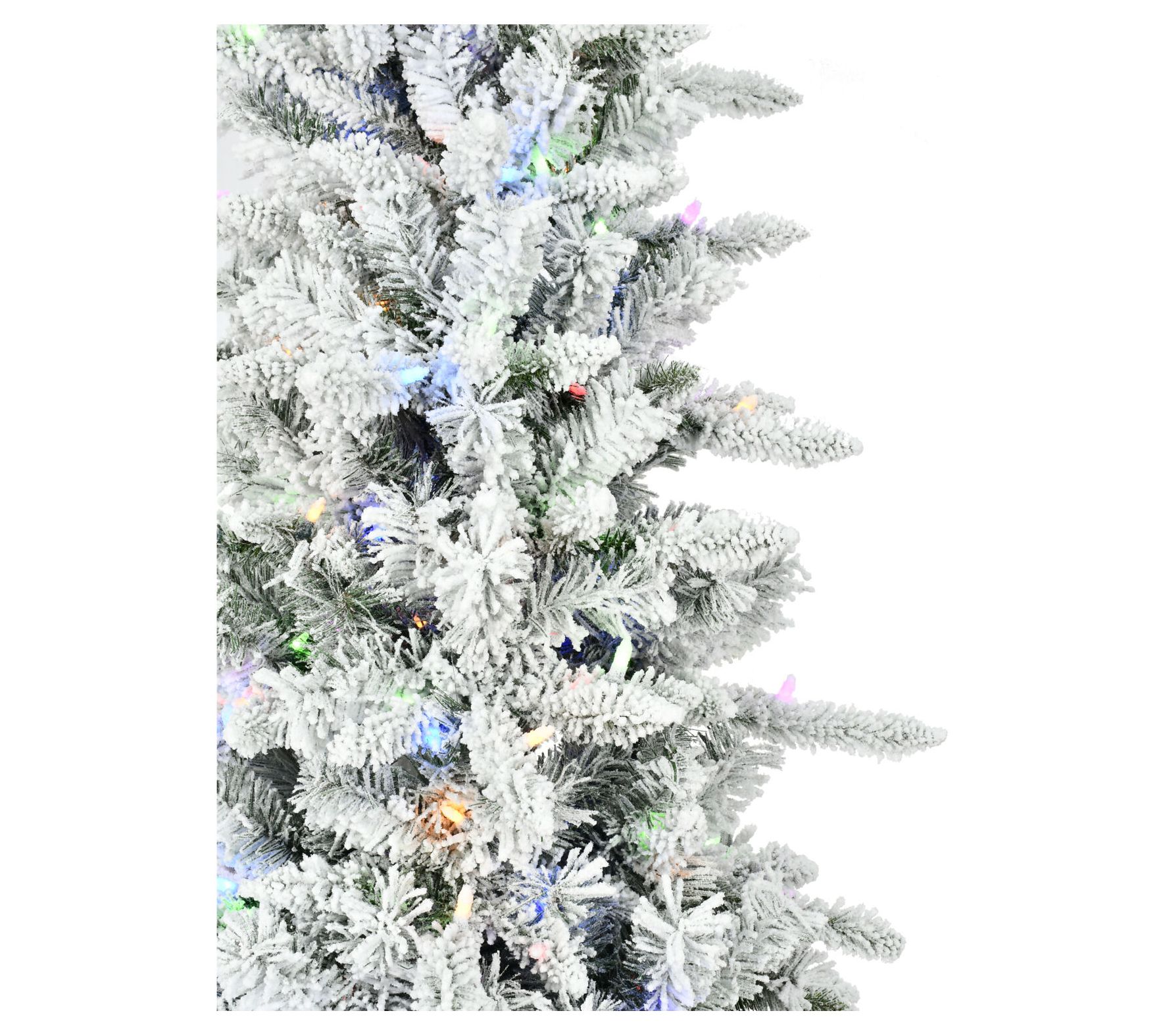 A majestic addition to your holiday decor, this slim mountain pine offers a touch of enchantment with its heavily flocked branches that emulate the charm of freshly fallen snow. Perfectly designed to fit any space, this pencil-thin silhouette is a morning delight or an evening spectacle. Bathed in the glow of 450 multicolor LED lights, it creates a warm, holiday ambiance in your home. Revel in its simplicity year after year, avoiding the hassle of a real tree. From Fraser Hill Farm.
