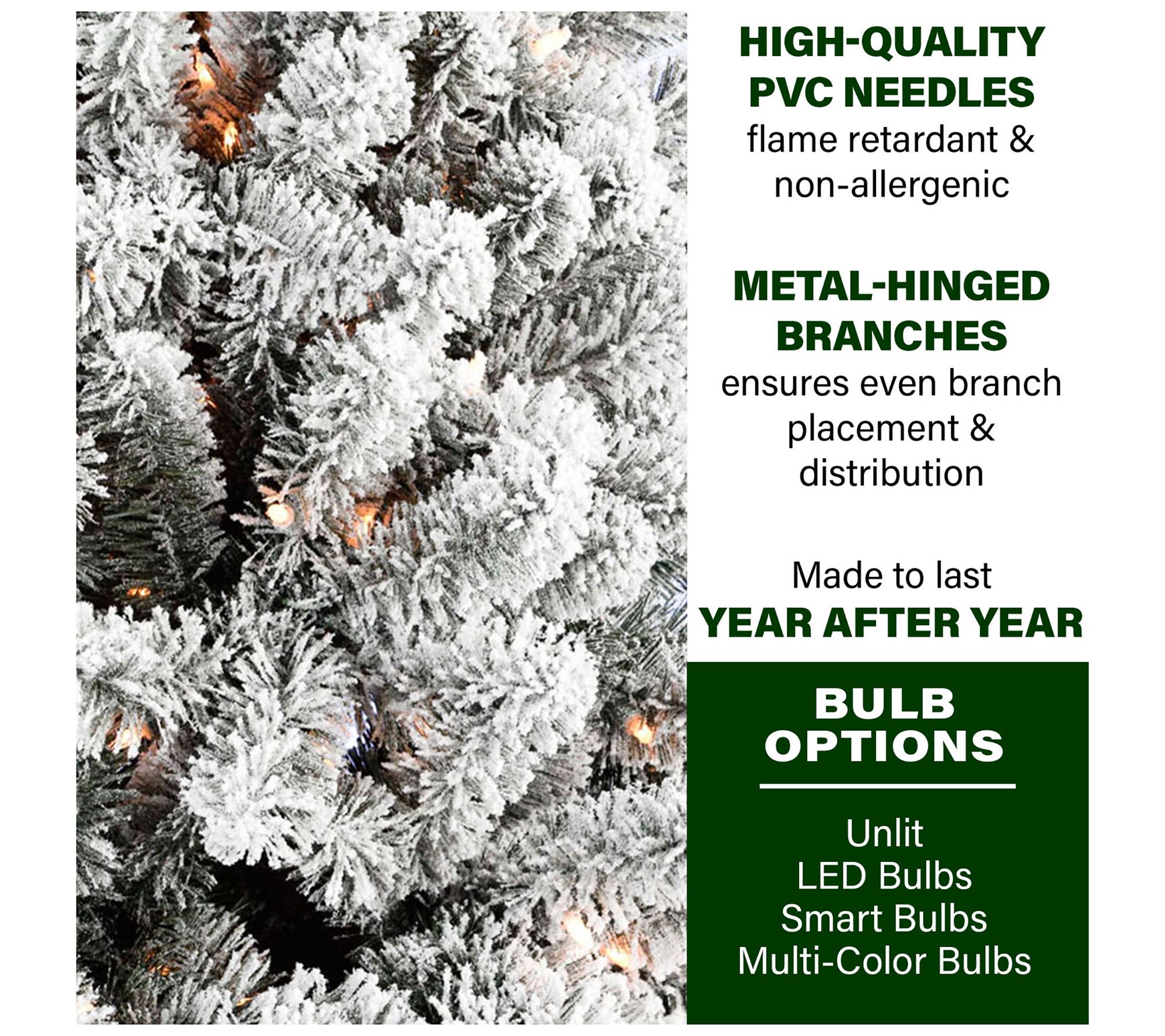 Fraser Hill Farm's 9-ft. flocked Alaskan pine Christmas tree features lifelike foliage and a seasonal flocked finish. With its slim yet full silhouette, this tree is prestrung with 900 white incandescent lights that stay lit even if one bulb burns out. Simply unfold, fluff, and decorate to bring holiday cheer to your home with ease. From Fraser Hill Farm.