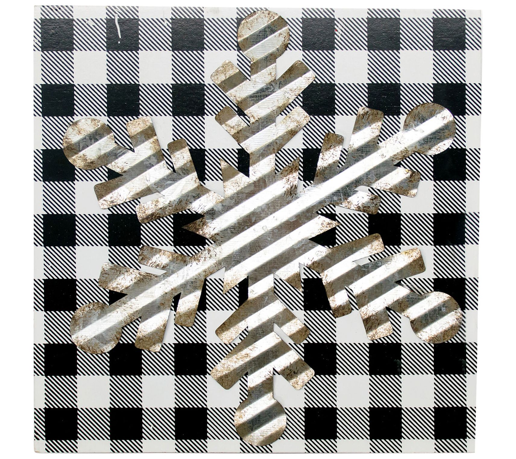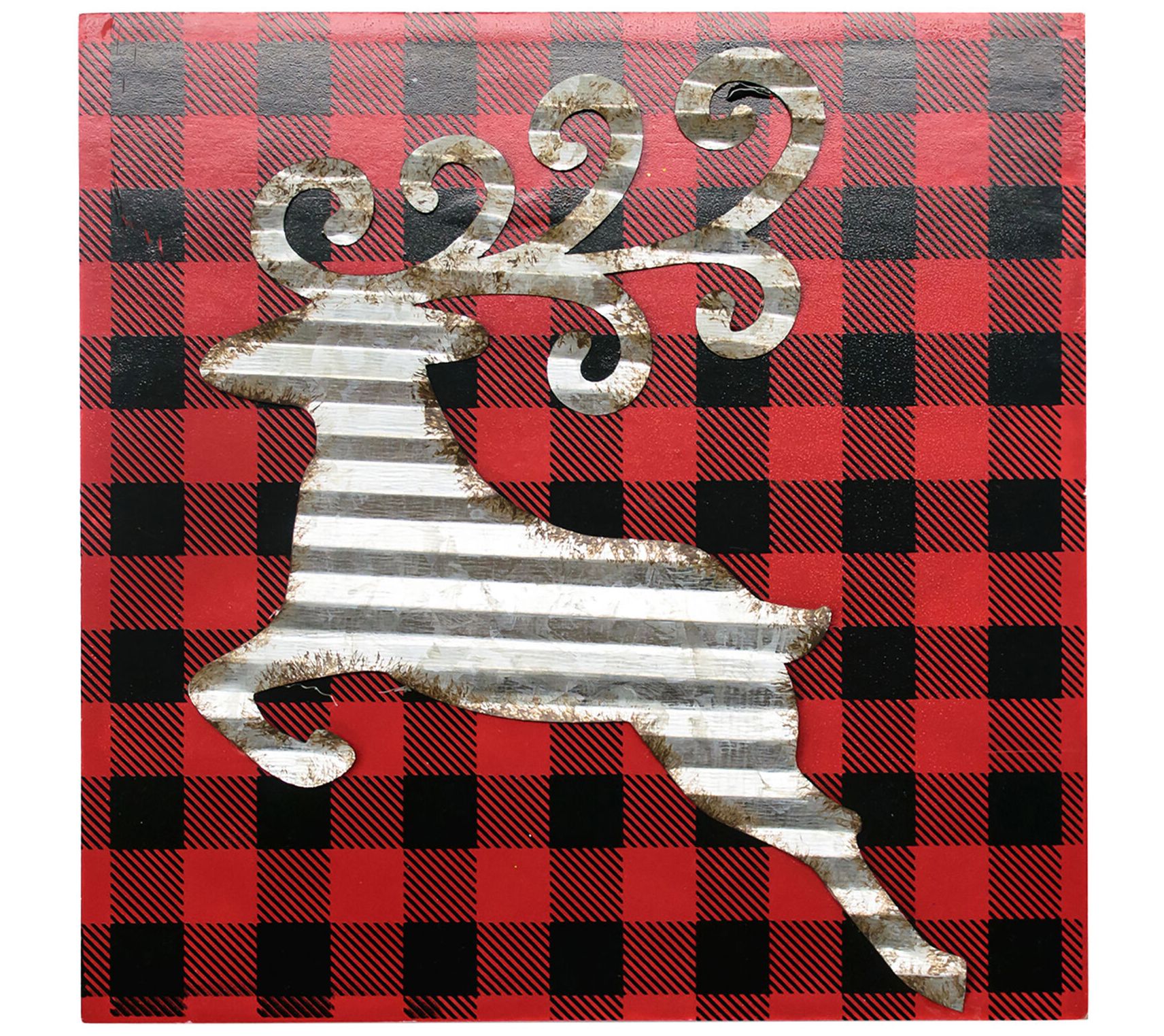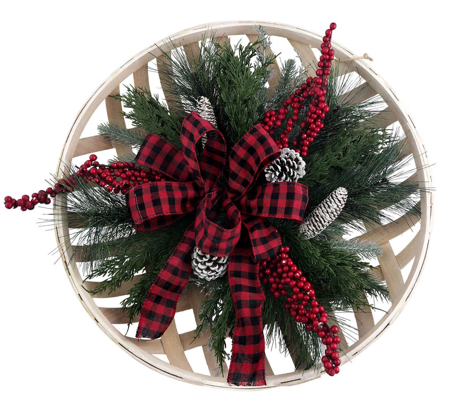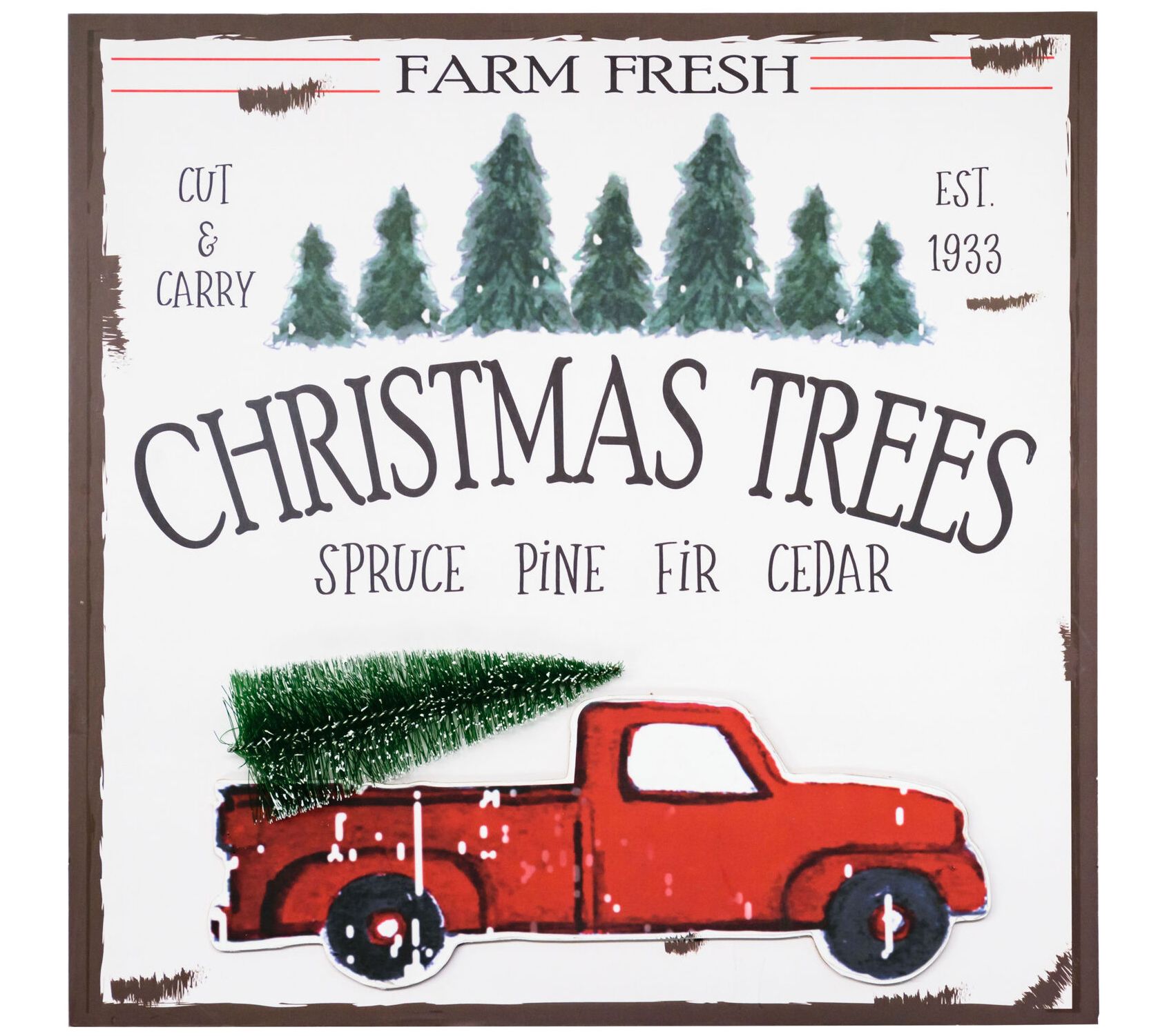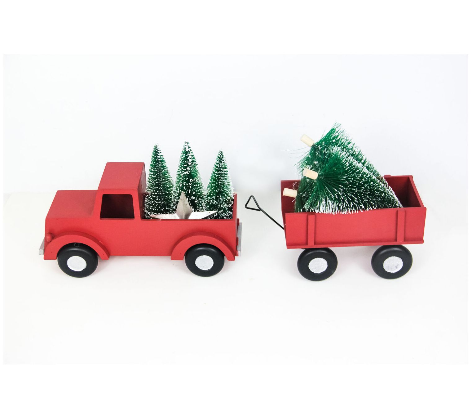 • Includes tobacco basket-top faux wreath, JOY block set, wall sign, plaid snowflake art, plaid reindeer art, and a truck and wagon set with bottle brush trees