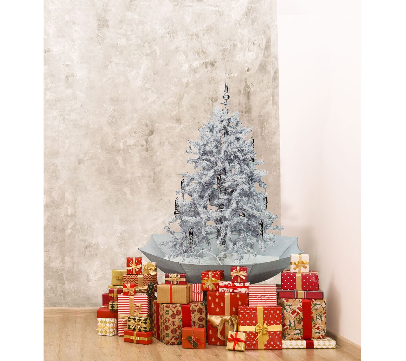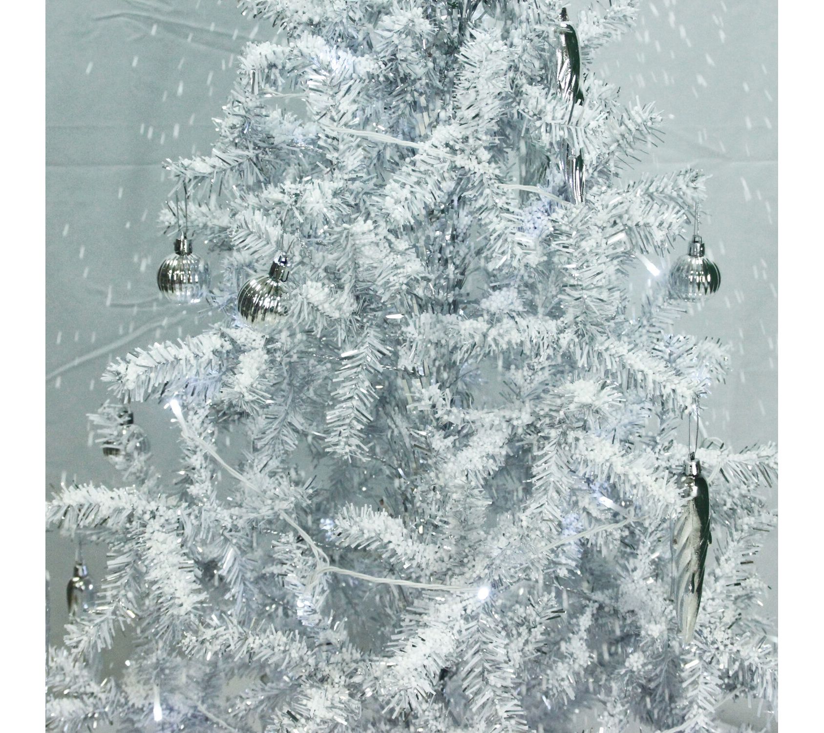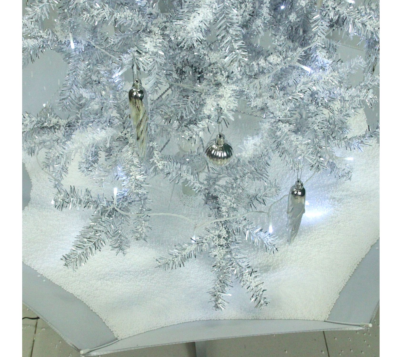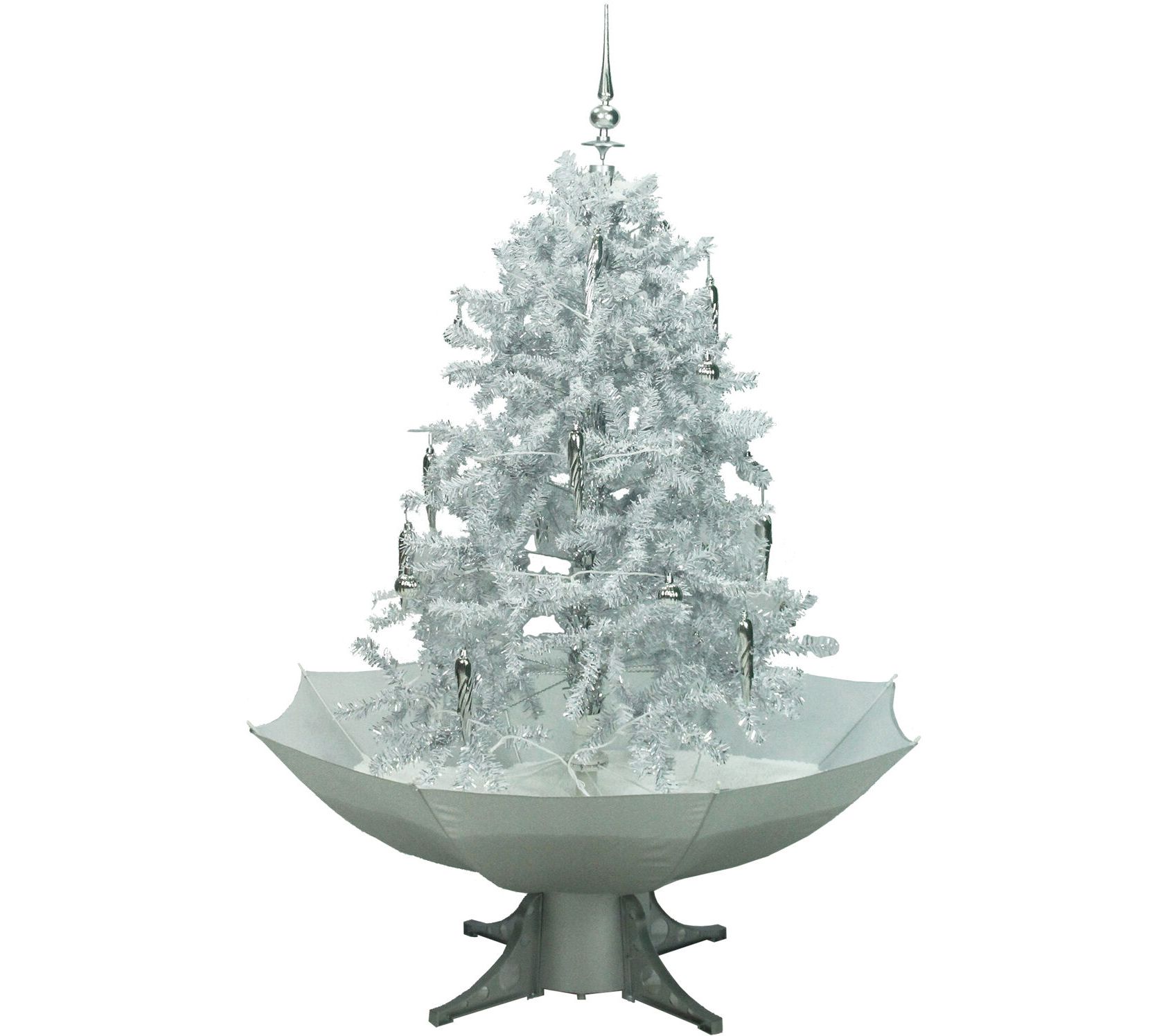 • Includes white tree, white umbrella base, LED string lighting, 24 tree decorations, silver ornaments, and finial tree-topper