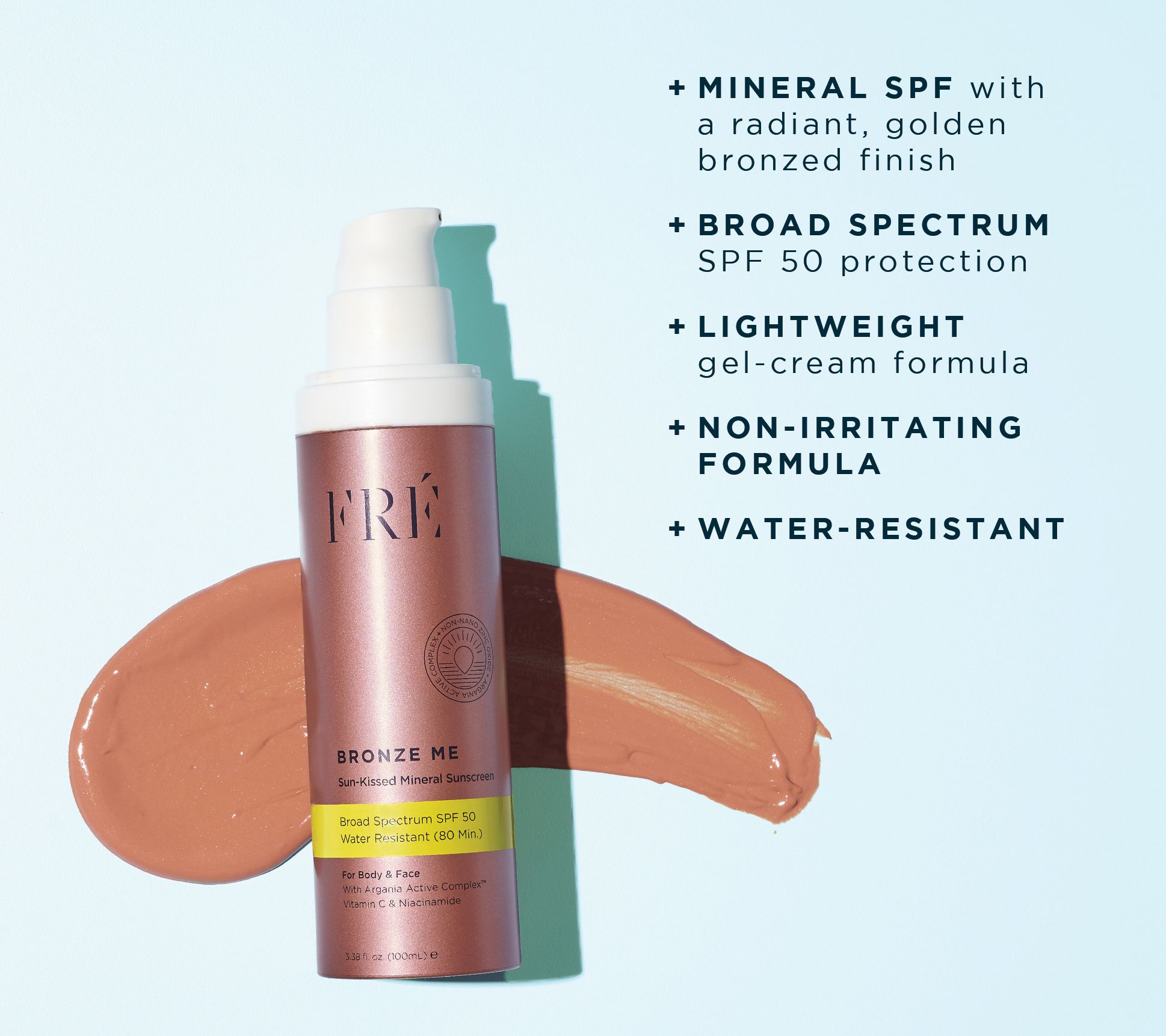 Bronze Me is a lightweight bronzing mineral SPF 50 for face and body that hydrates temporarily, improves the look of fine lines and wrinkles with continued use, and optimizes skin's moisture barrier.