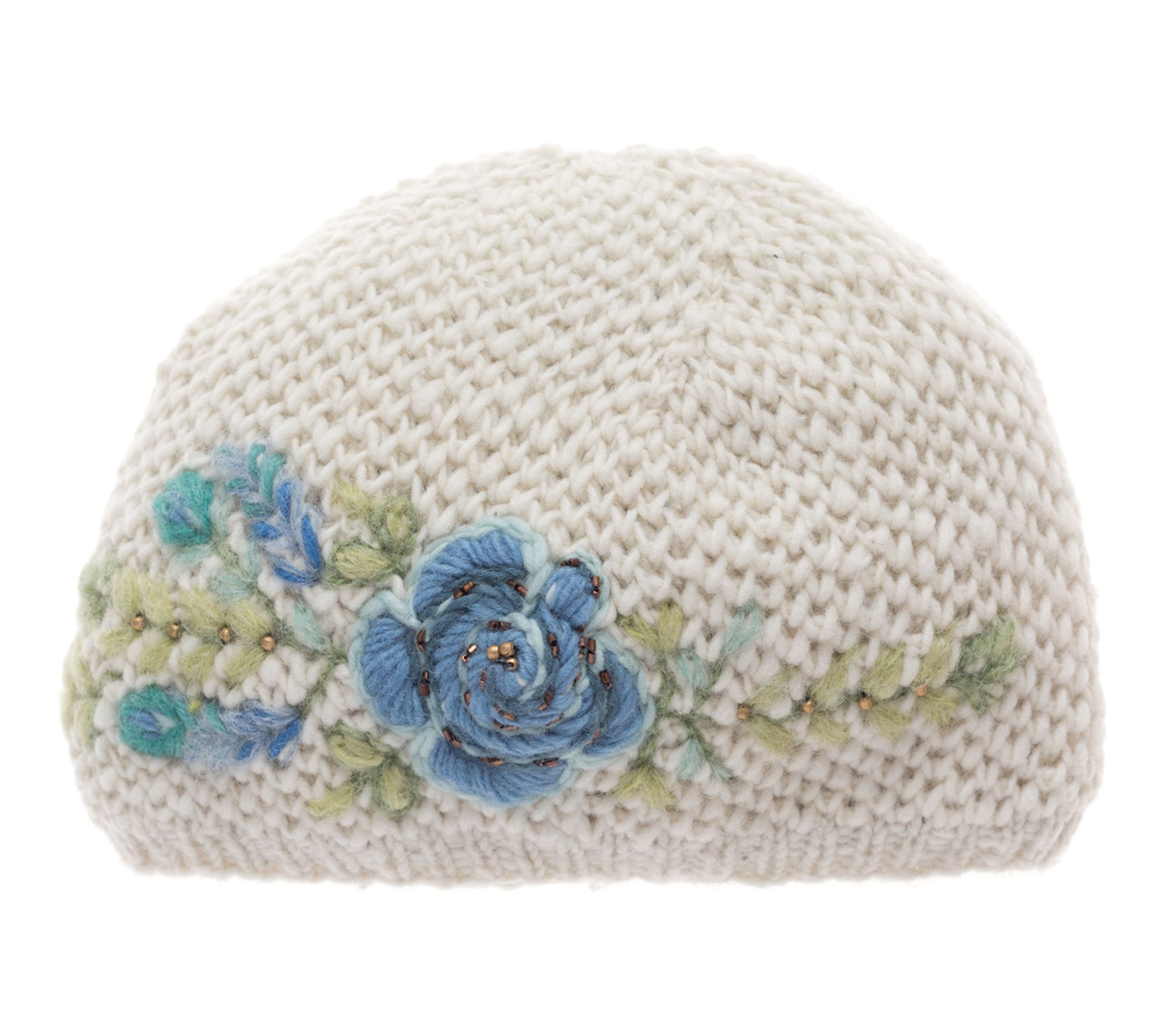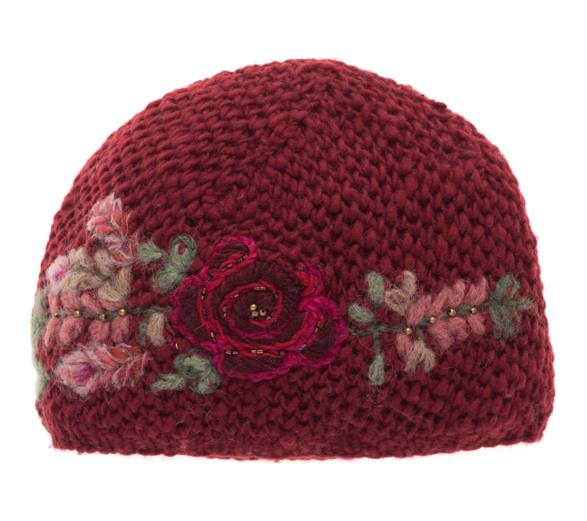 • Features: cloche style, waffle-like stitch, embroidered flowers, fleece-lined