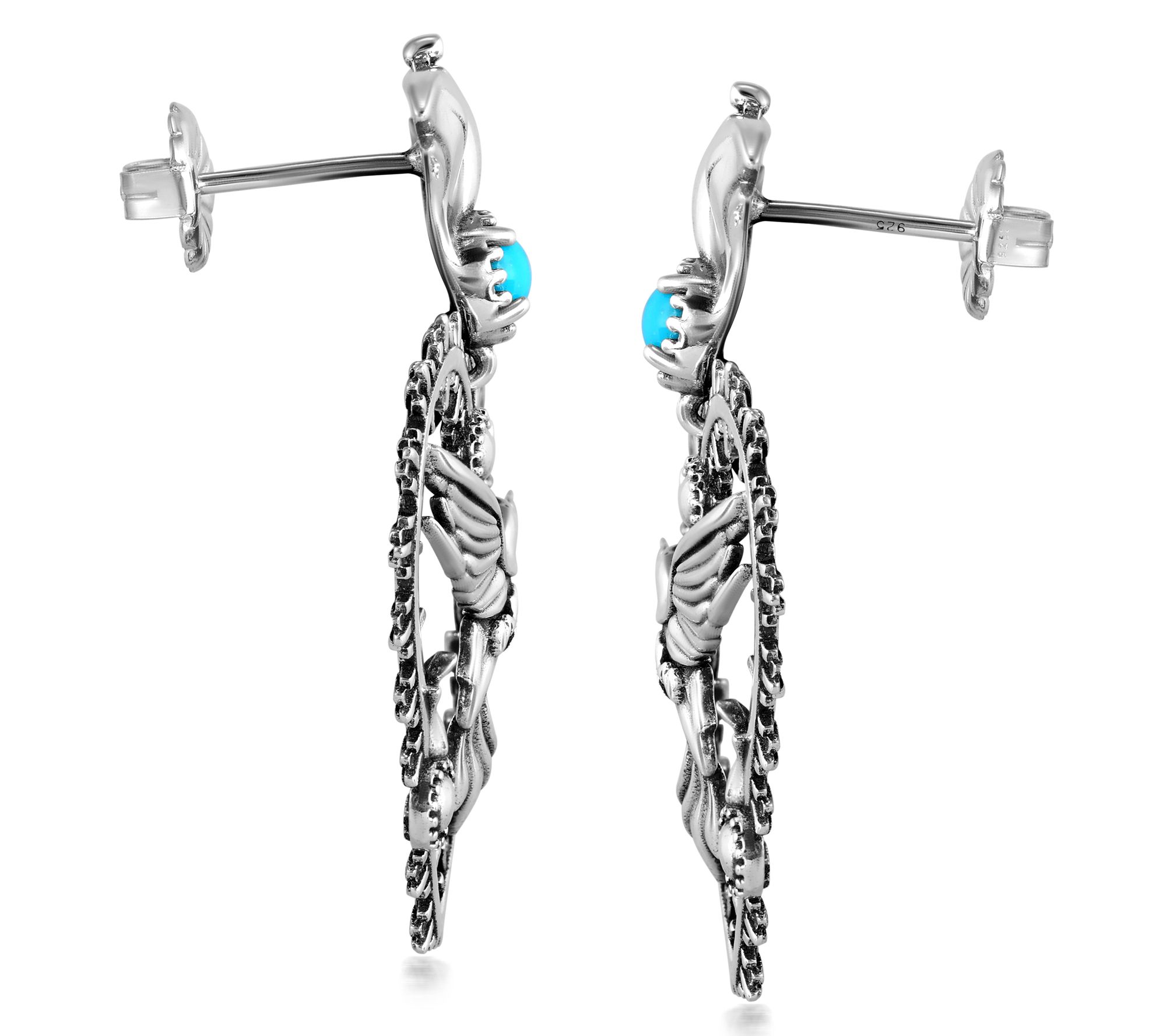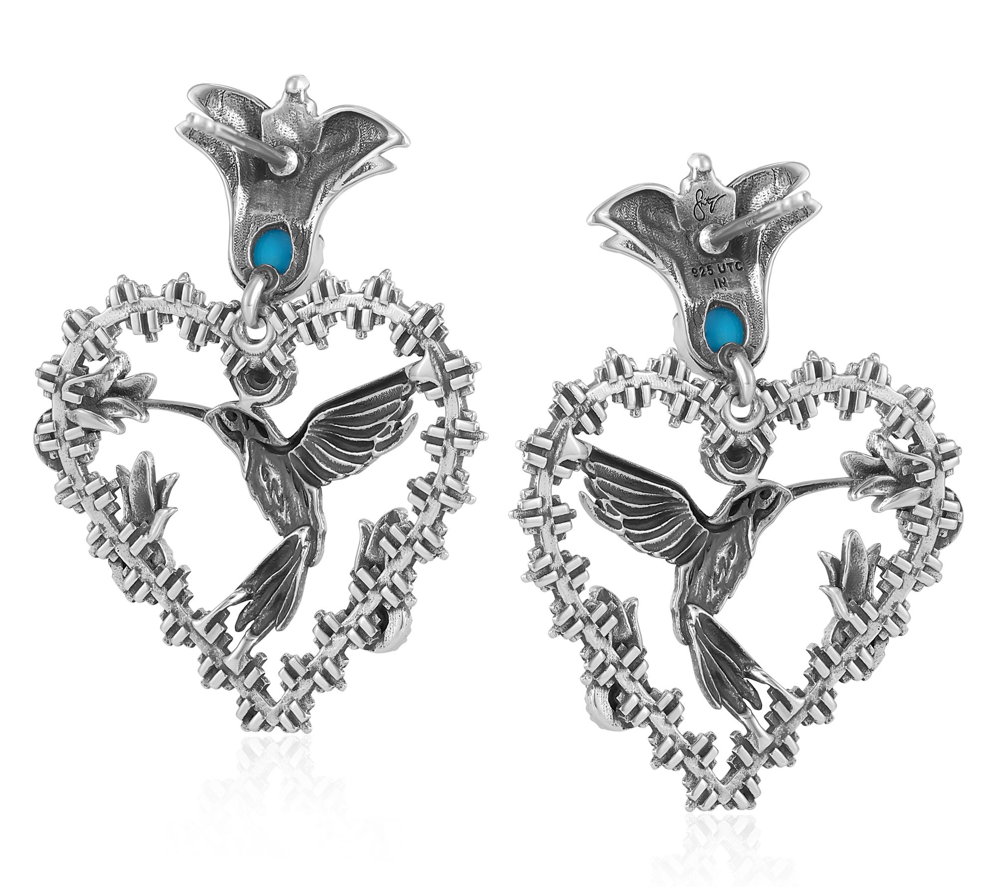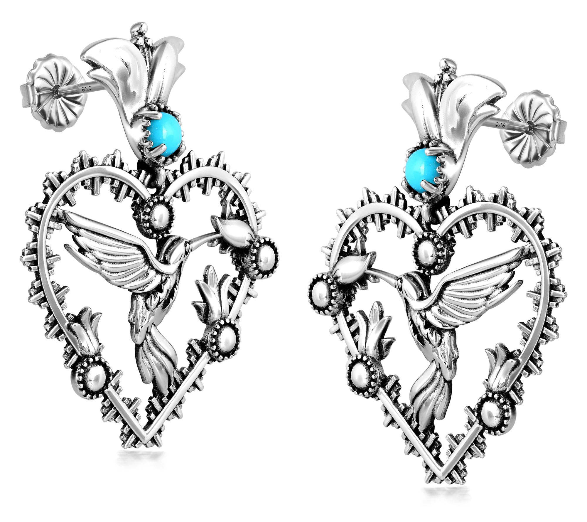 Every glance at these sterling silver earrings becomes a little celebration, blending heart-shaped design with a graceful hummingbird nestled inside. Thanks to a pop of round Sleeping Beauty turquoise cabochons, this pair brings color and warmth to everyday adventures or meaningful gatherings. From Fritz Casuse.