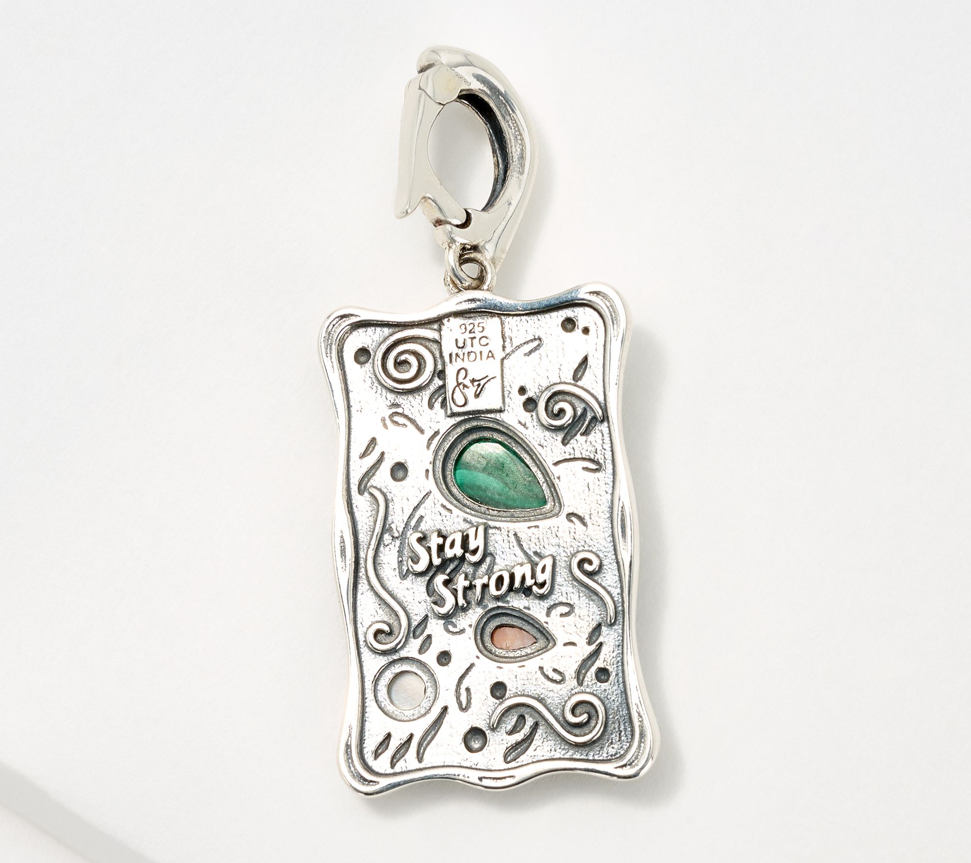 Combining coastal appeal and artistic craftsmanship, this extraordinary enhancer sets a serene scene with a mother and baby turtle. Their shells showcase gemstone cabochons as they swim along the beautifully detailed sterling silver sea.
