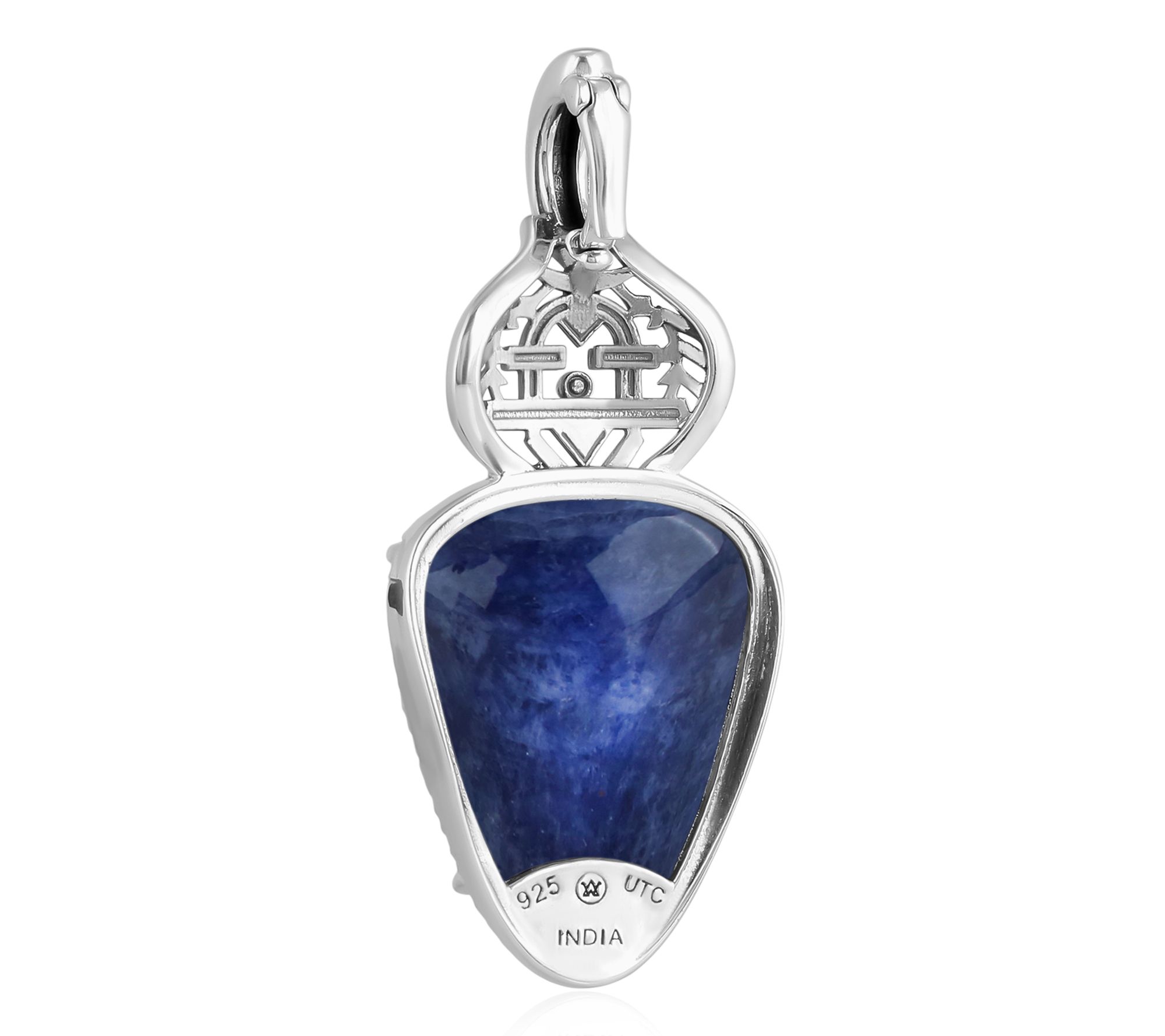 Fritz Casuse brings you a sterling silver enhancer featuring a beautifully rounded triangle-shaped gemstone cabochon set in a serrated prong setting. The Yeibichai design at the top adds a unique touch, while the snap hinge bail ensures it fits most chains and cords. From Fritz Casuse.
