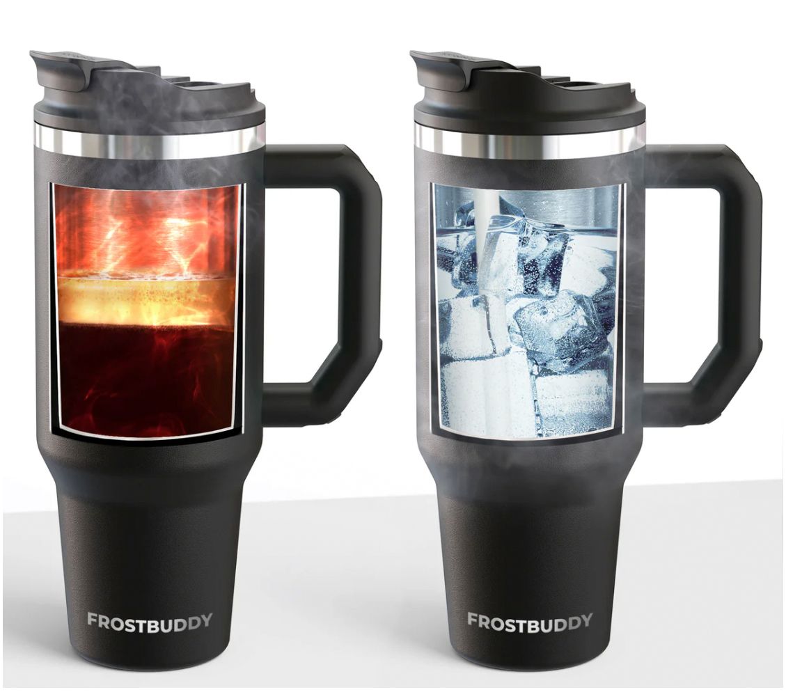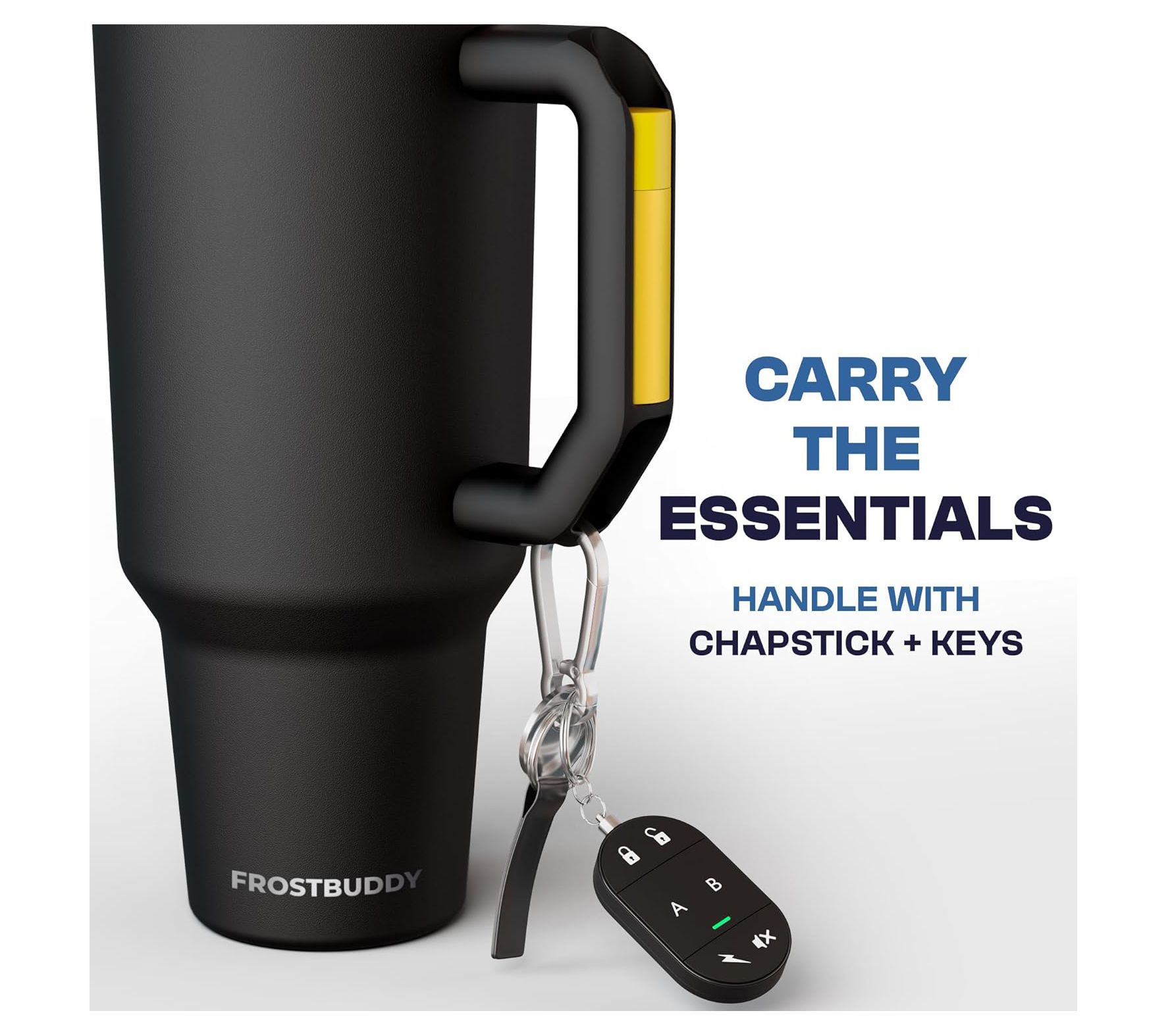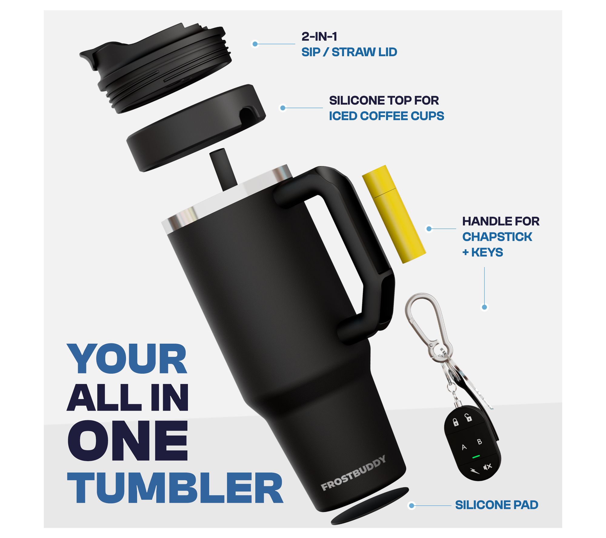 Hydration happiness? It's a thing with the Frost Buddy Thicc Buddy tumbler. Whether you're bringing along your favorite beverage from home or picking up a specialty drink when you're on the go, the clever design keeps your sips at just the right temperature. Fill it with a hot or cold beverage and use the flip-up straw, or replace the flip-straw lid with the silicone top and drop in a small, medium, or large to-go cup. It's built for it! (Can your current tumbler do that?) The handle includes a key ring and a lip balm holder ('cause lips need hydration, too), while the cup bottom fits easily into most vehicle cup holders. From Frost Buddy.