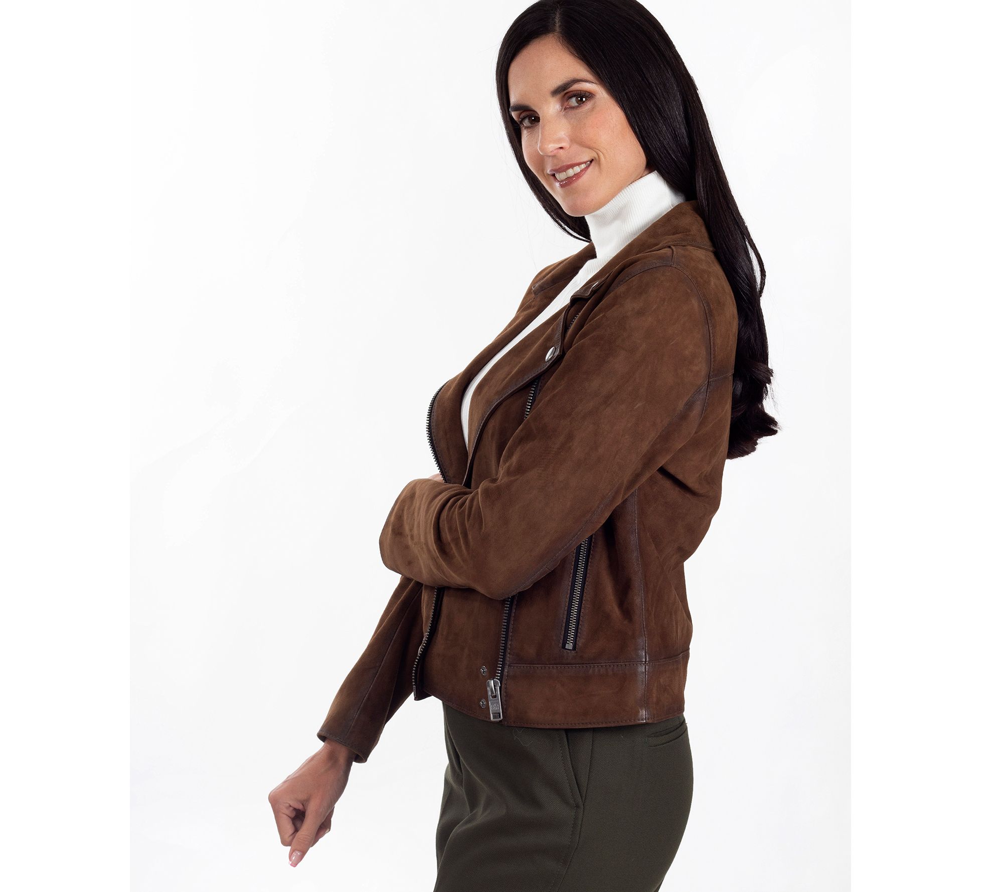 Soft suede lends luxurious comfort to this vintage-inspired biker jacket outfitted with zip pockets to secure your essentials. From Frye.