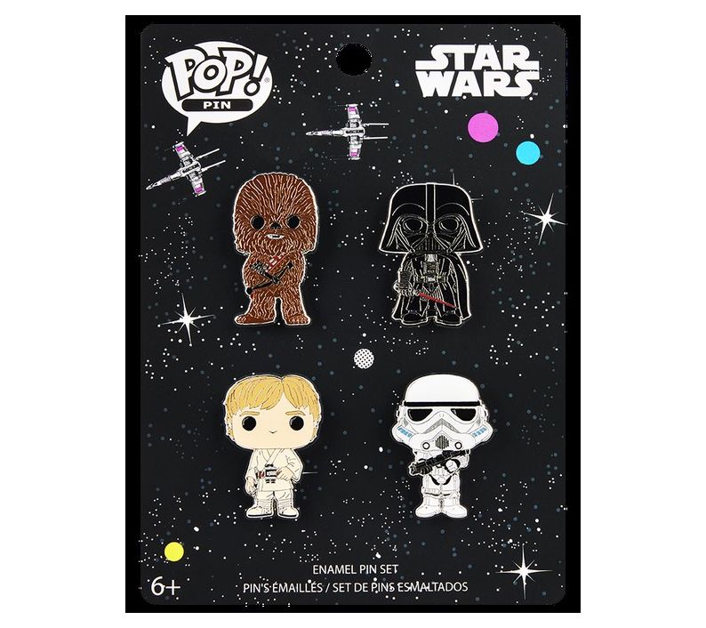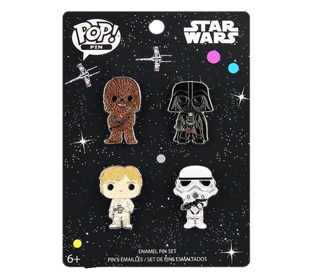 • Includes Luke Skywalker (Young) pin, Chewbacca pin, Darth Vader pin, and Imperial Stormtrooper pin