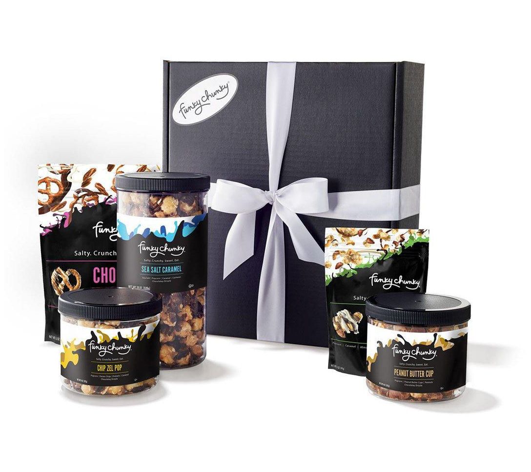 Up the ante on gift-giving with this incredibly delicious assortment of Funky Chunky popcorn. This sweet, salty, and savory bundle of popcorn treats is sure to be at the top of the best-gift-ever list. From Funky Chunky.