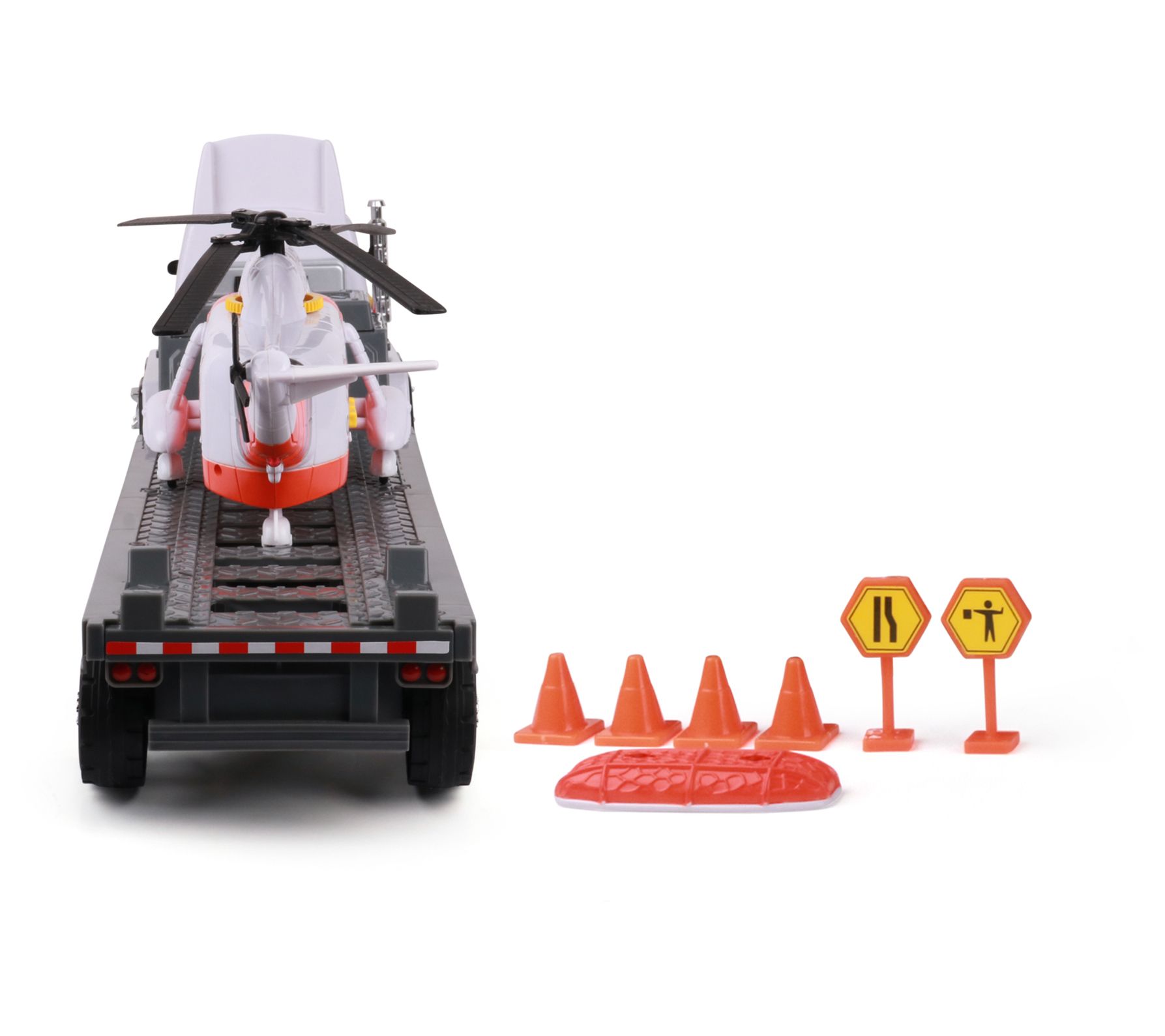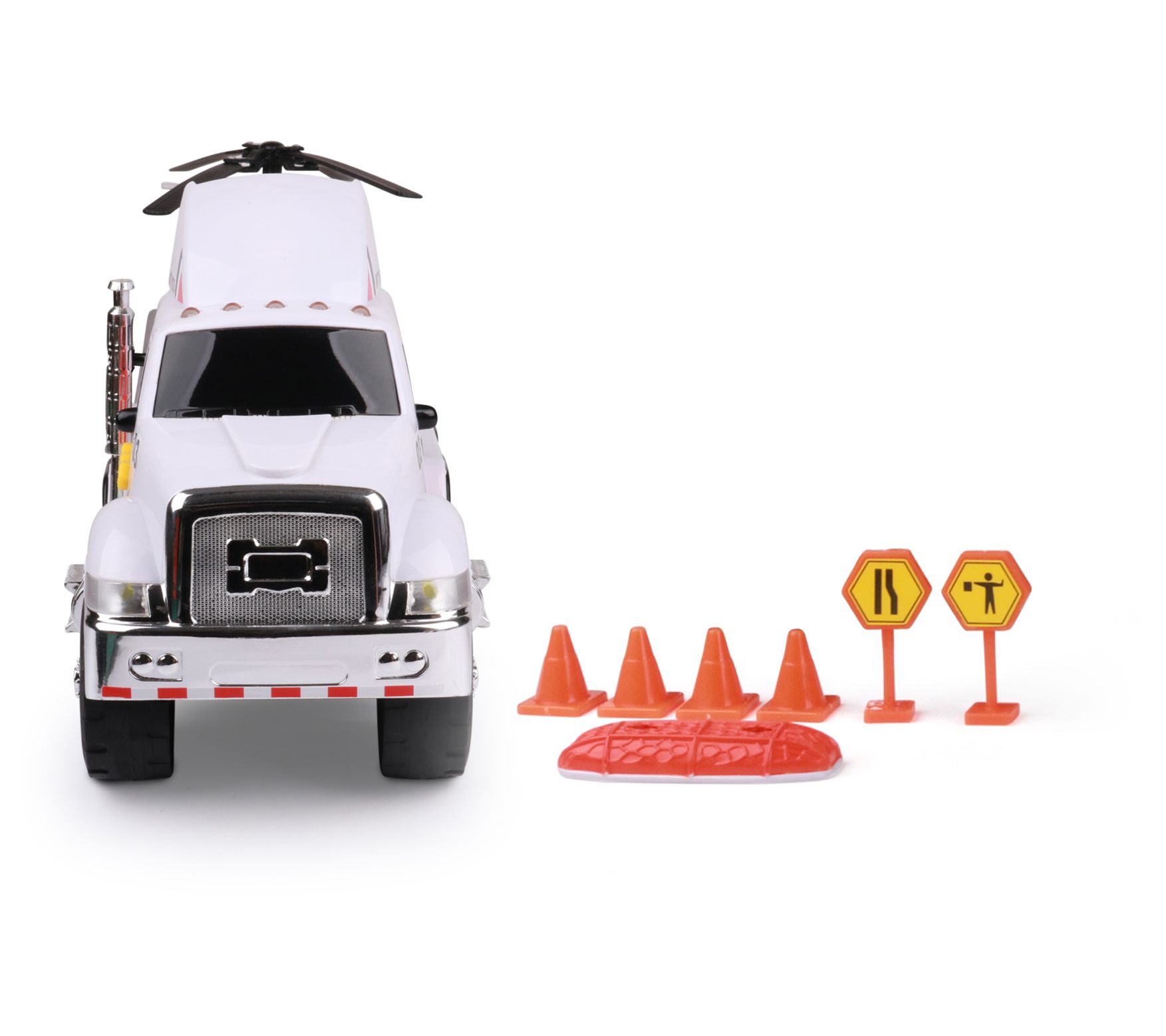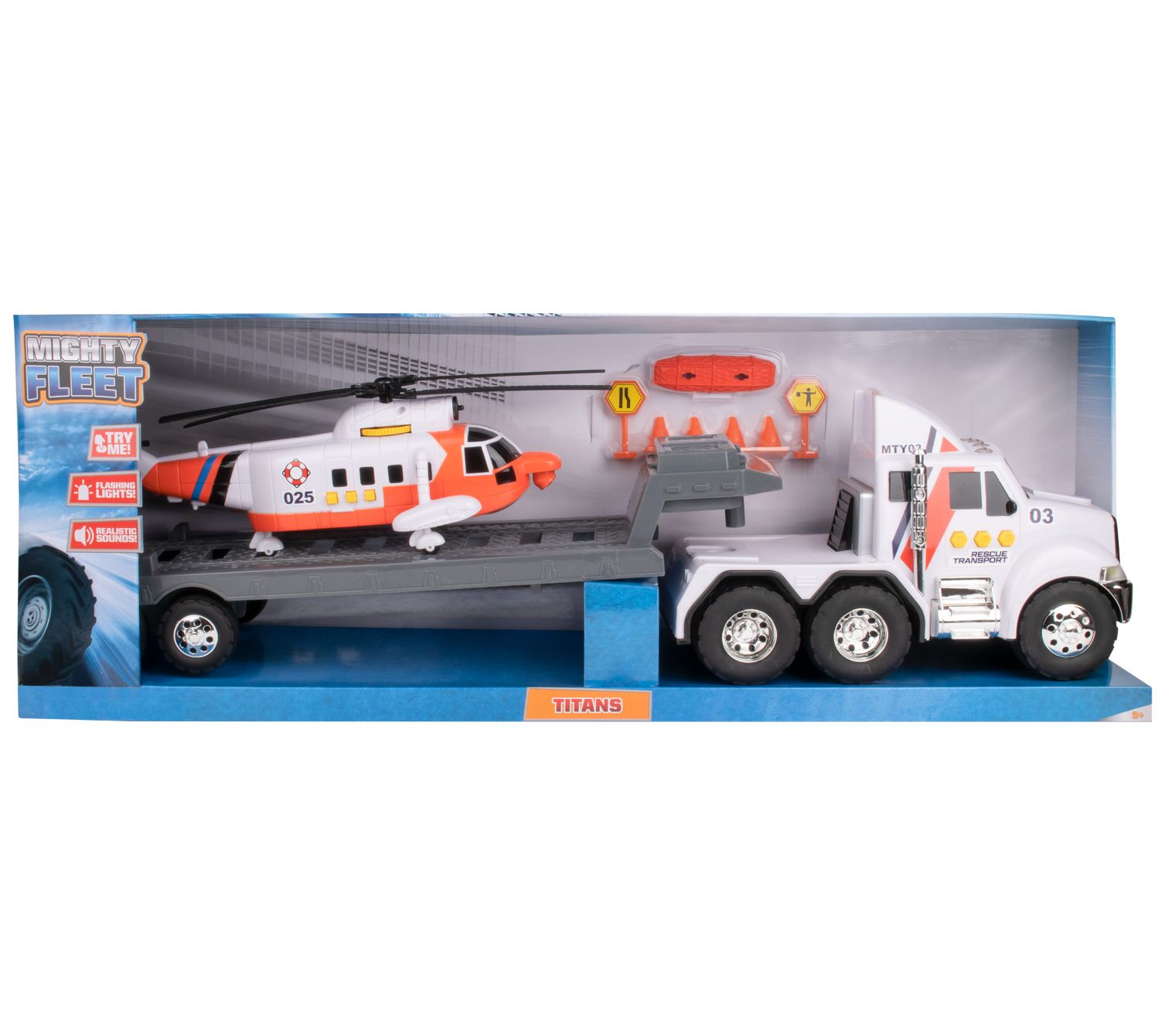 • Includes Mighty Fleet Titans Flatbed Truck With Helicopter, road signs, cones, and five AA batteries