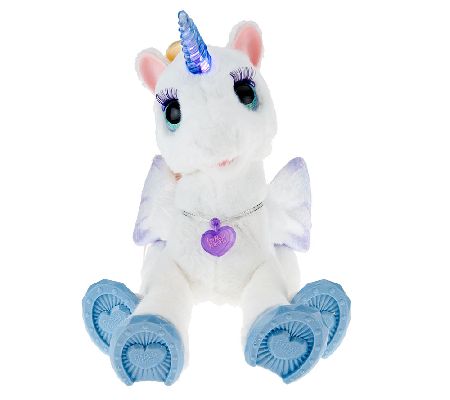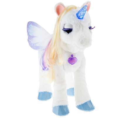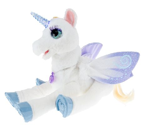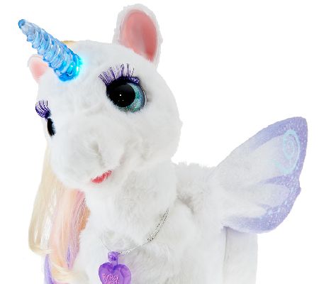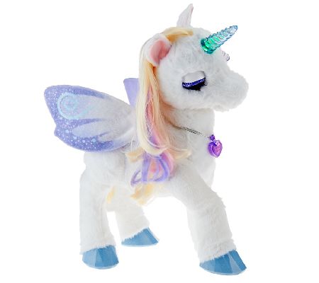 An enchanting friendship. Delight your little one with StarLily My Magical Unicorn, a fascinating find from FurReal Friends by Hasbro. This majestic creature is voice and motion activated, with more than 100 sound and motion combinations--moving her head and hoof, lighting up her horn, fluttering her wings, and even sleeping and snoring when left alone. From Hasbro.