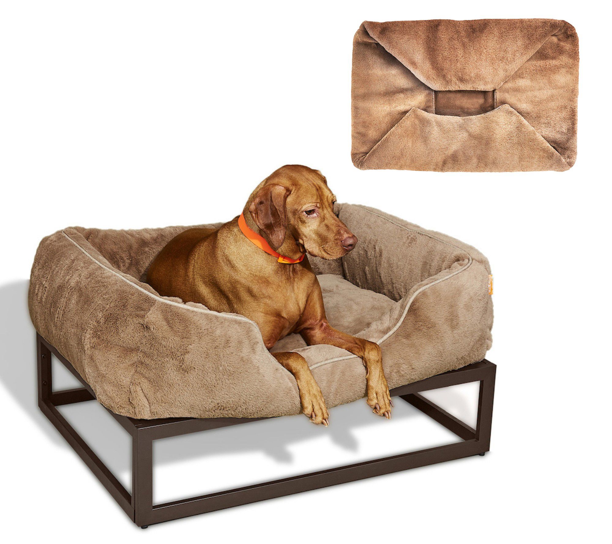 Give your dog the luxury and comfort it deserves with this elevated plus dog bed. Featuring an ultra-plush bolster connected atop a chew-proof metal frame, this bed offers support and style. The raised design allows airflow and a great window view for your pup. From Fuzi Pets.