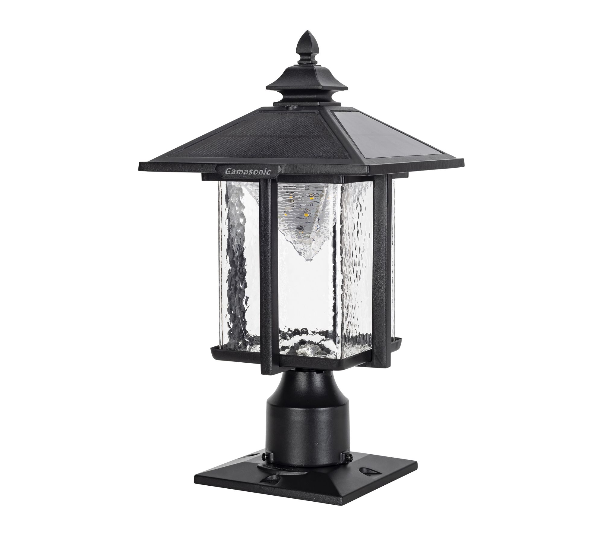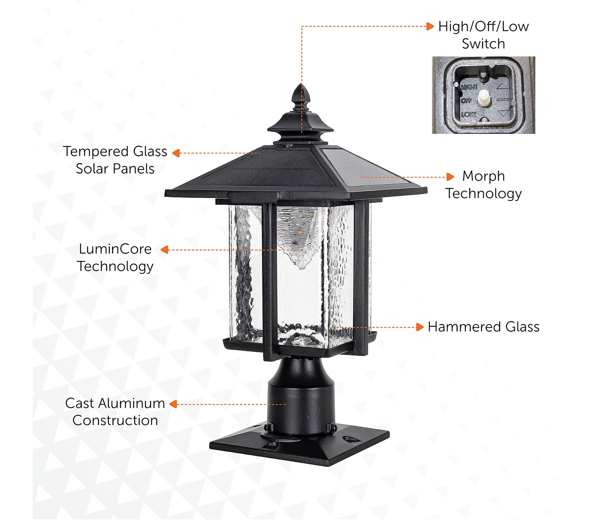 • Includes finial, solar lamp top, rechargeable lithium battery, fixture, pier base, and hardware
