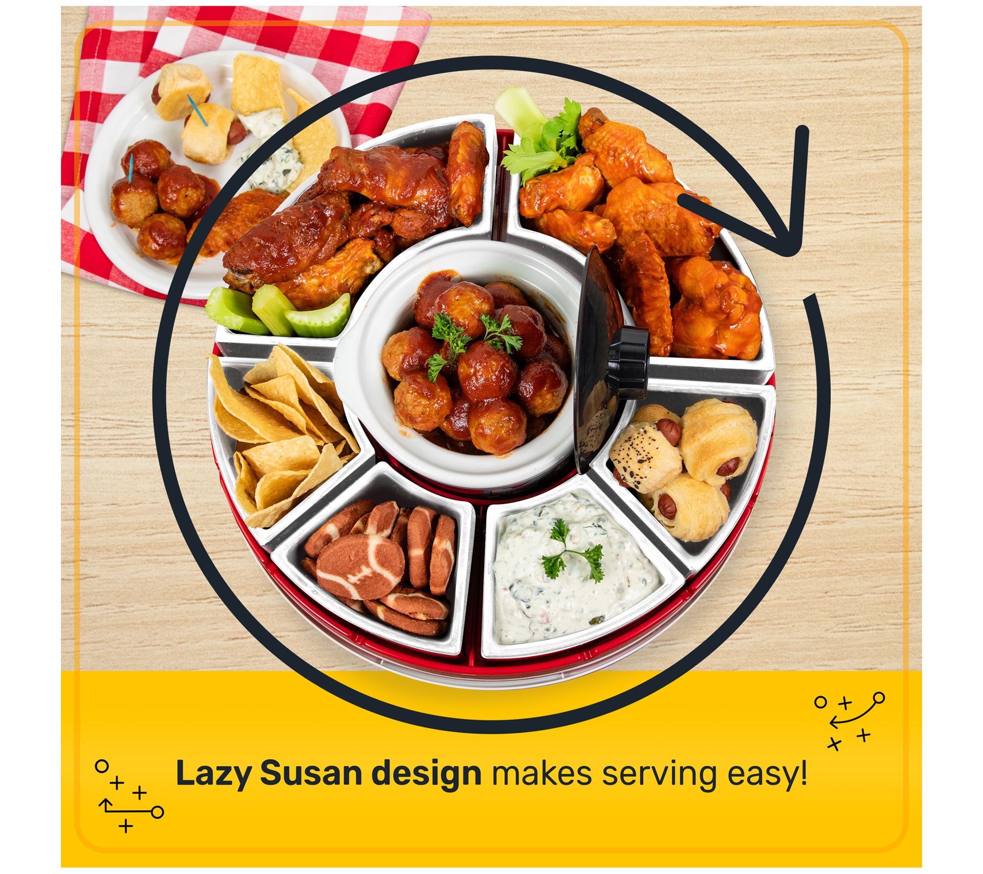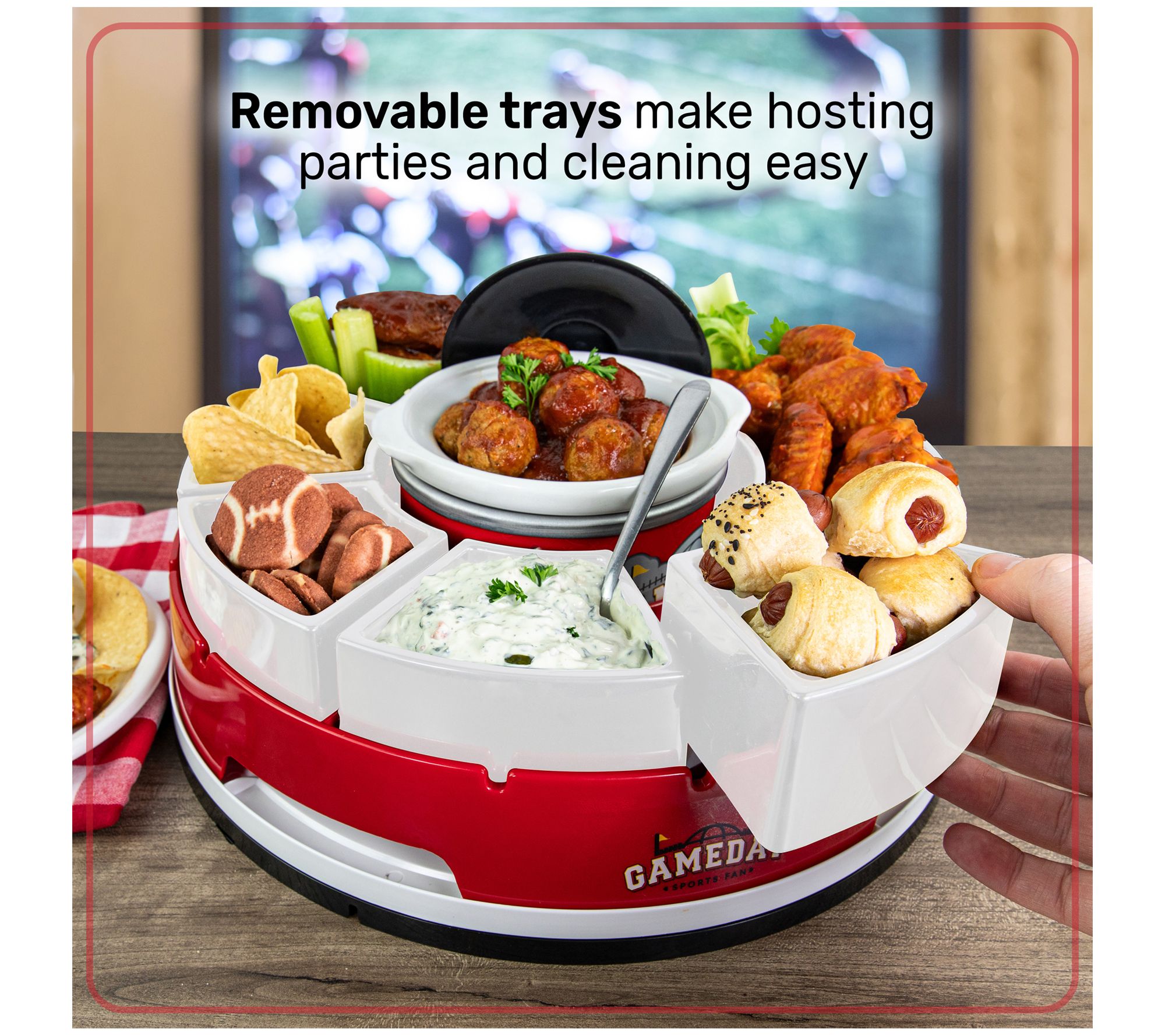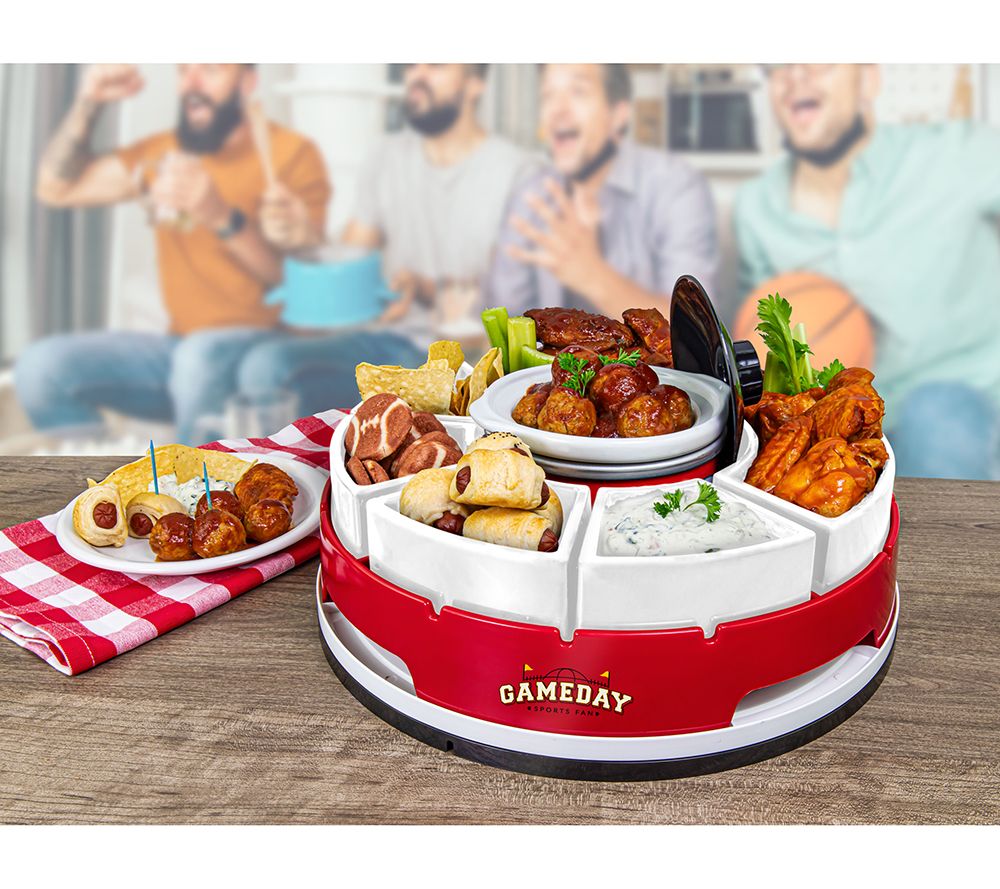 Gather your friends and family for a memorable game day experience with this lazy Susan appetizer server, complete with a warming pot. This innovative server keeps your favorite dips heated to perfection while offering a variety of snacks on the rotating trays. From spicy wings to creamy queso, this server is your ticket to hosting the ultimate watch party. From Game Day.