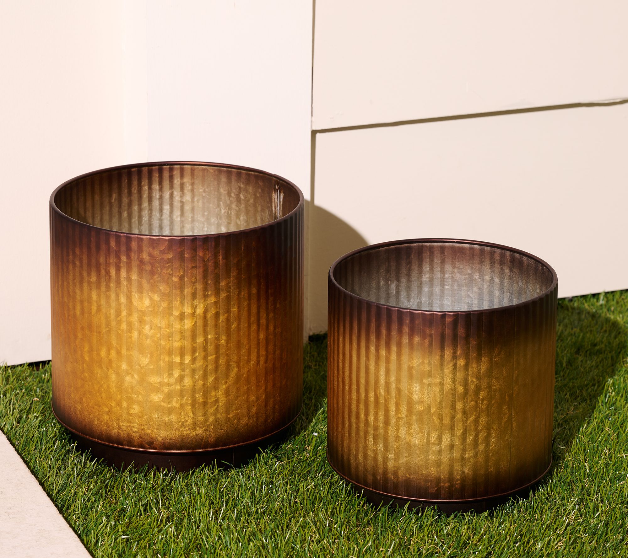 Arrange your favorite blooms or vibrant greenery in these stylish metal planters with ridged detailing for a fresh look on your porch or patio. Their sturdy, hand-finished design stands up beautifully to changing weather while bringing a decorative accent to any outdoor space. From Garden Reflections.