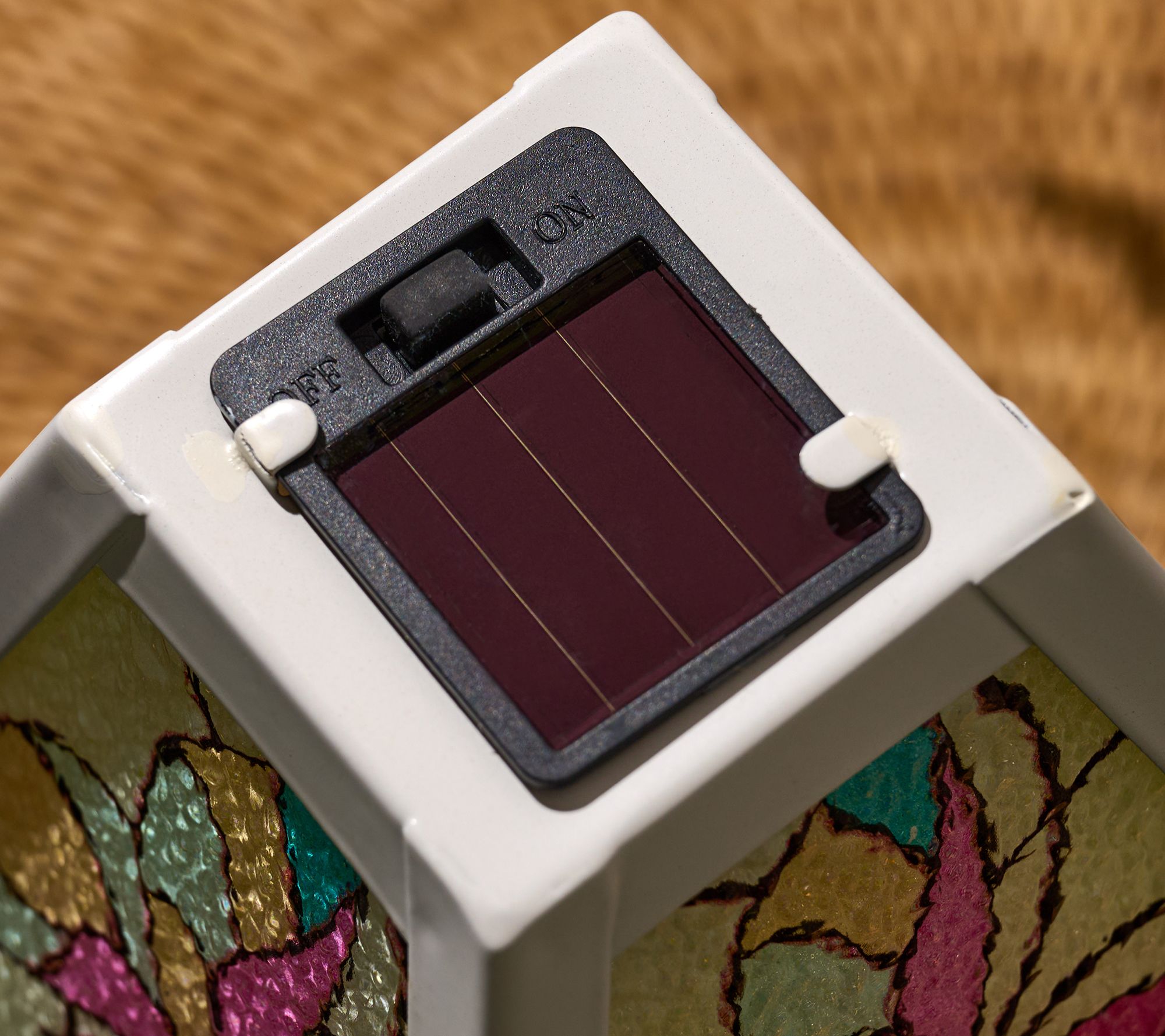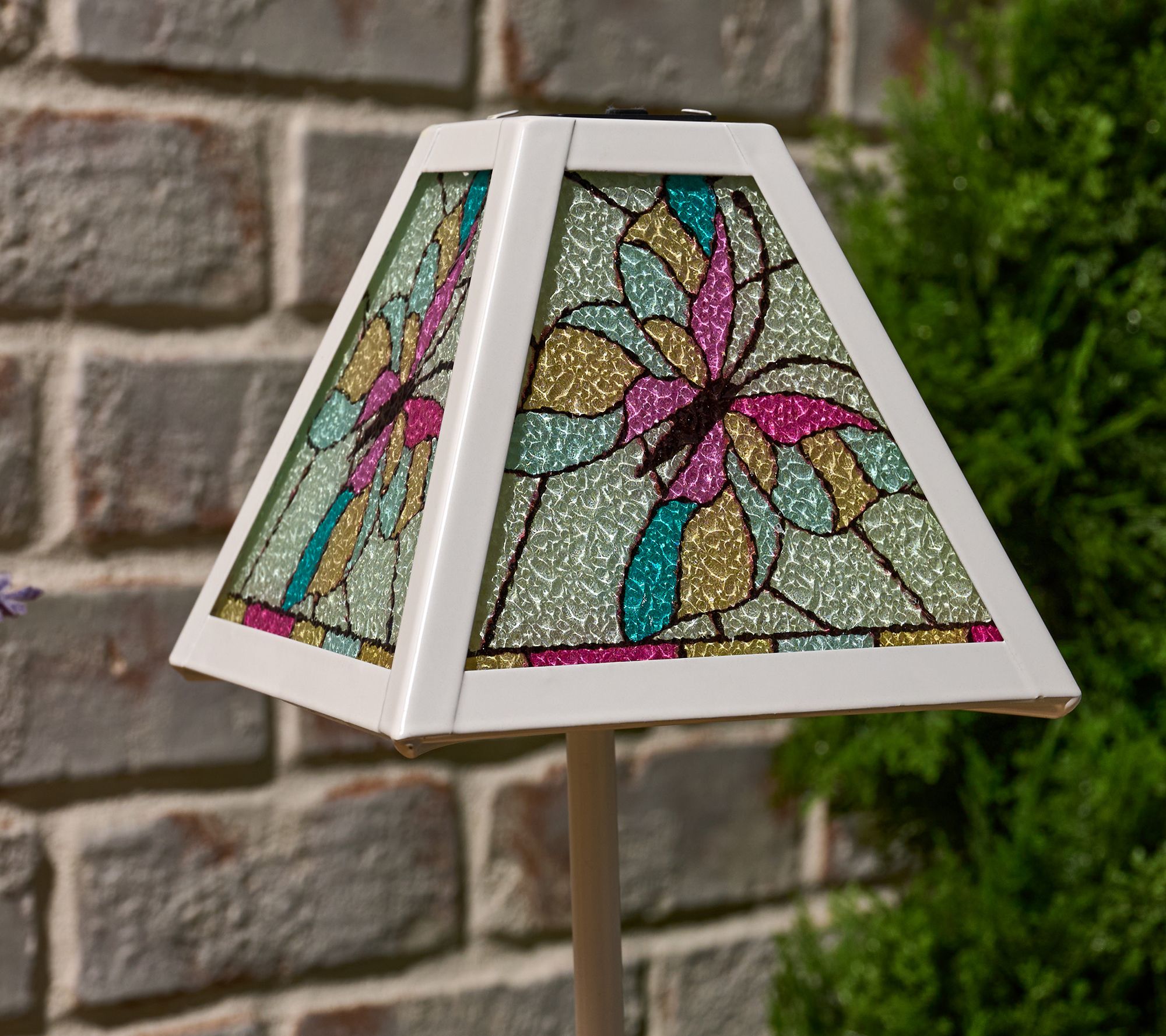 Create an inviting outdoor atmosphere with this solar-powered faux stained glass table lamp. Perfect for your porch or patio, it charges during the day and lights up brilliantly at dusk. From Garden Reflections.