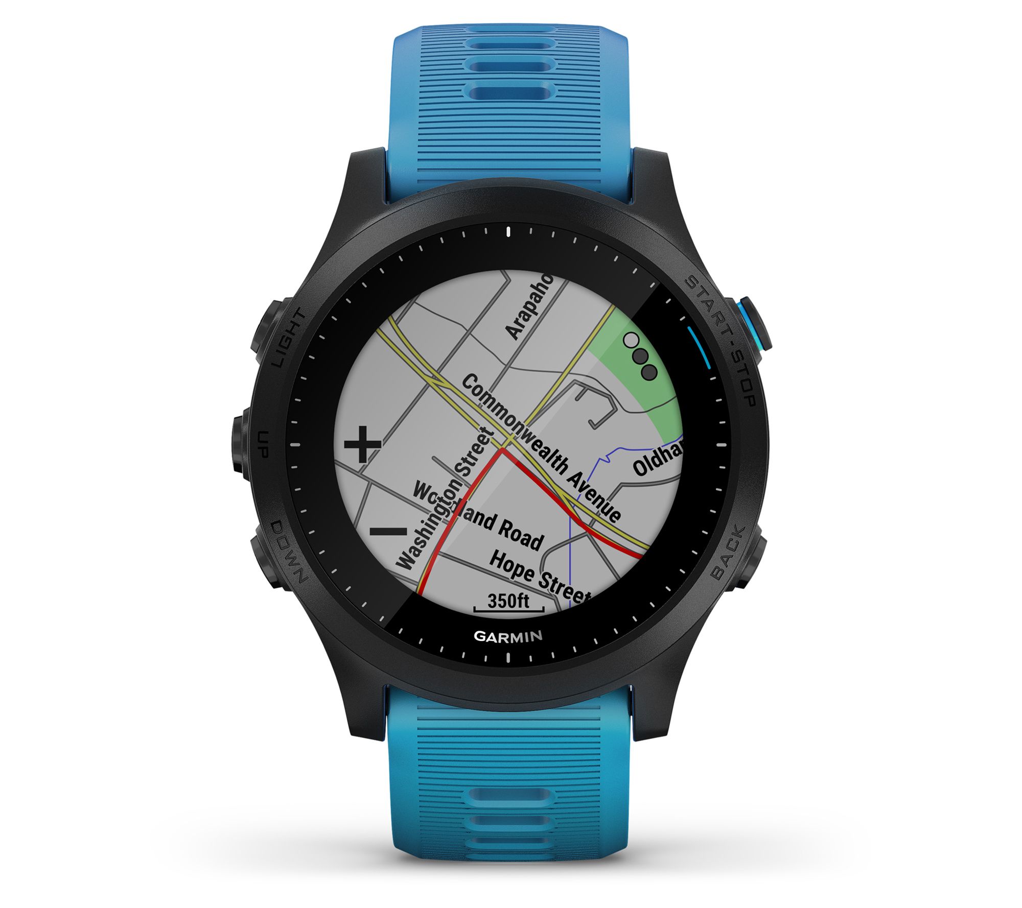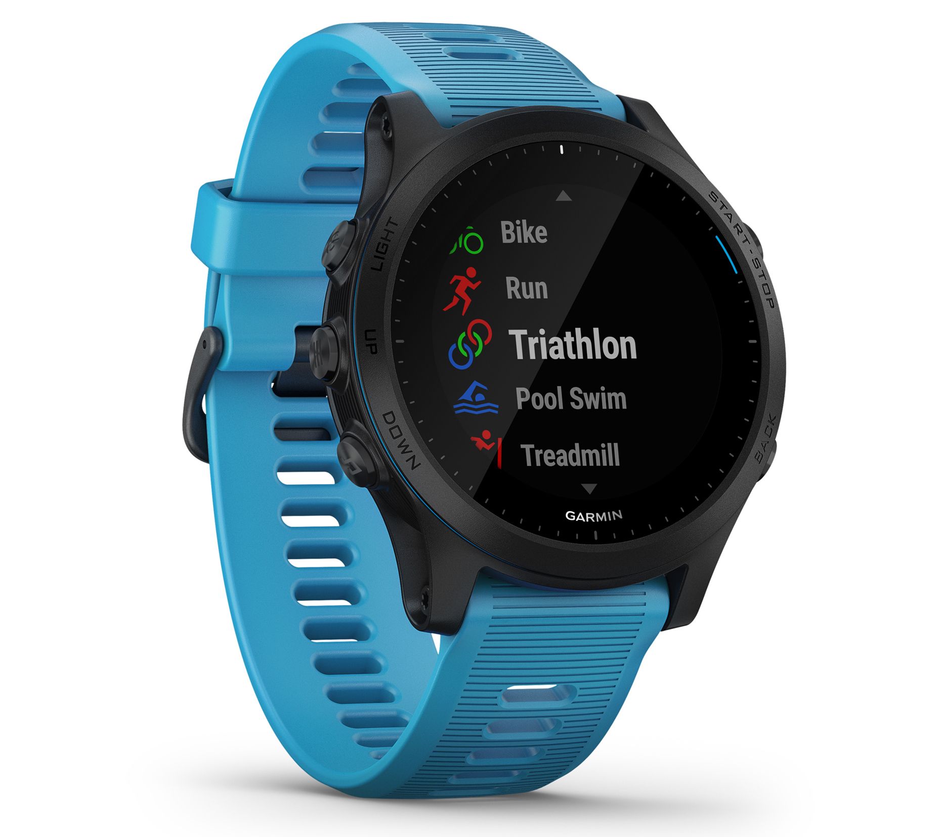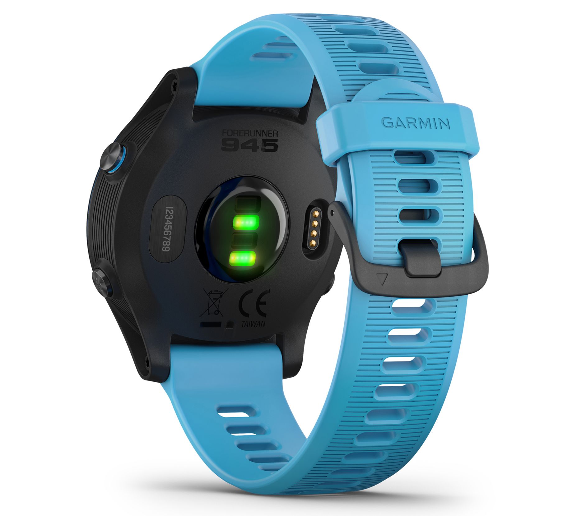 Includes Forerunner 945 GPS smartwatch, charging cable, extra black band, HRM-Tri monitor, HRM-Swim monitor, quick release kit