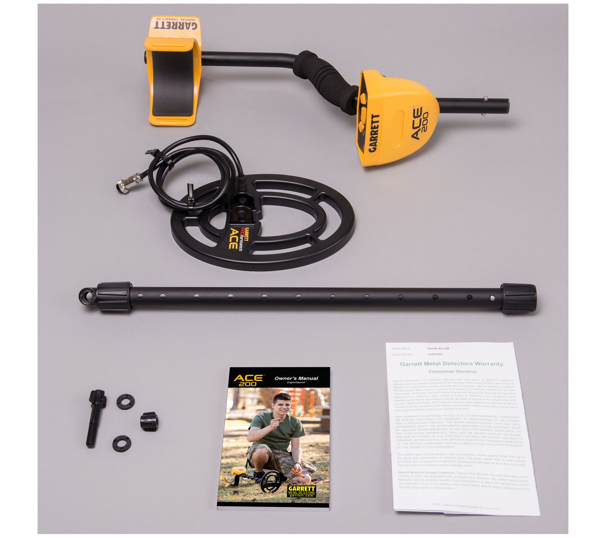 • Includes ACE 200 metal detector with four AA batteries, and documentation