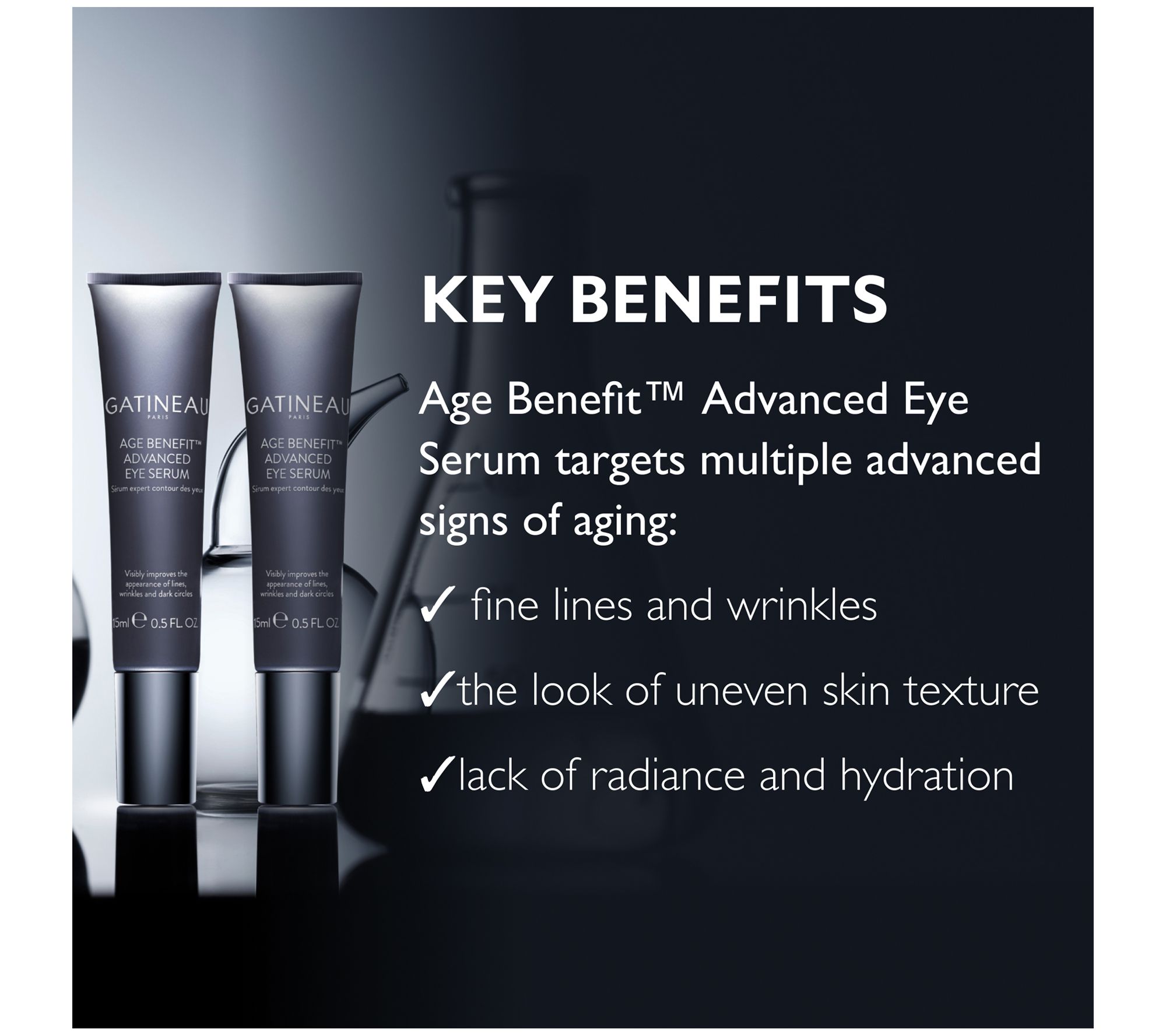 Gatineau Age Benefit Advanced Eye Serum targets multiple advanced signs of aging: fine lines and wrinkles, the look of uneven skin texture, and lack of radiance and hydration. Formulated with hydrating hyaluronic spheres, humectants, and antioxidants, the serum contains a film-former that temporarily tightens the look of the eye area. Plus, the serum is enhanced with a stainless steel applicator that provides a cool sensation to the skin.