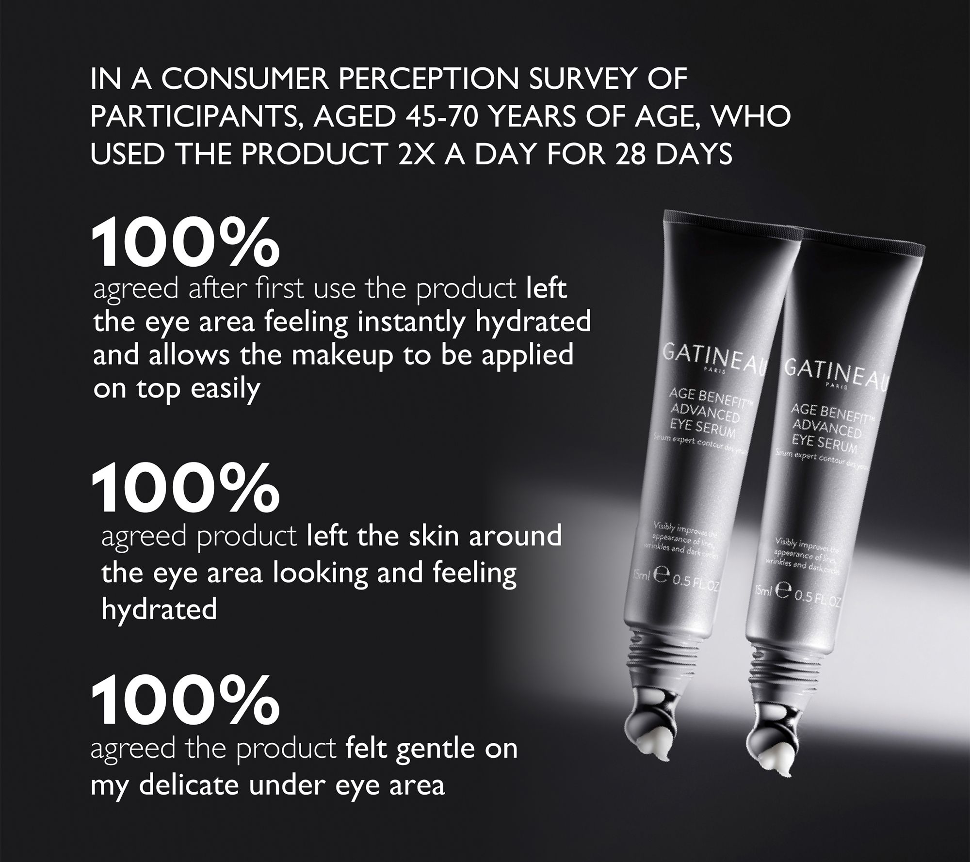 In an instrumental test of participants, aged 45 to 70 years of age, who used the product twice: -- demonstrated an improvement in the look of crows feet wrinkles at 14 and 28 days -- demonstrated an improvement in the look of skin smoothness in 14 and 28 days